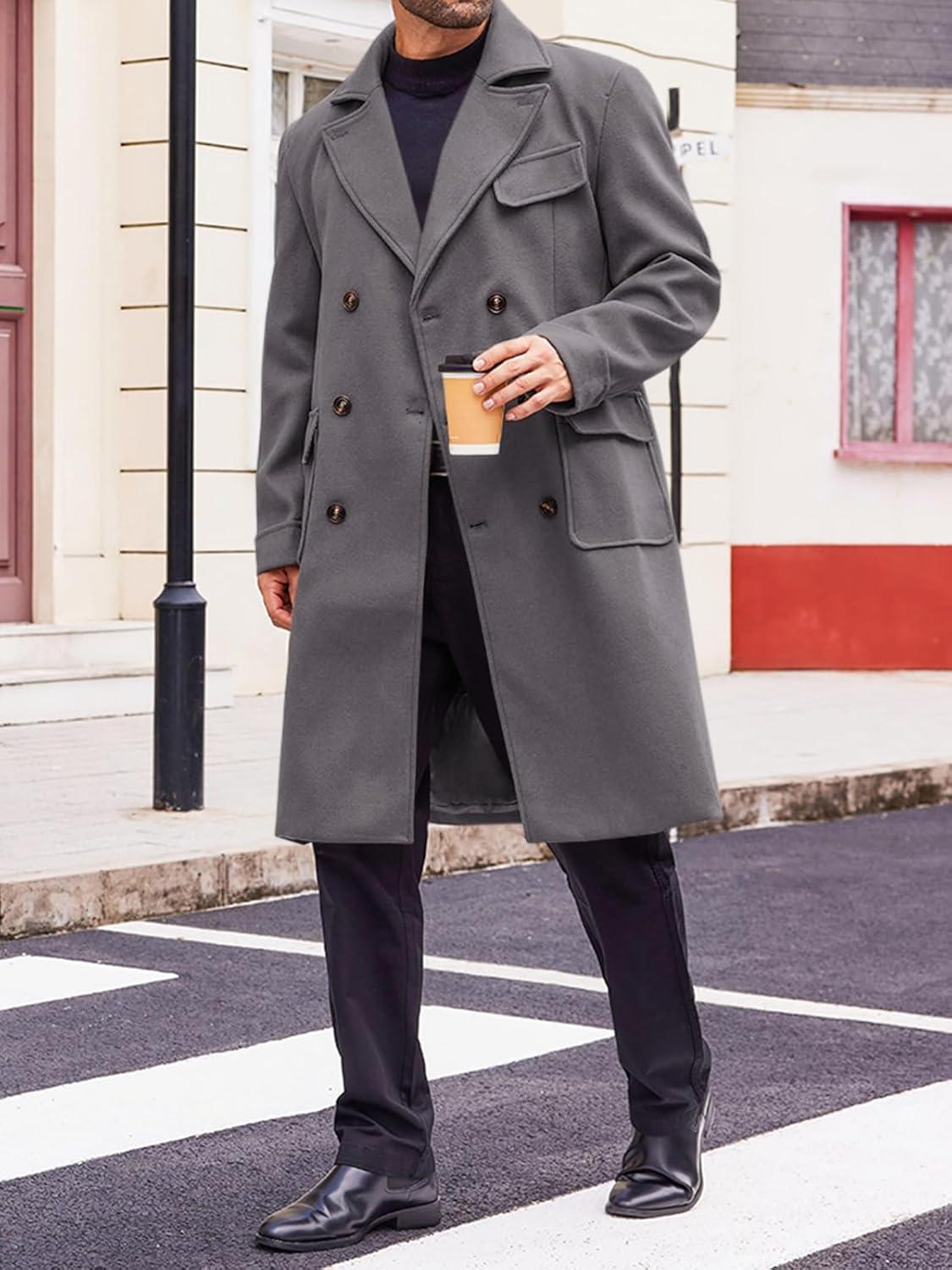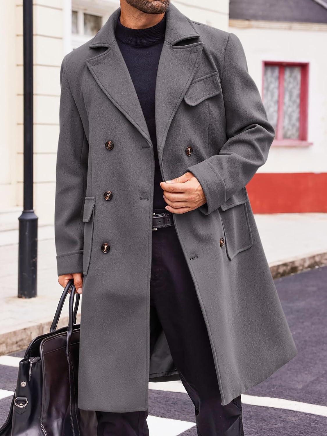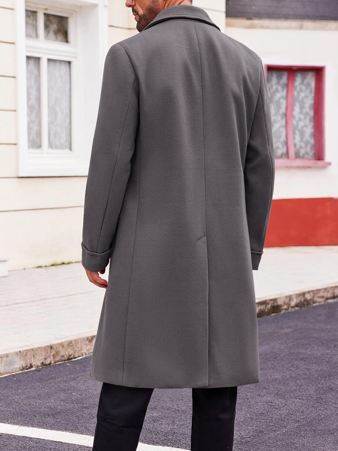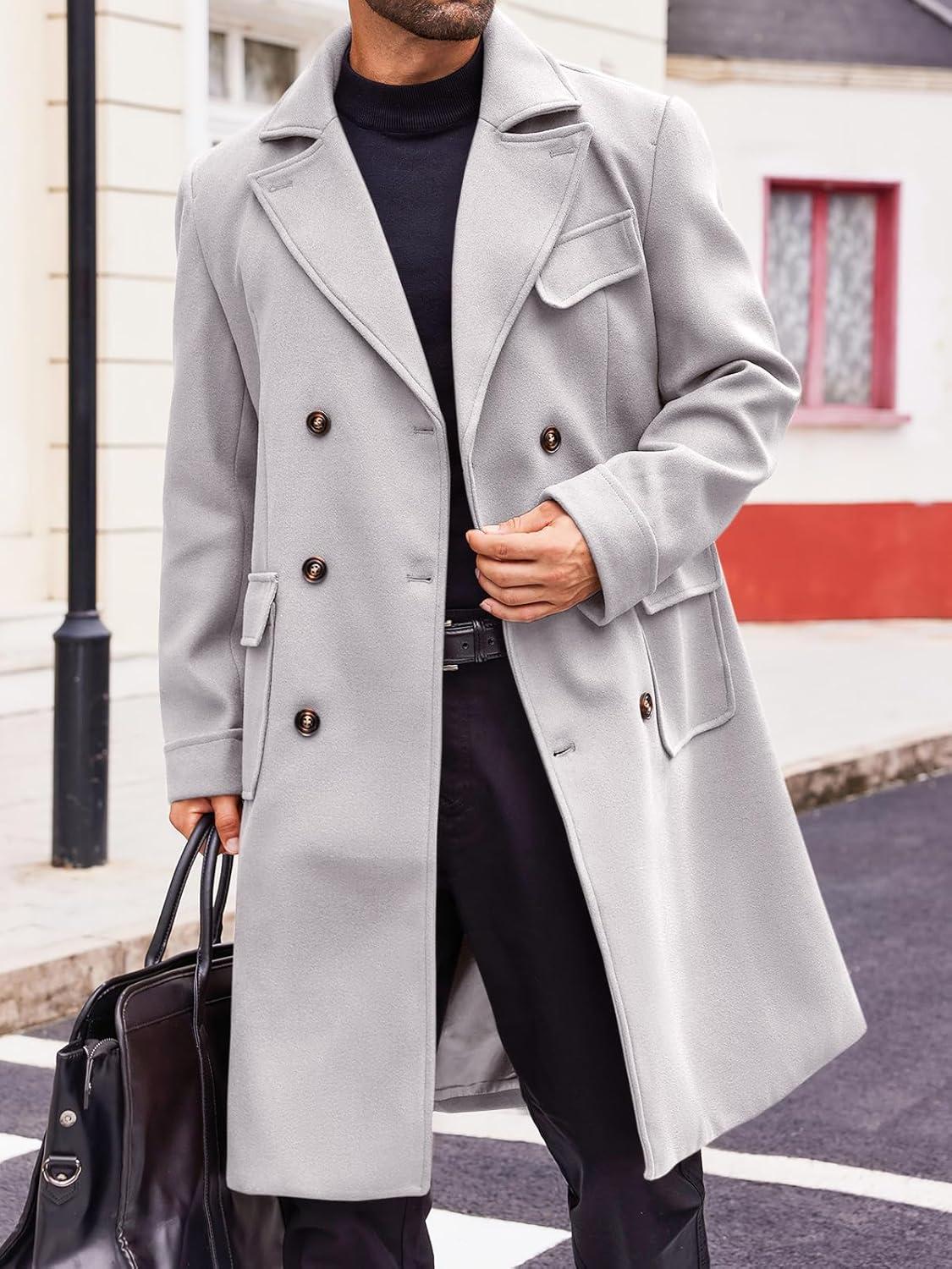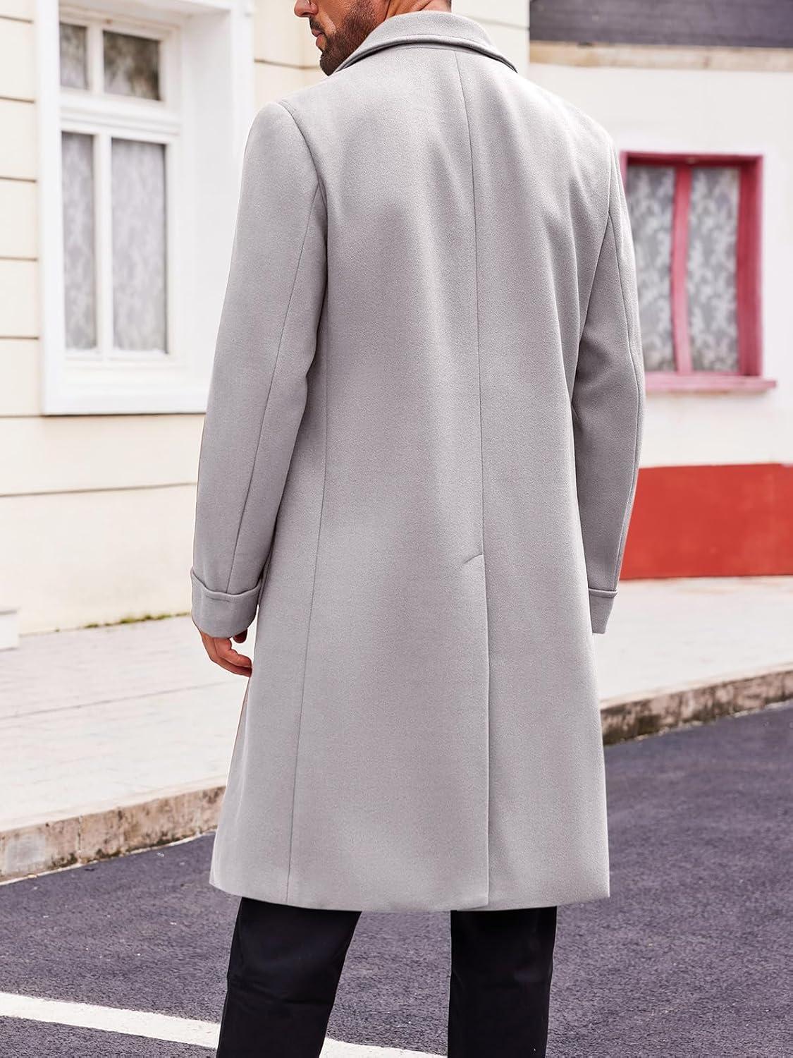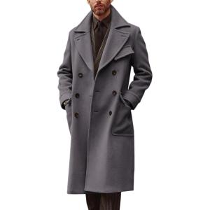 Runcati Mens Trench Coat Notch Lapel Slim Fit Double Breasted Long Pea Coat Winter Warm Overcoat(Gray)