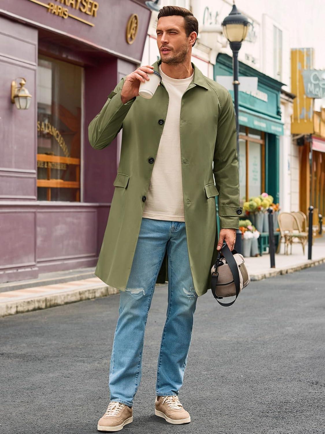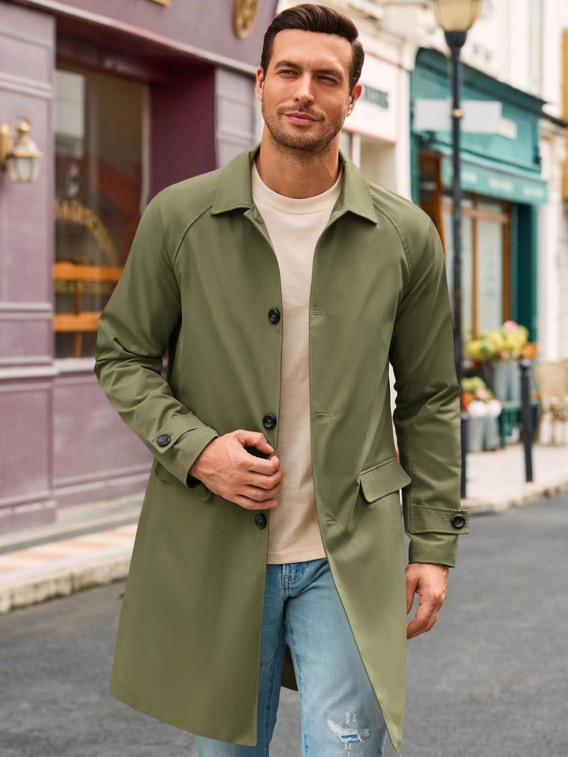 Runcati Mens Trench Coat Slim Fit Single Breasted Long Windbreaker Jacket Classic Lapel Casual Overcoat(Army Green)