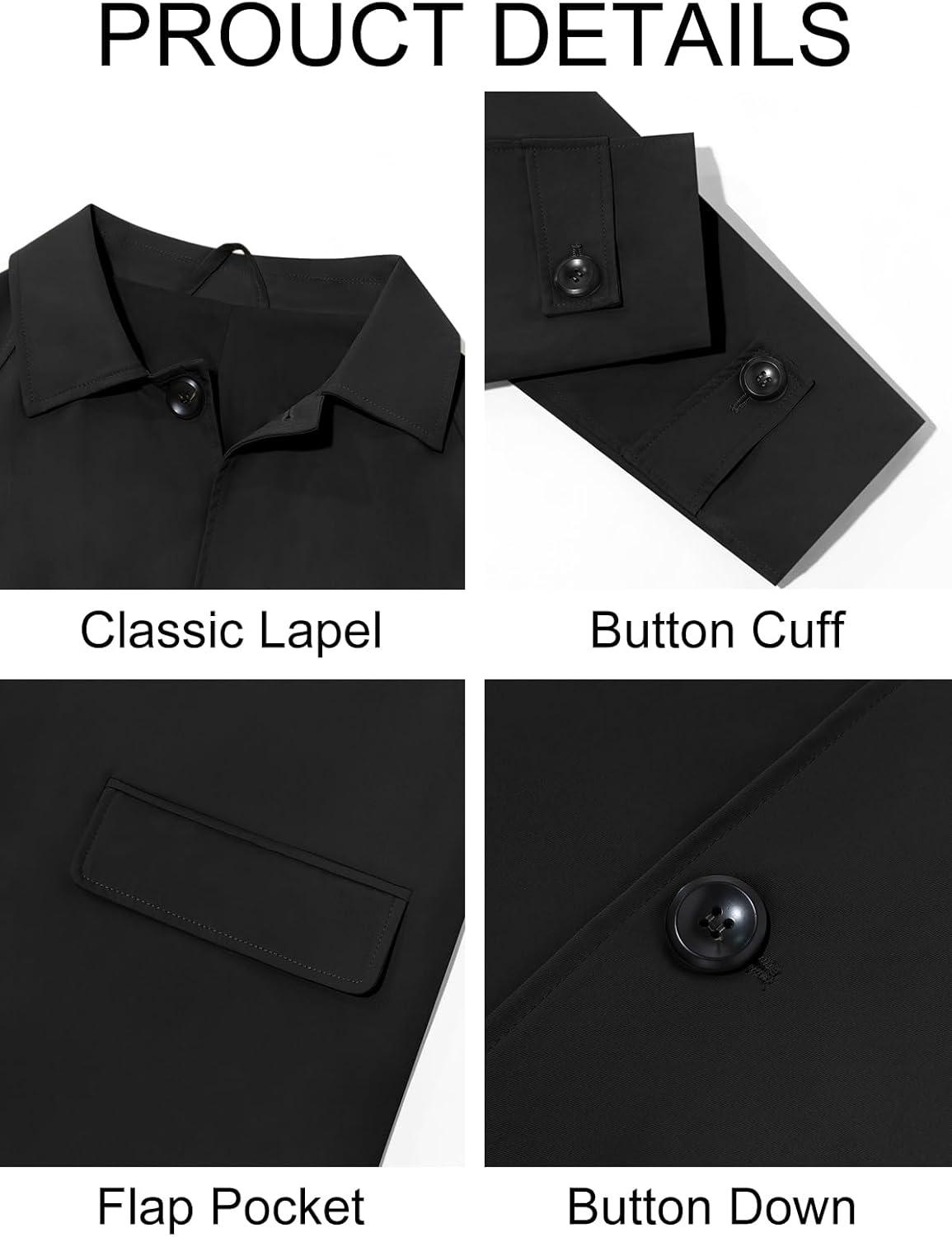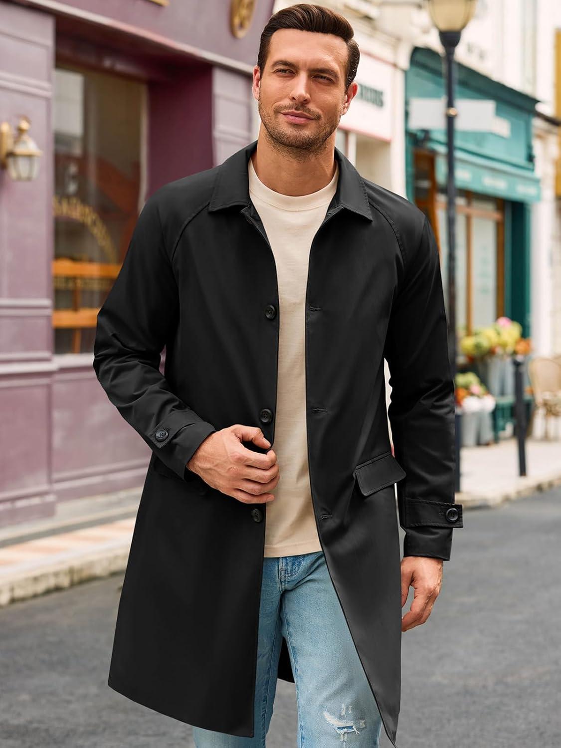Runcati Mens Trench Coat Slim Fit Single Breasted Long Windbreaker Jacket Classic Lapel Casual Overcoat(Black)