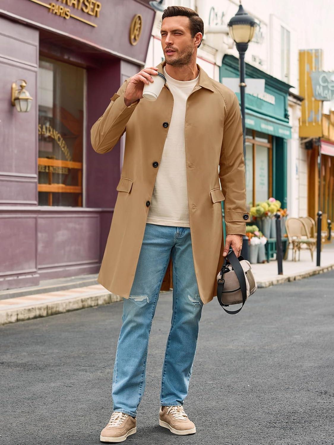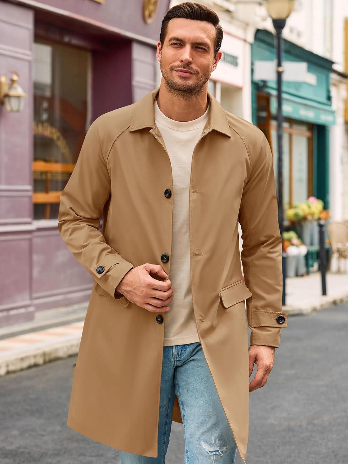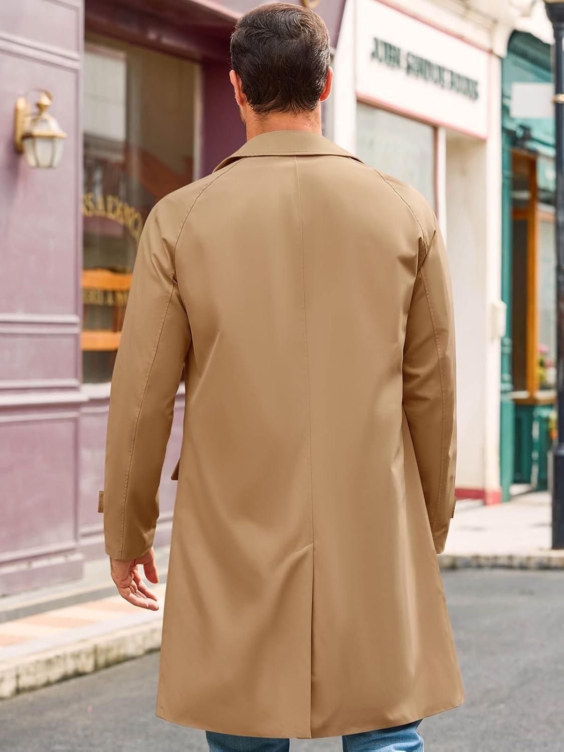 Runcati Mens Trench Coat Slim Fit Single Breasted Long Windbreaker Jacket Classic Lapel Casual Overcoat(Khaki)