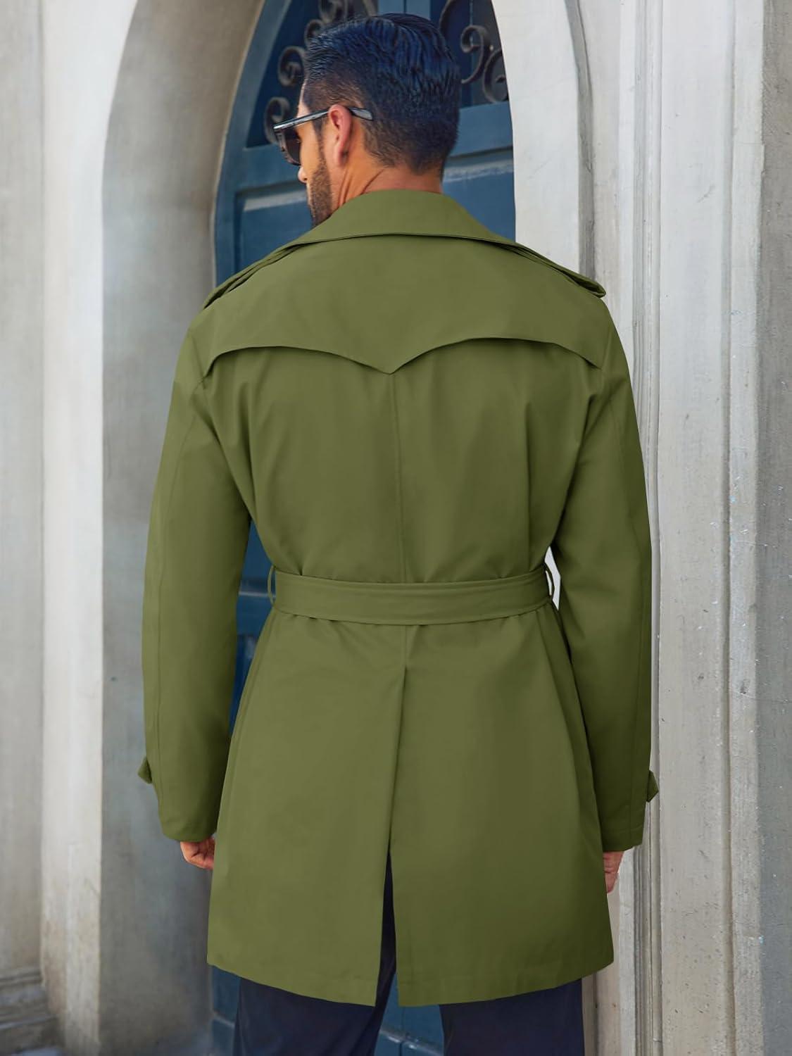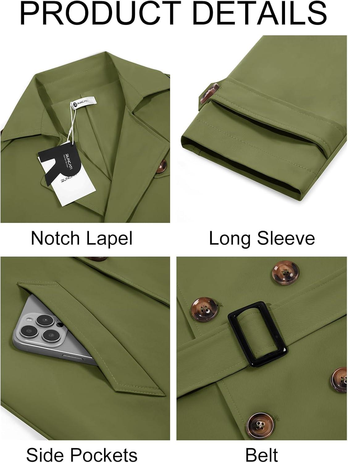 Runcati Men’s Trench Coat Double Breasted Notched Lapel Long Jacket Belted Windbreaker Casual Slim Fit Overcoat(Army Green)