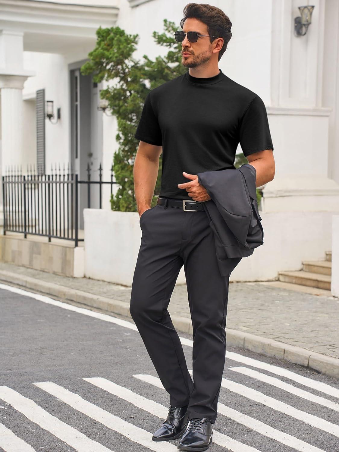 Mens Casual Slim Fit Basic Tops Short Sleeve Shirt Turtleneck T Shirts Rib Knitted Stretch Pullover Sweater(01 Black)