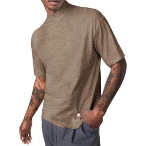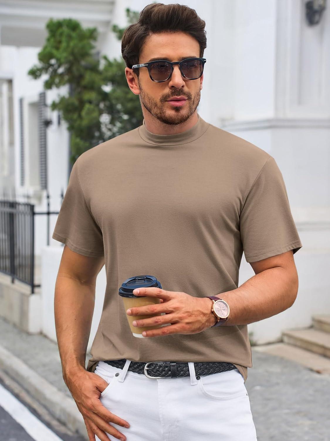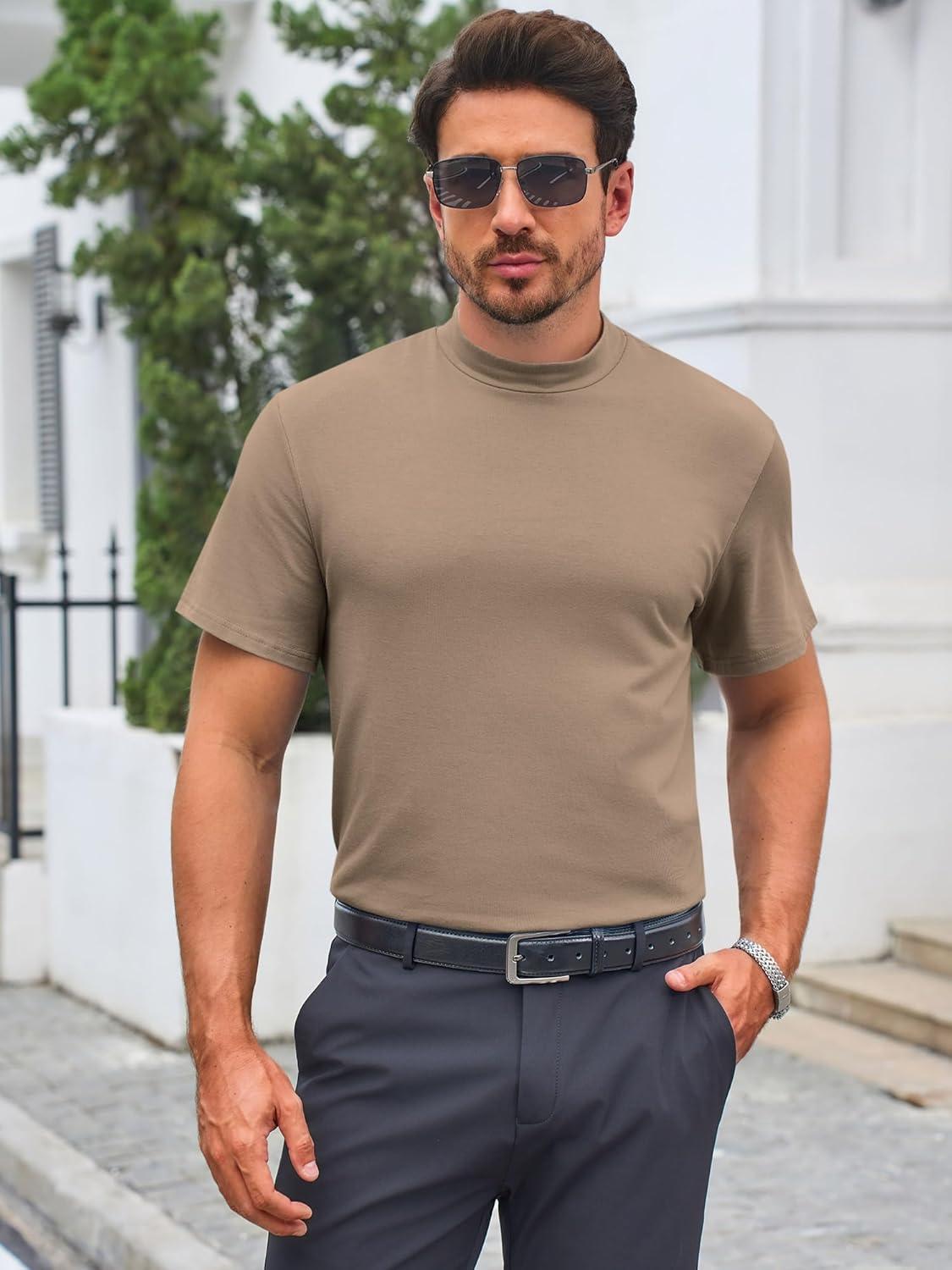Mens Mock Turtleneck T Shirts Short Sleeve Cotton Basic Undershirt Relaxed Fit Lightweight Solid Pullover Tops(Khaki)