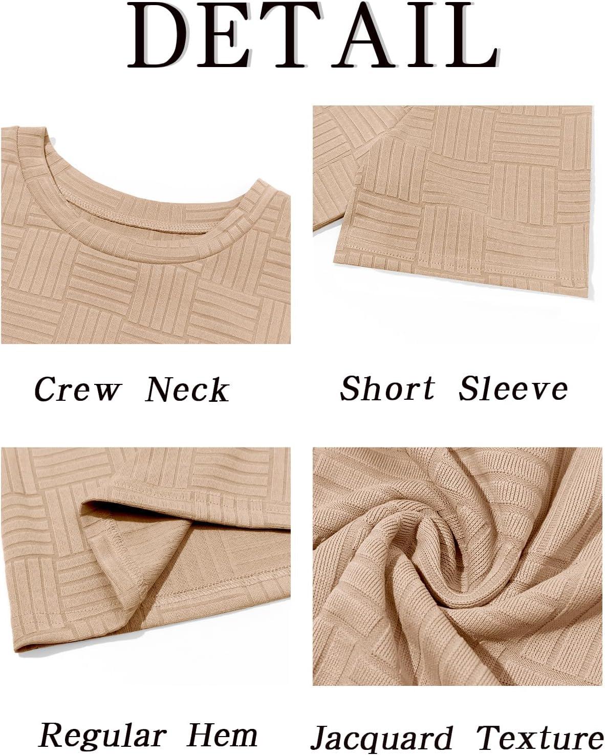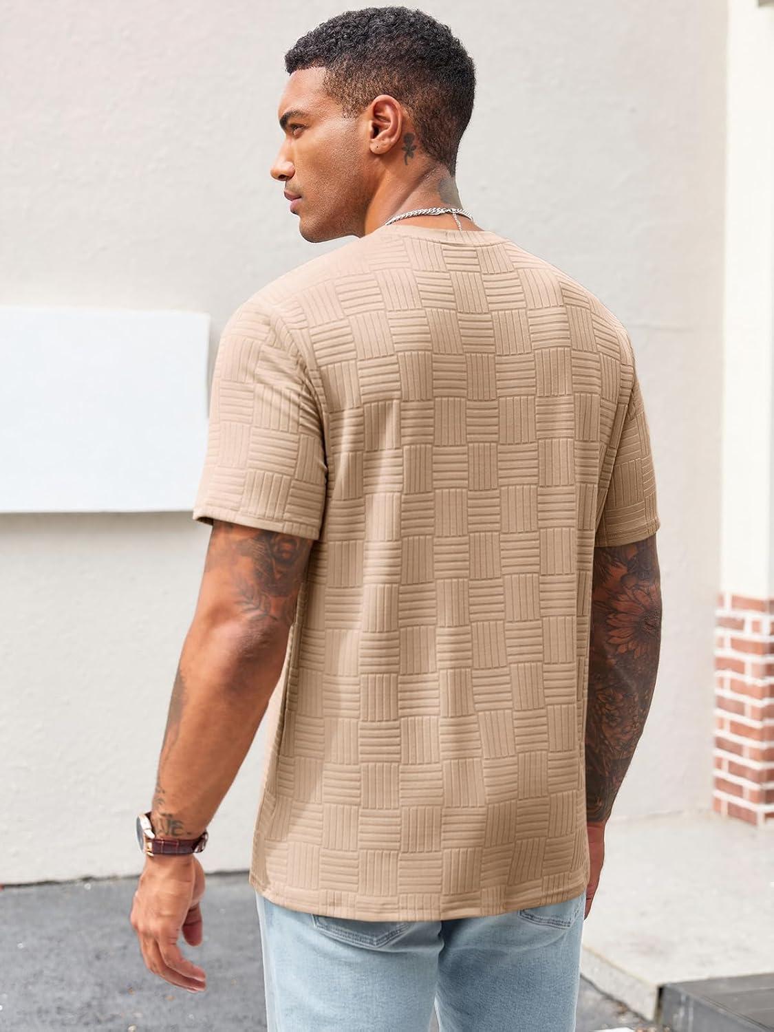 Runcati Men’s Casual T-Shirts Short Sleeve Crew Neck Summer Stretchy Shirt Textured Jacquard Tops(Light Khaki)