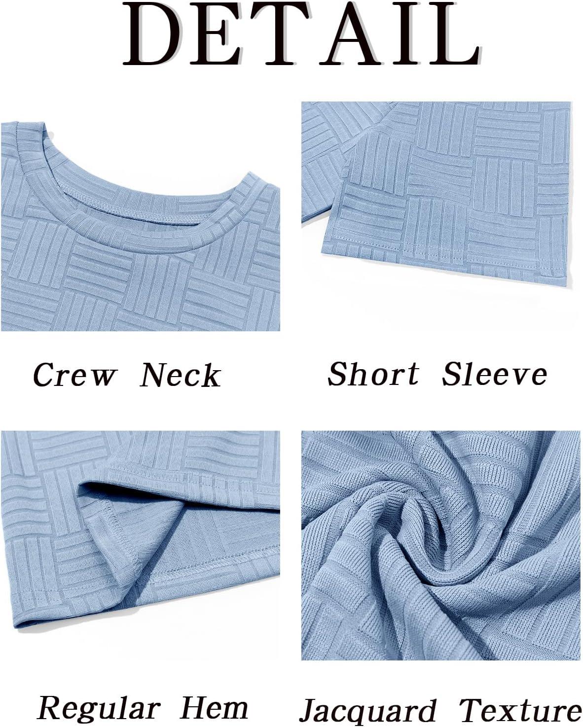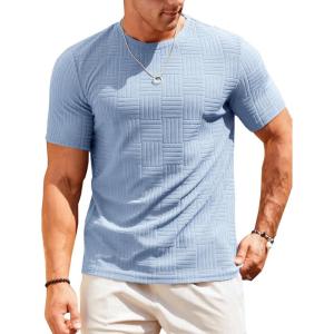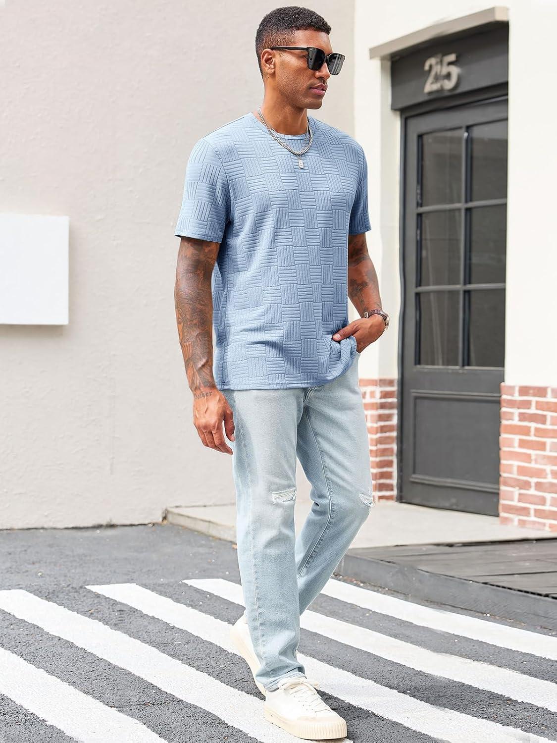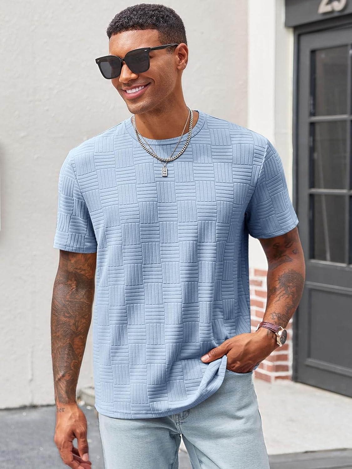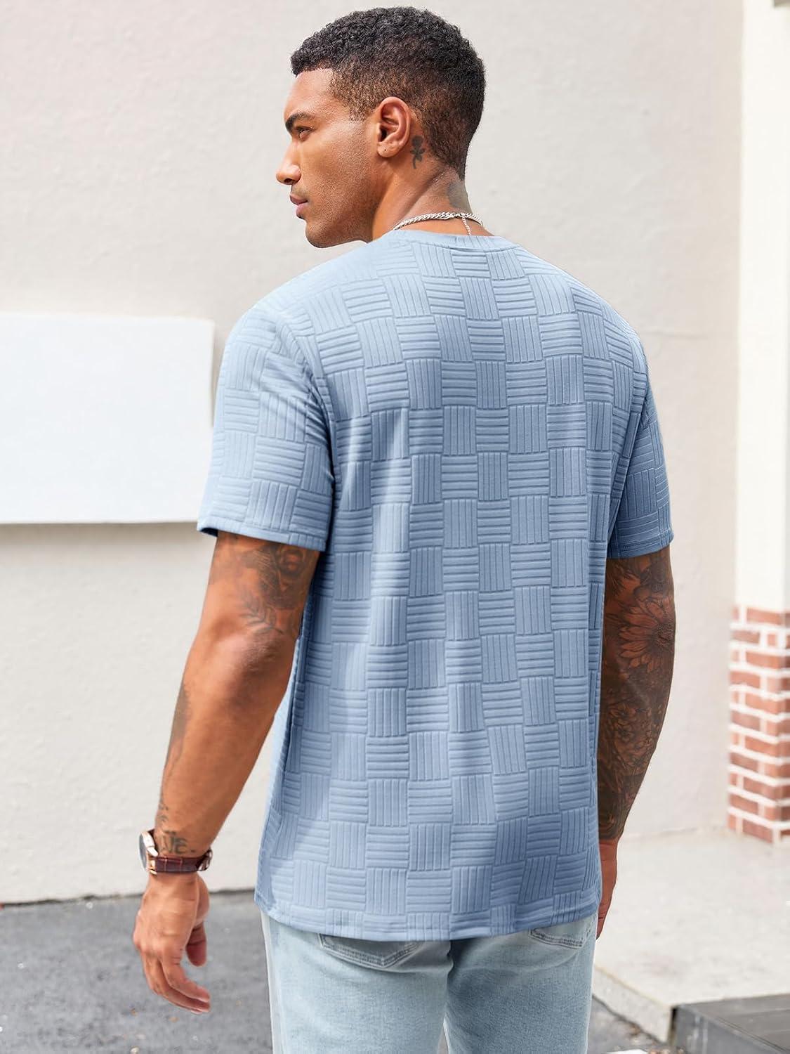 Runcati Men’s Casual T-Shirts Short Sleeve Crew Neck Summer Stretchy Shirt Textured Jacquard Tops(Sky Blue)