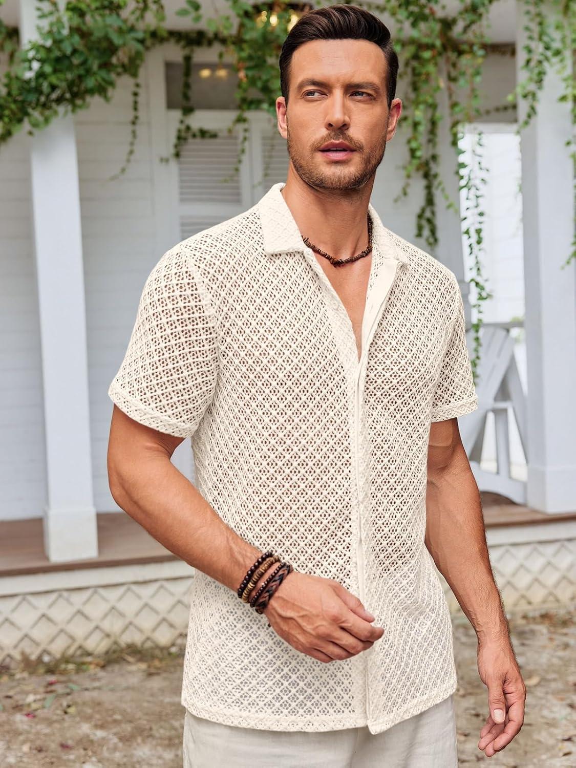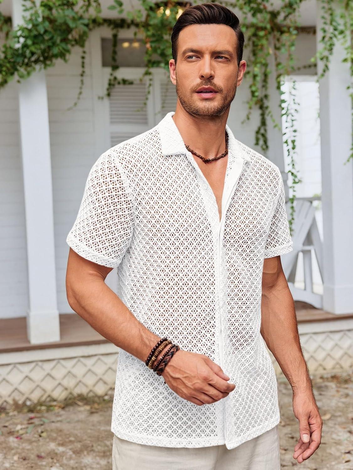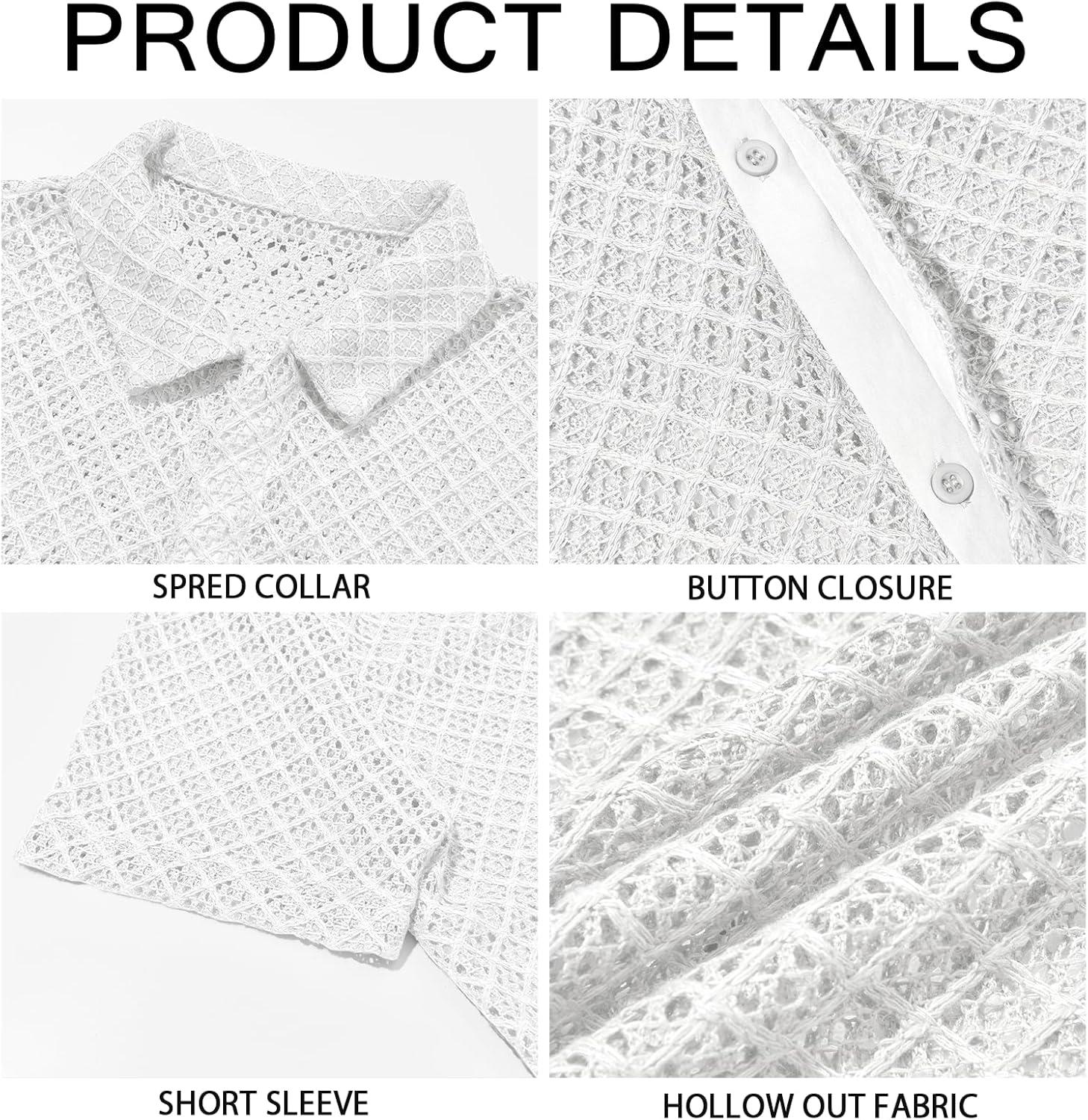 Runcati Mens Button Down Knit Shirt Short Sleeve Crochet Shirts Casual Hollow Out Summer Beach Vacation Tops(White)