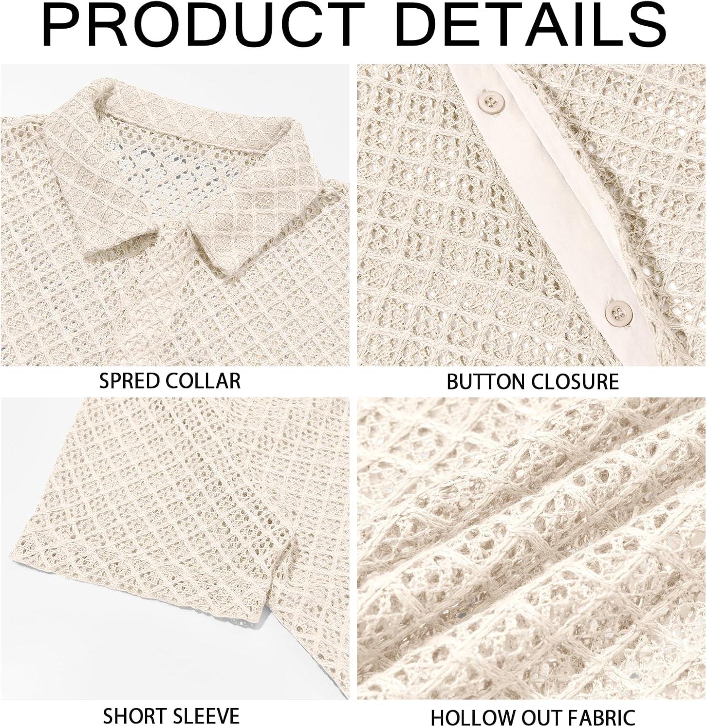 Runcati Mens Button Down Knit Shirt Short Sleeve Crochet Shirts Casual Hollow Out Summer Beach Vacation Tops(Beige)