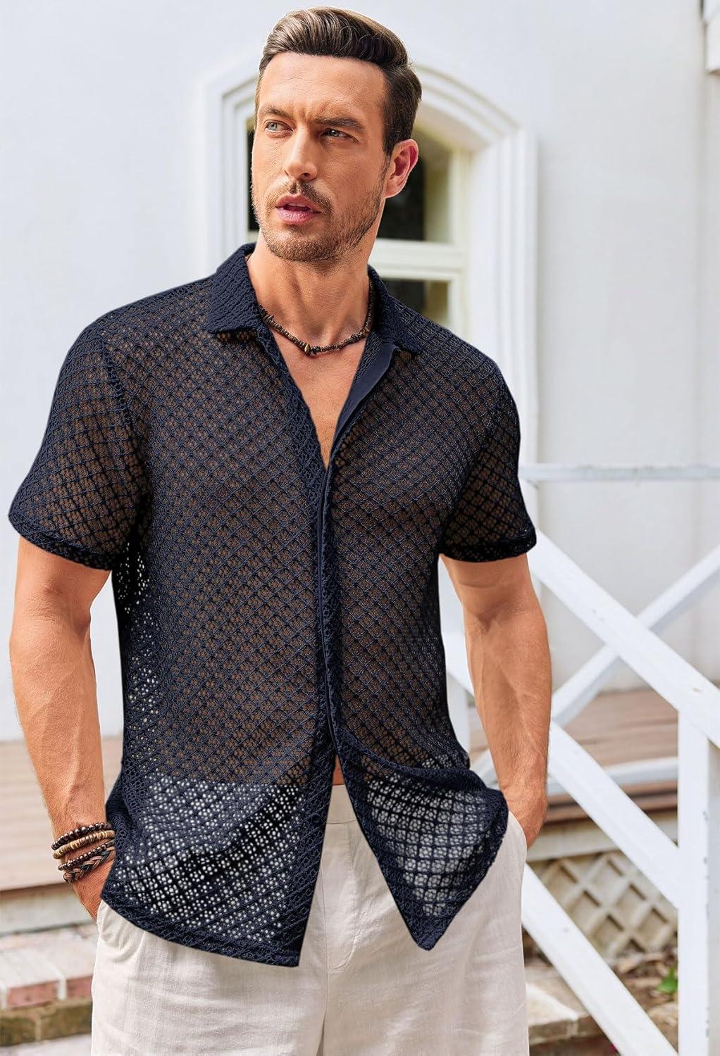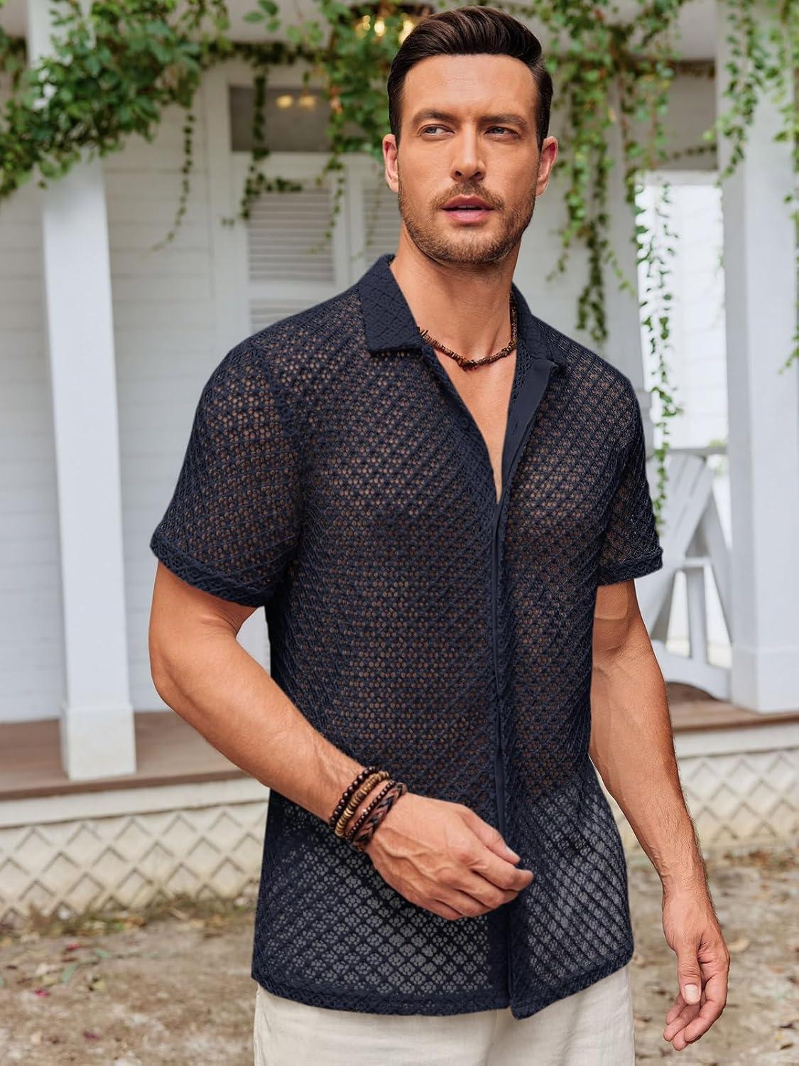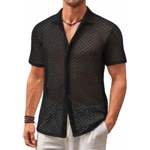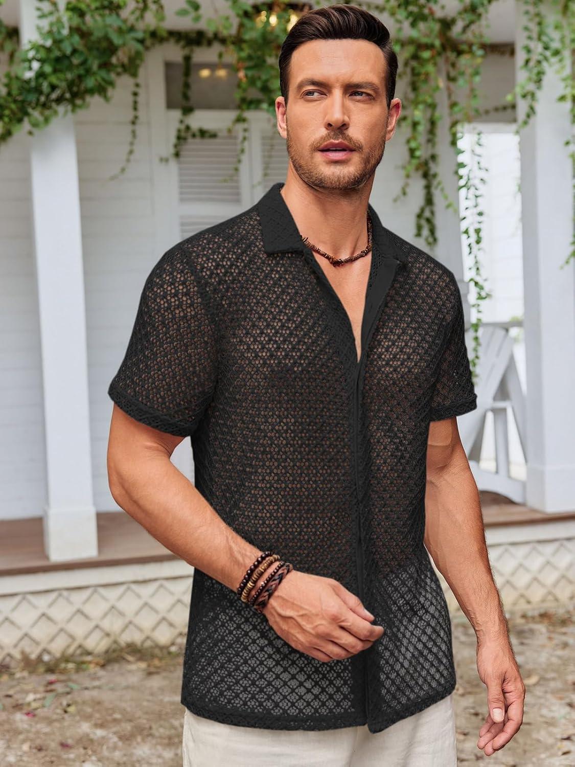 Runcati Mens Button Down Knit Shirt Short Sleeve Crochet Shirts Casual Hollow Out Summer Beach Vacation Tops(Black)