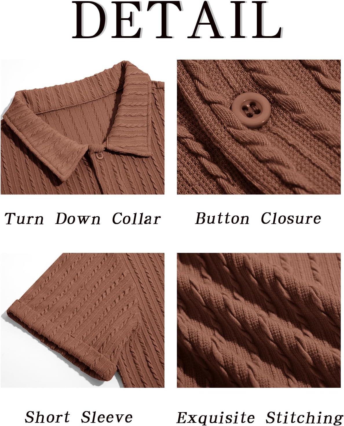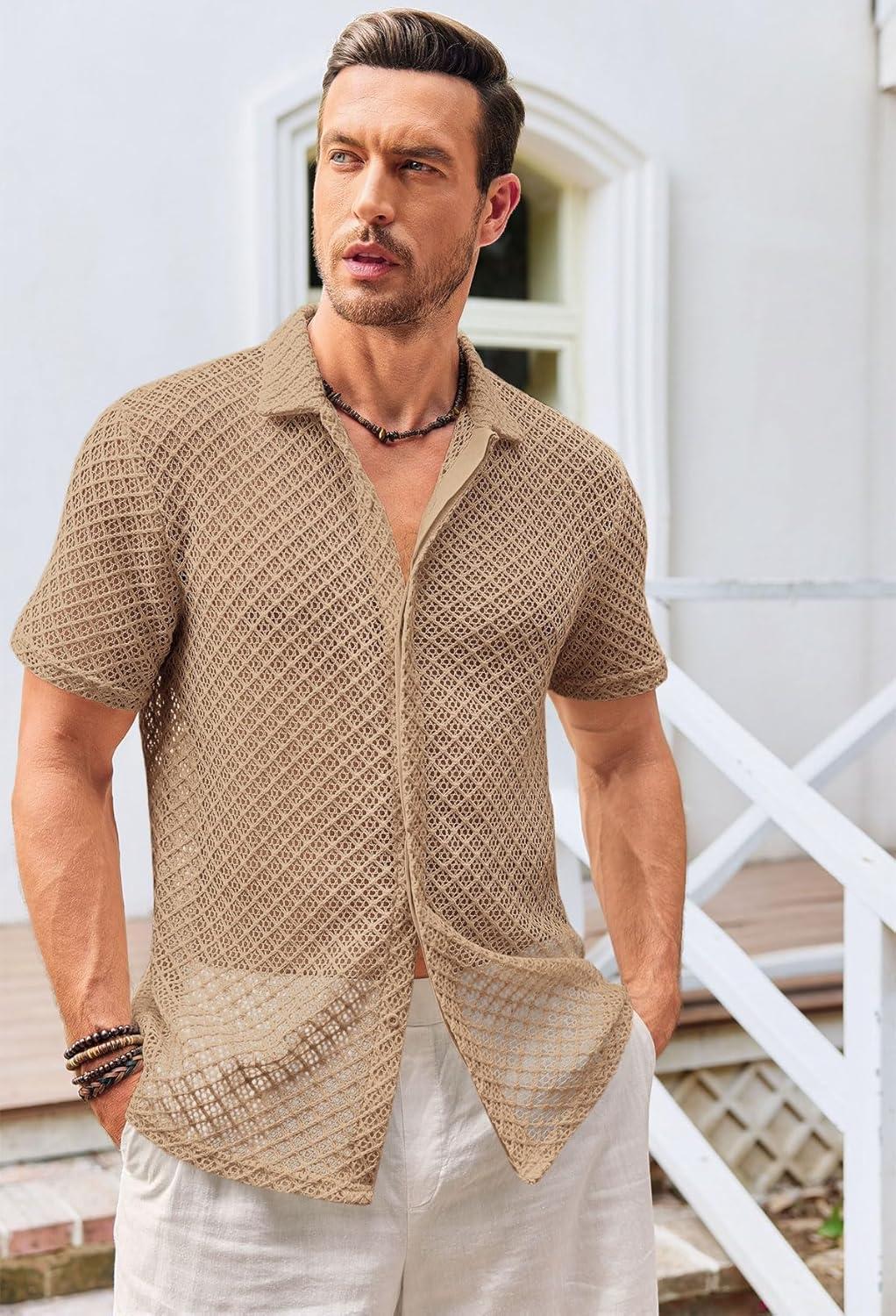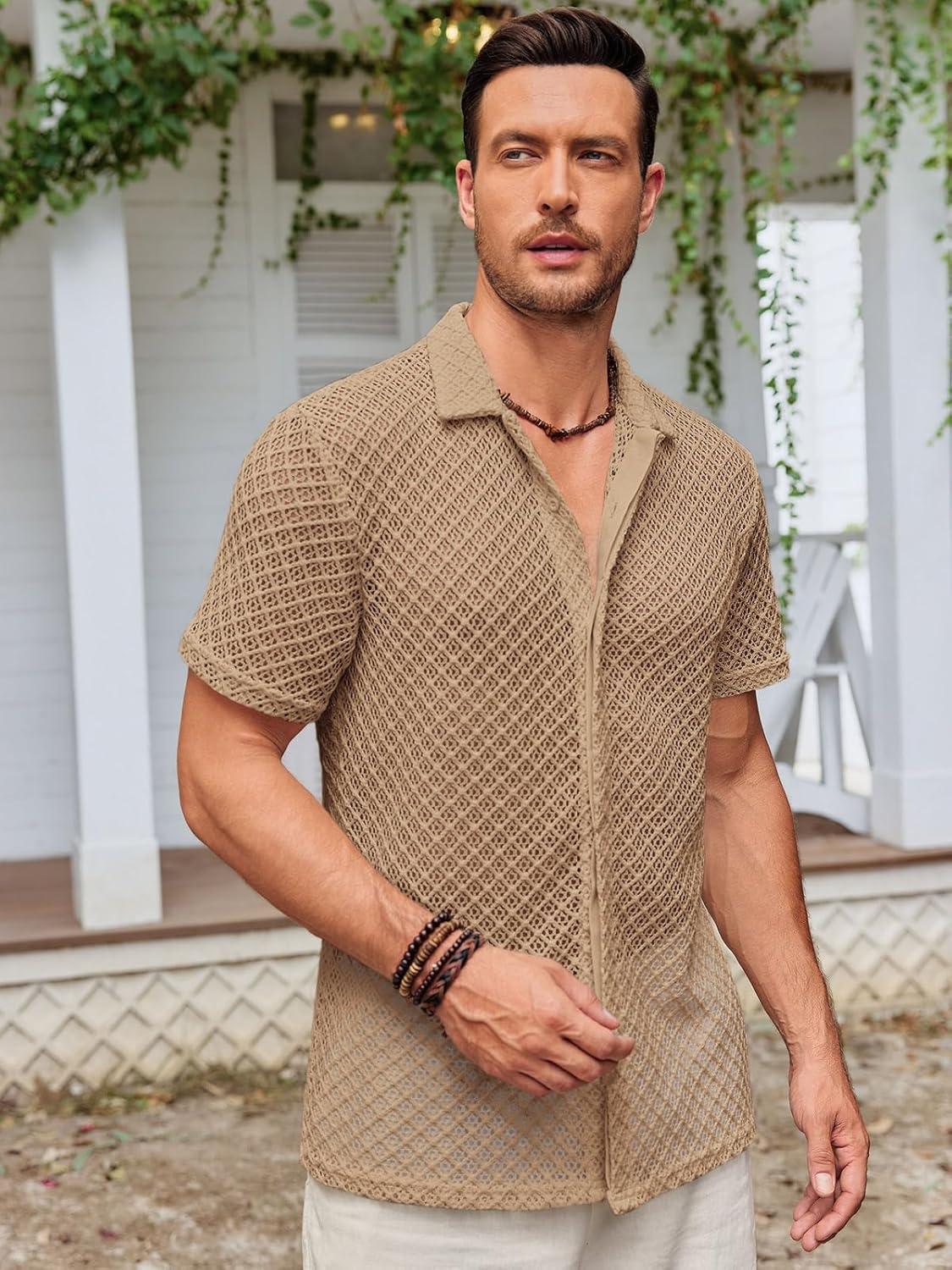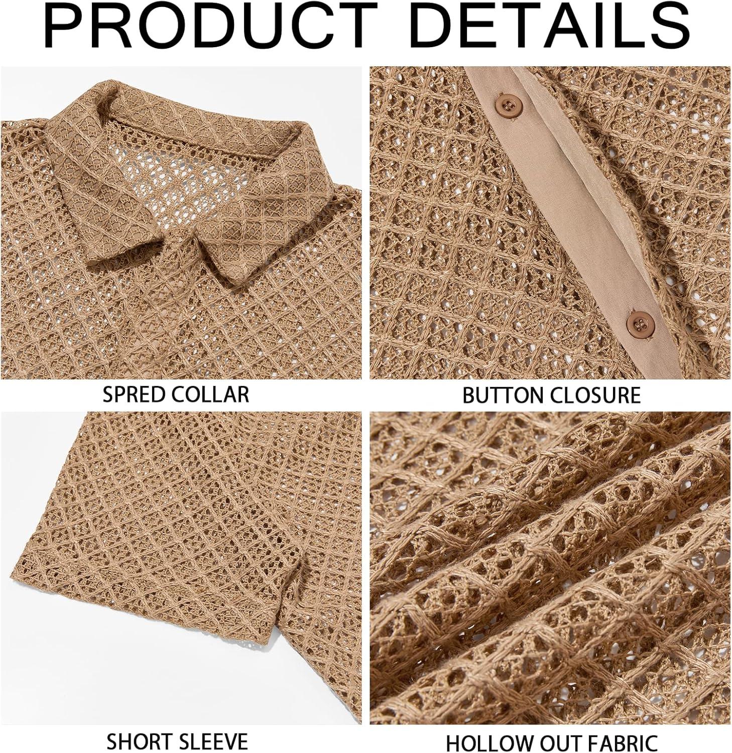 Runcati Mens Button Down Knit Shirt Short Sleeve Crochet Shirts Casual Hollow Out Summer Beach Vacation Tops(Brown)