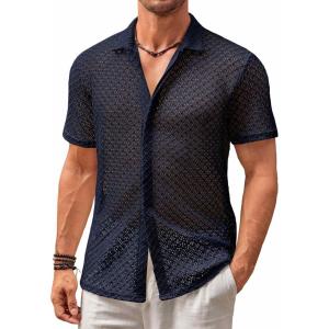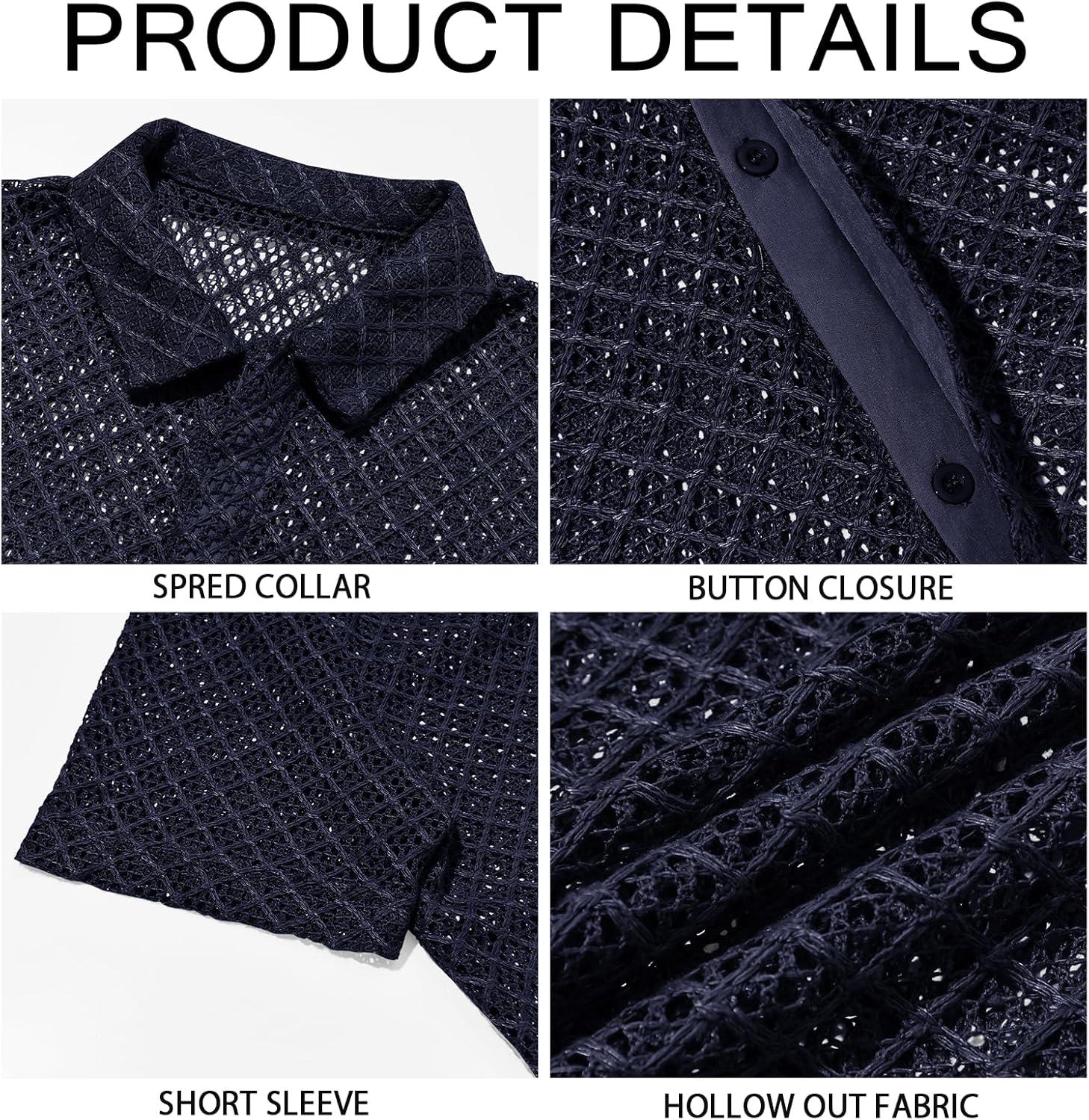 Runcati Mens Button Down Knit Shirt Short Sleeve Crochet Shirts Casual Hollow Out Summer Beach Vacation Tops(Navy)