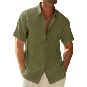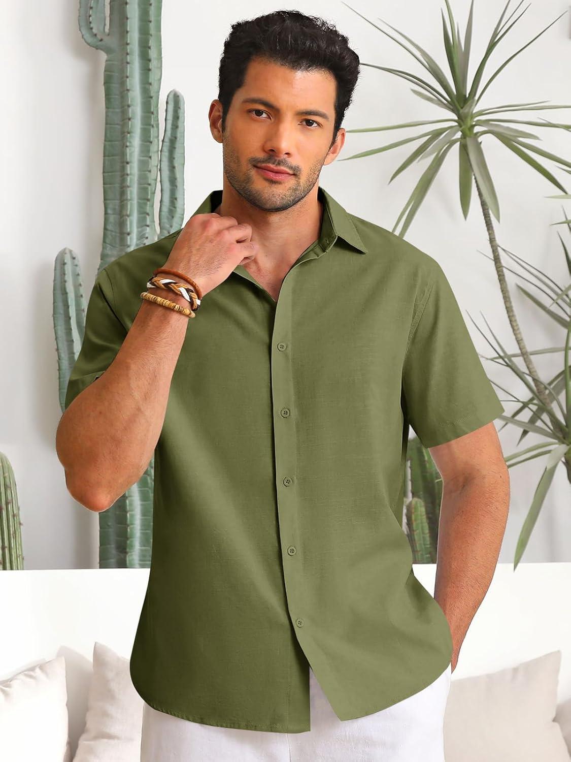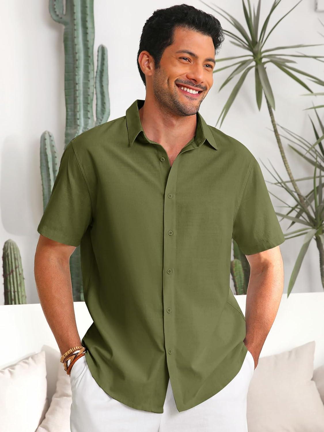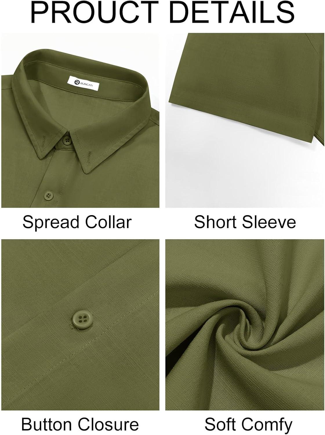 Runcati Mens Button Down Linen Shirts Short Sleeve Casual Collared Summer Beach Untucked Tops(Army Green)