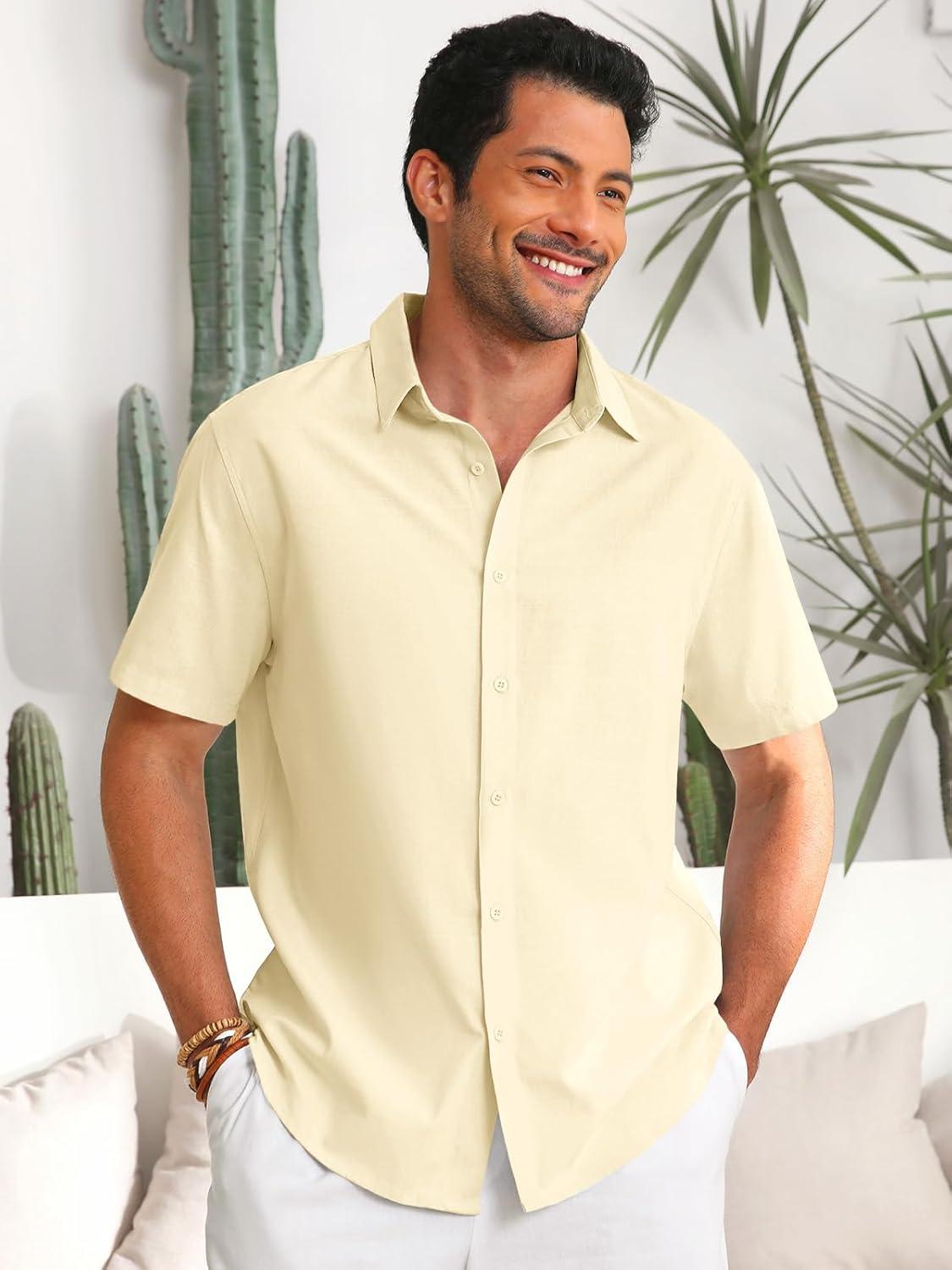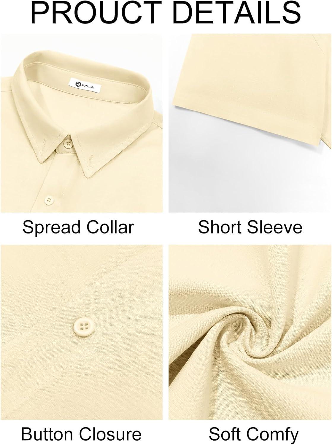 Runcati Mens Button Down Linen Shirts Short Sleeve Casual Collared Summer Beach Untucked Tops(Beige)