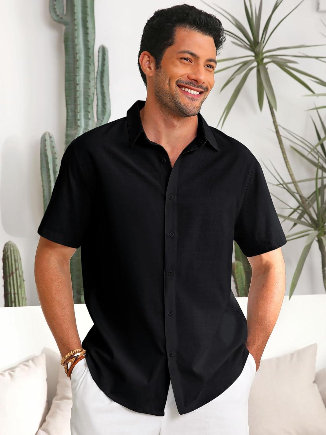Runcati Mens Button Down Linen Shirts Short Sleeve Casual Collared Summer Beach Untucked Tops(Black)
