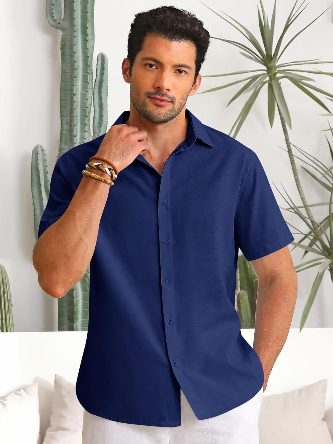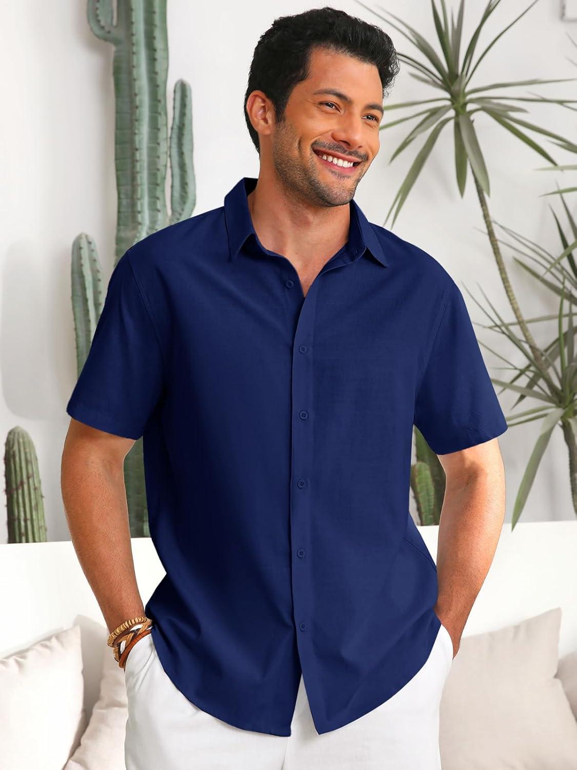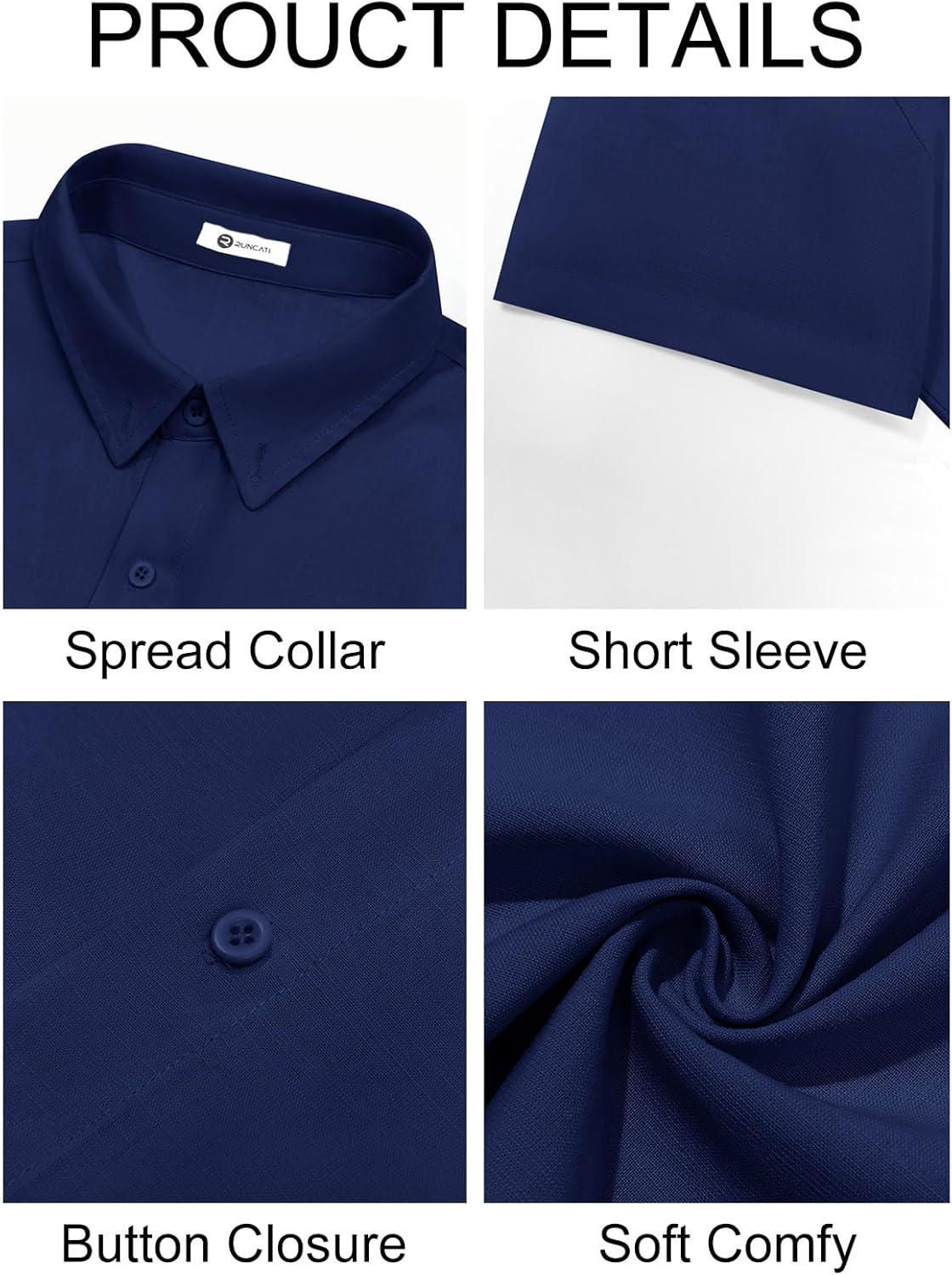 Runcati Mens Button Down Linen Shirts Short Sleeve Casual Collared Summer Beach Untucked Tops(Navy)