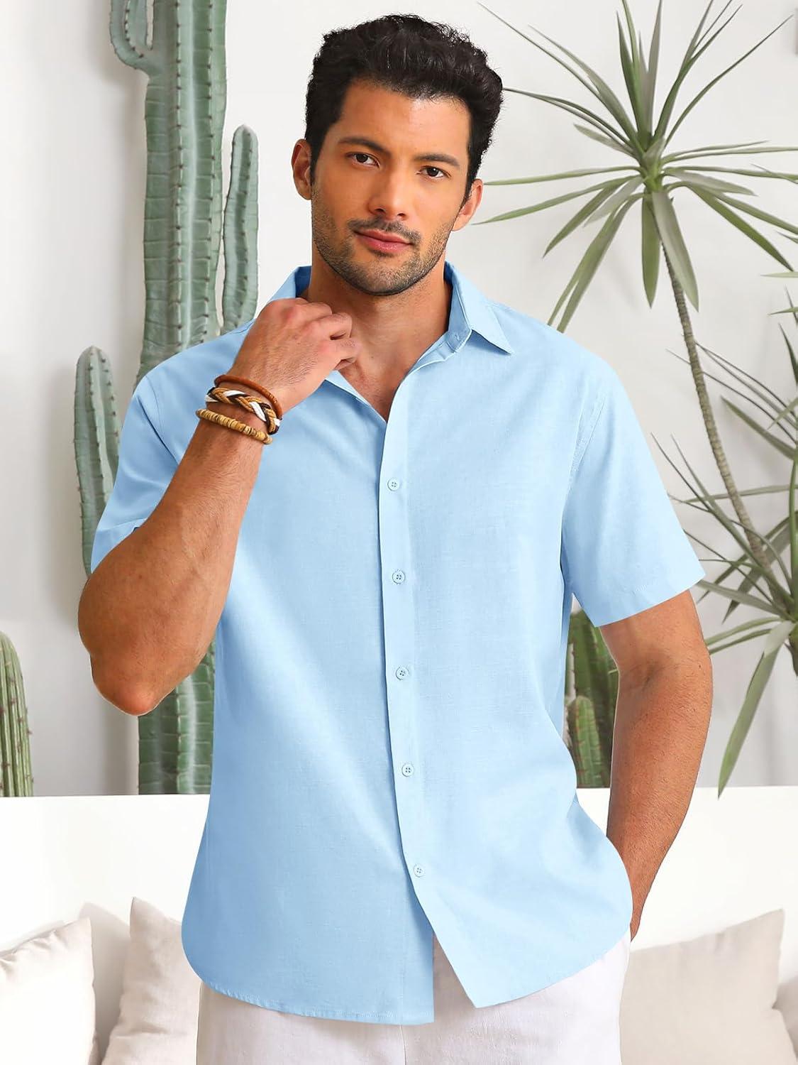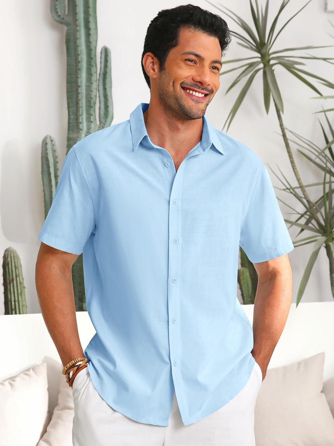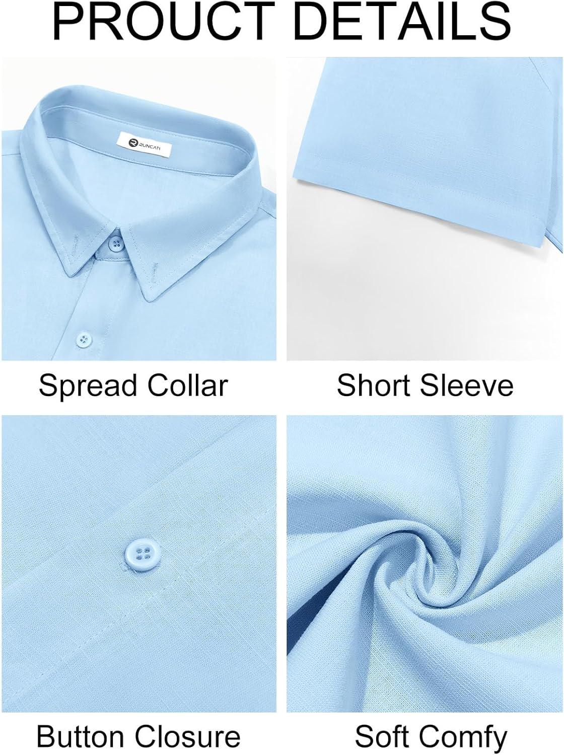 Runcati Mens Button Down Linen Shirts Short Sleeve Casual Collared Summer Beach Untucked Tops(Sky Blue)