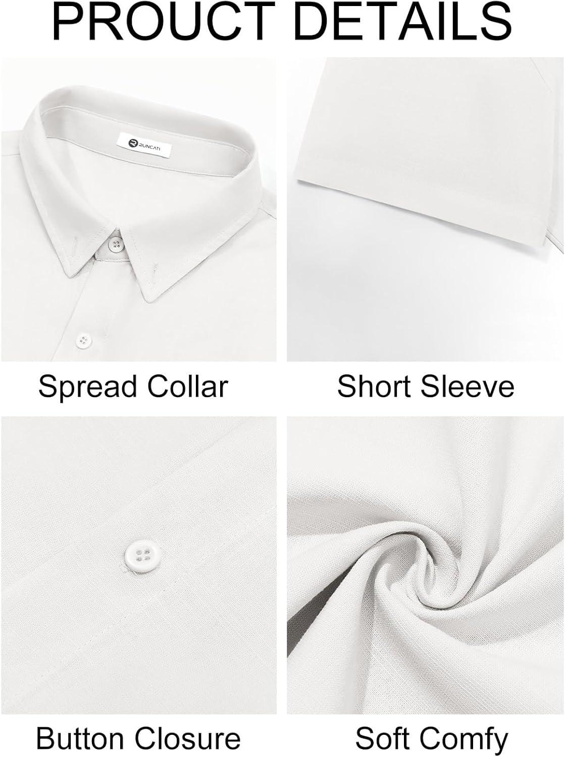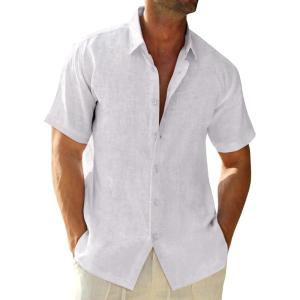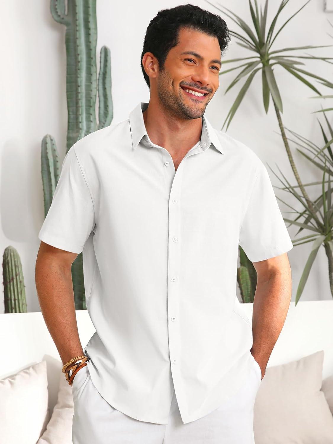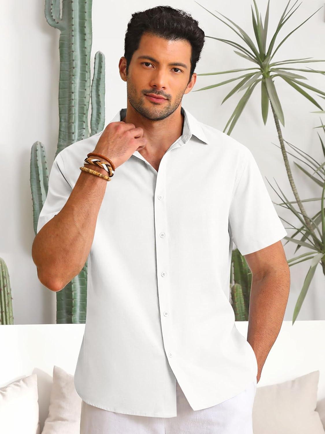 Runcati Mens Button Down Linen Shirts Short Sleeve Casual Collared Summer Beach Untucked Tops(White)