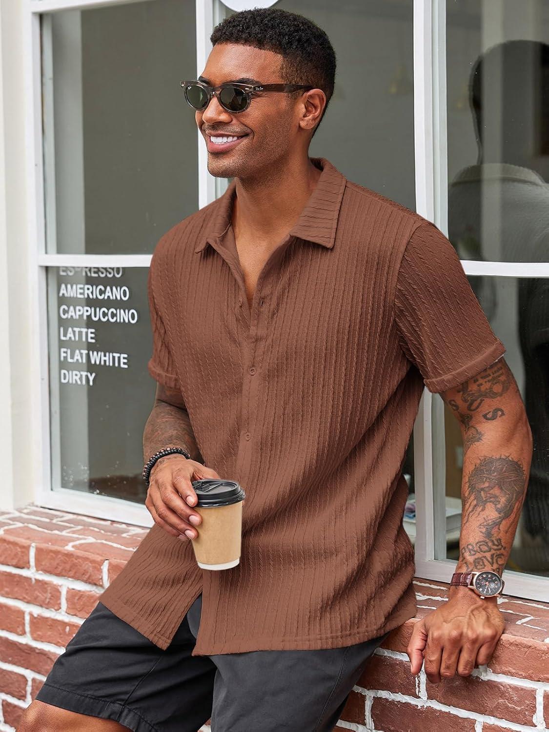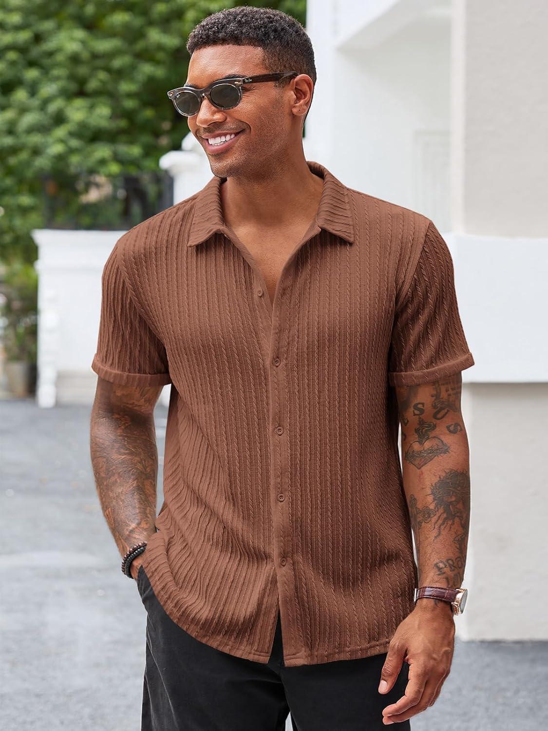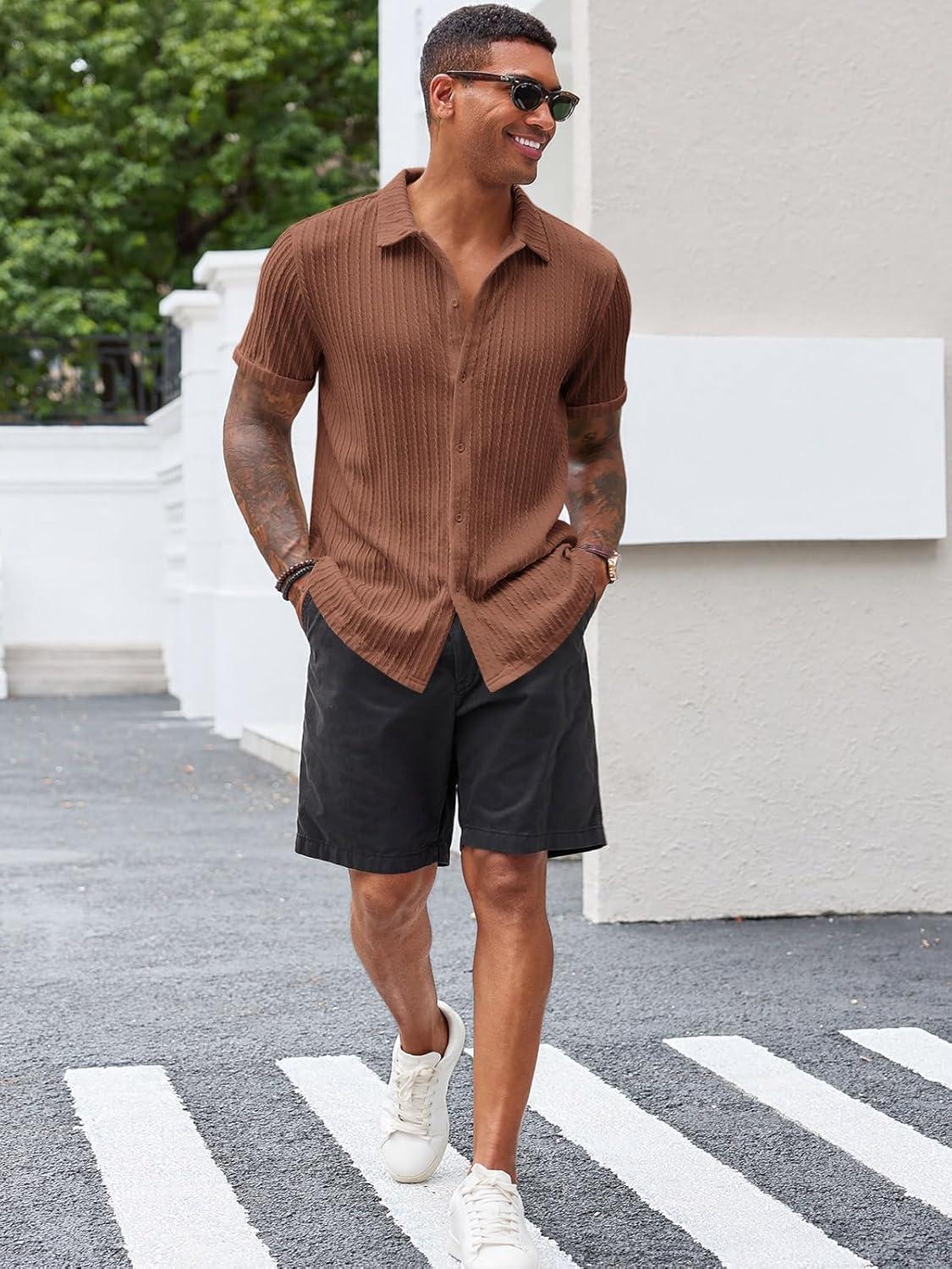 Runcati Men’s Casual Button Down Shirts Short Sleeve Textured Shirt Summer Beach Tops(Brown)