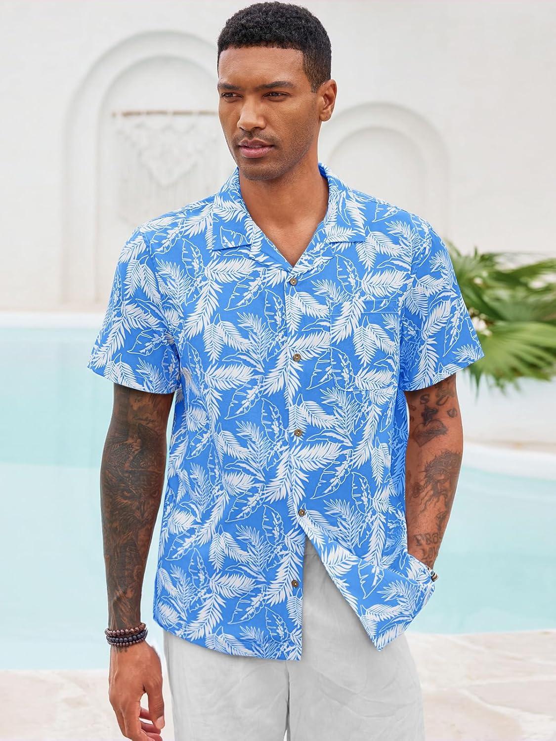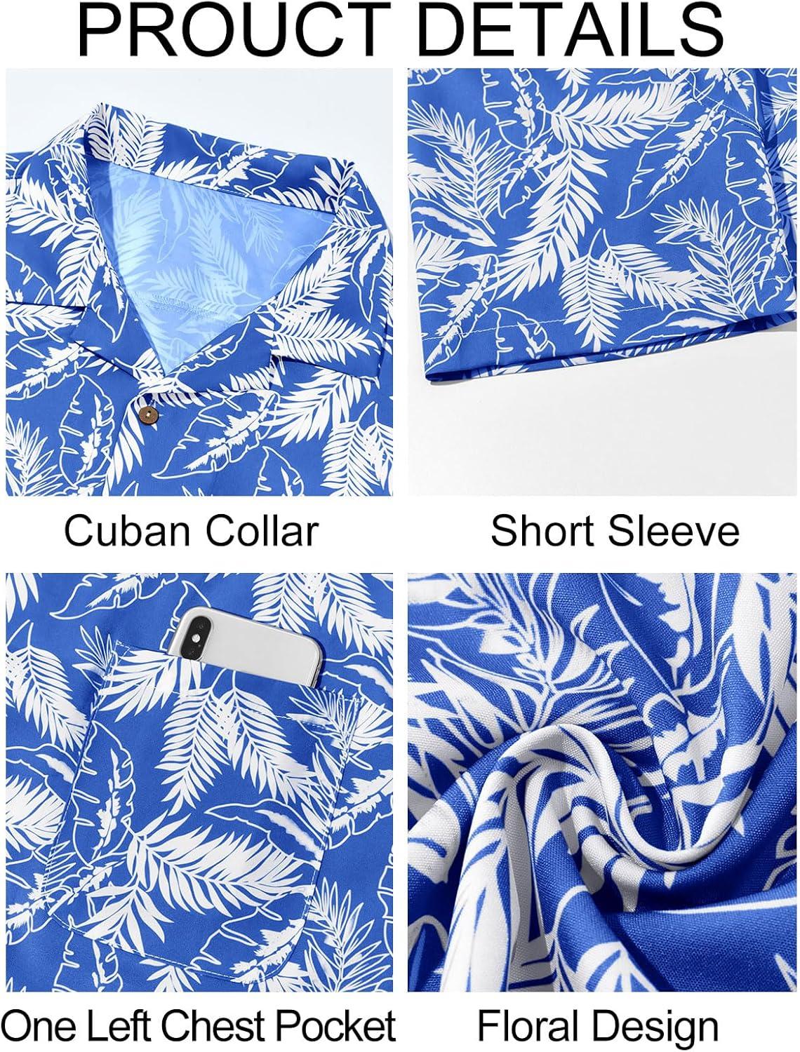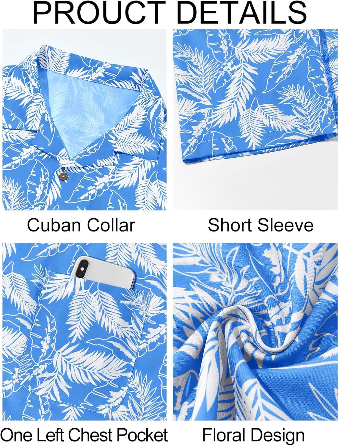 Runcati Men’s Hawaiian Shirts Button Down Short Sleeve Cuban Collar Shirt Floral Tropical Summer Beach Tops(Blue)