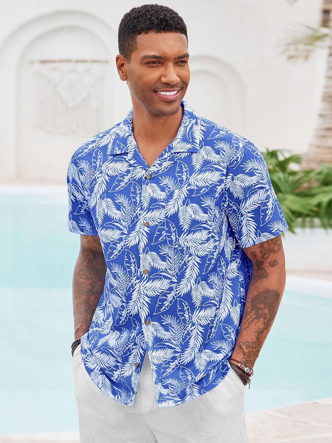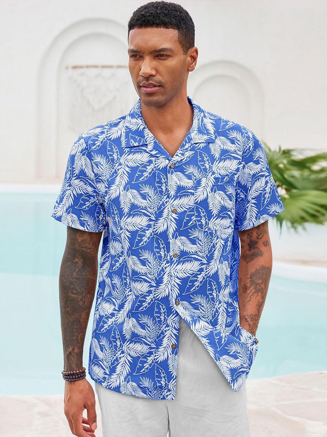 Runcati Men’s Hawaiian Shirts Button Down Short Sleeve Cuban Collar Shirt Floral Tropical Summer Beach Tops(Royal Blue)
