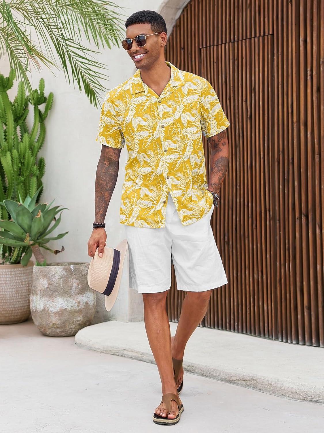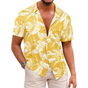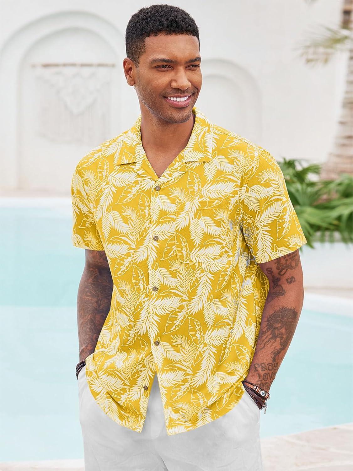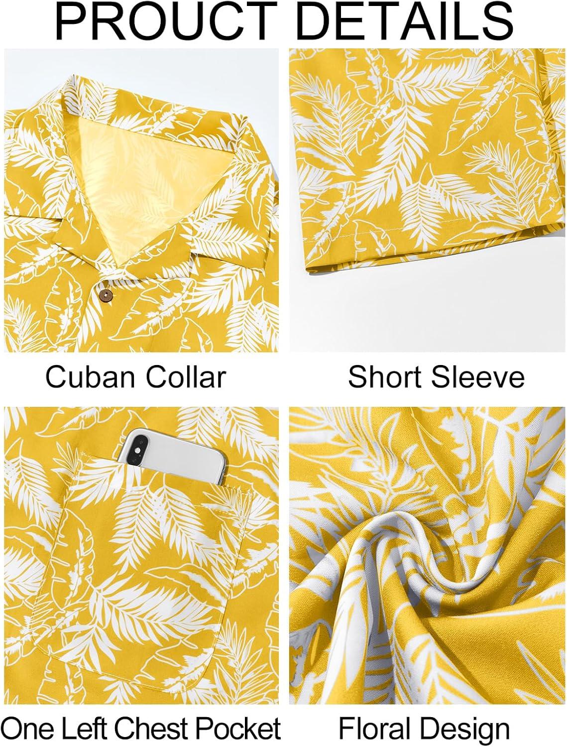 Runcati Men’s Hawaiian Shirts Button Down Short Sleeve Cuban Collar Shirt Floral Tropical Summer Beach Tops(Yellow)