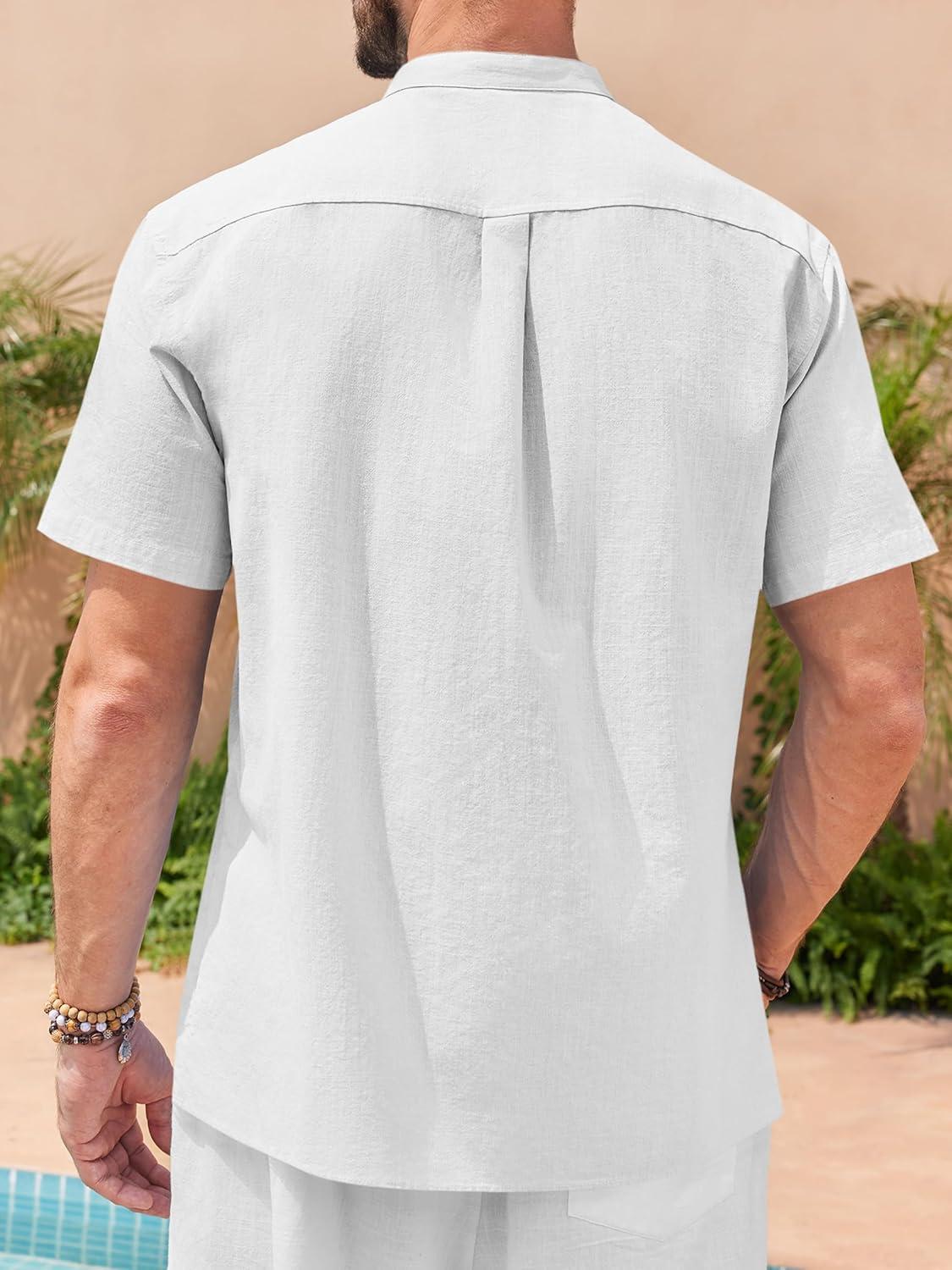 • Runcati Mens Short Sleeve Linen Shirts Button Down Casual Texture Summer Beach Wedding Tops(White)