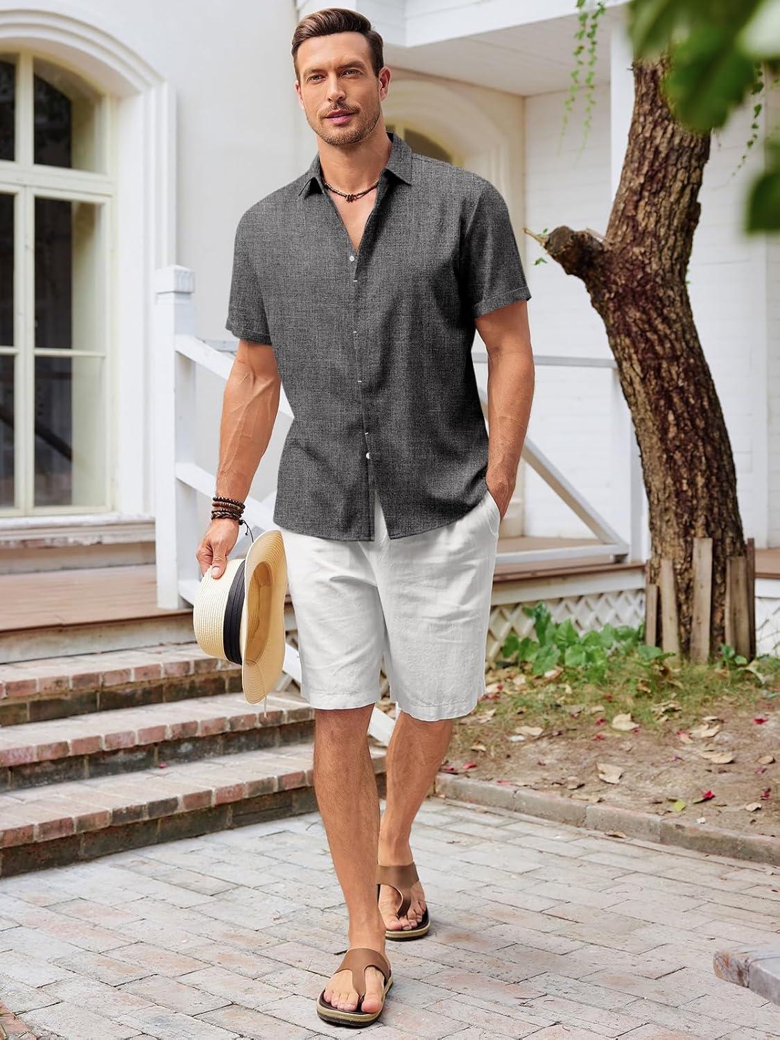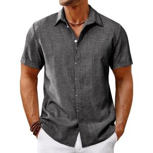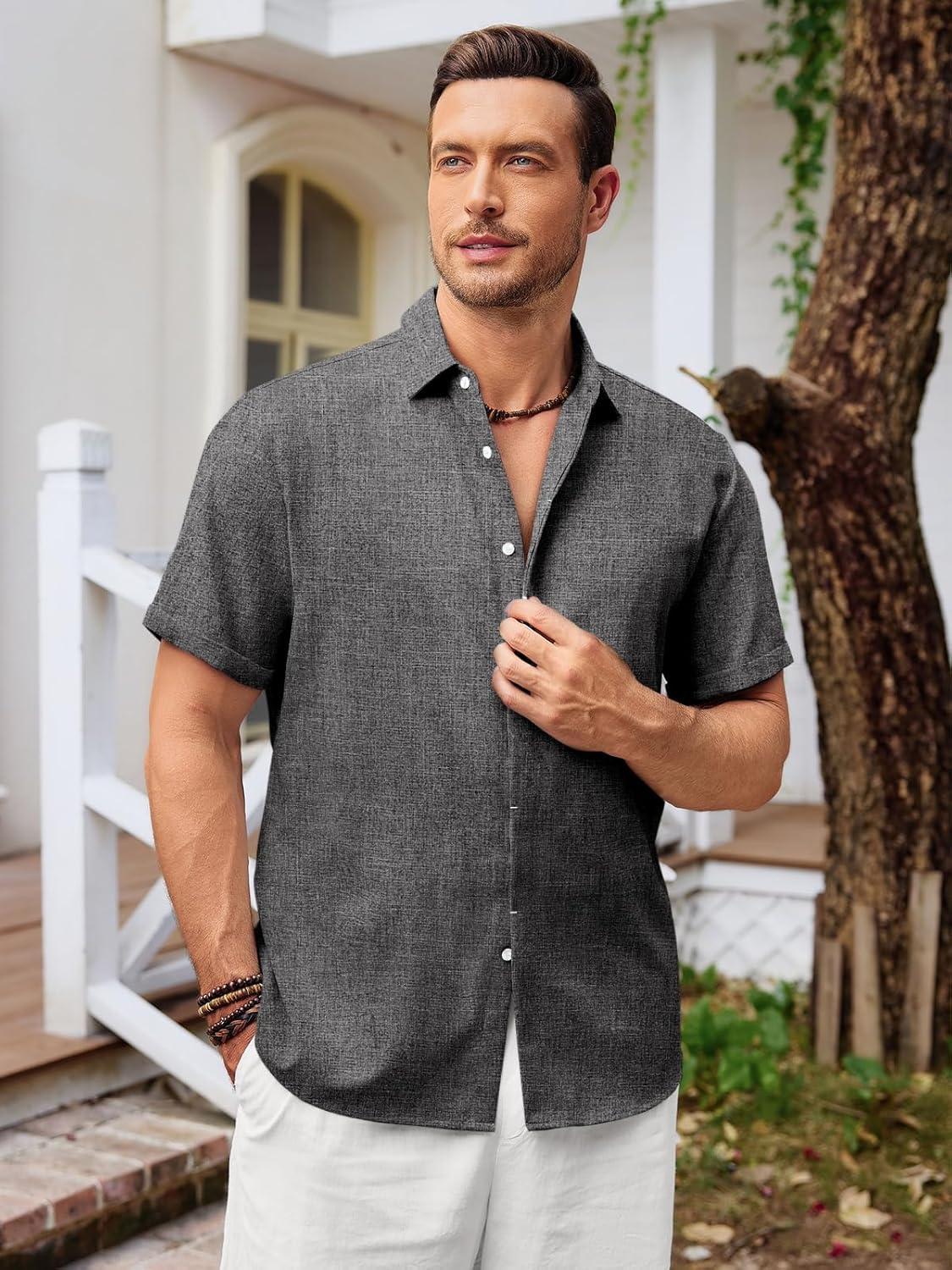 • Runcati Mens Short Sleeve Linen Shirts Button Down Casual Texture Summer Beach Wedding Tops(Dark Gray)