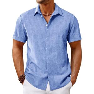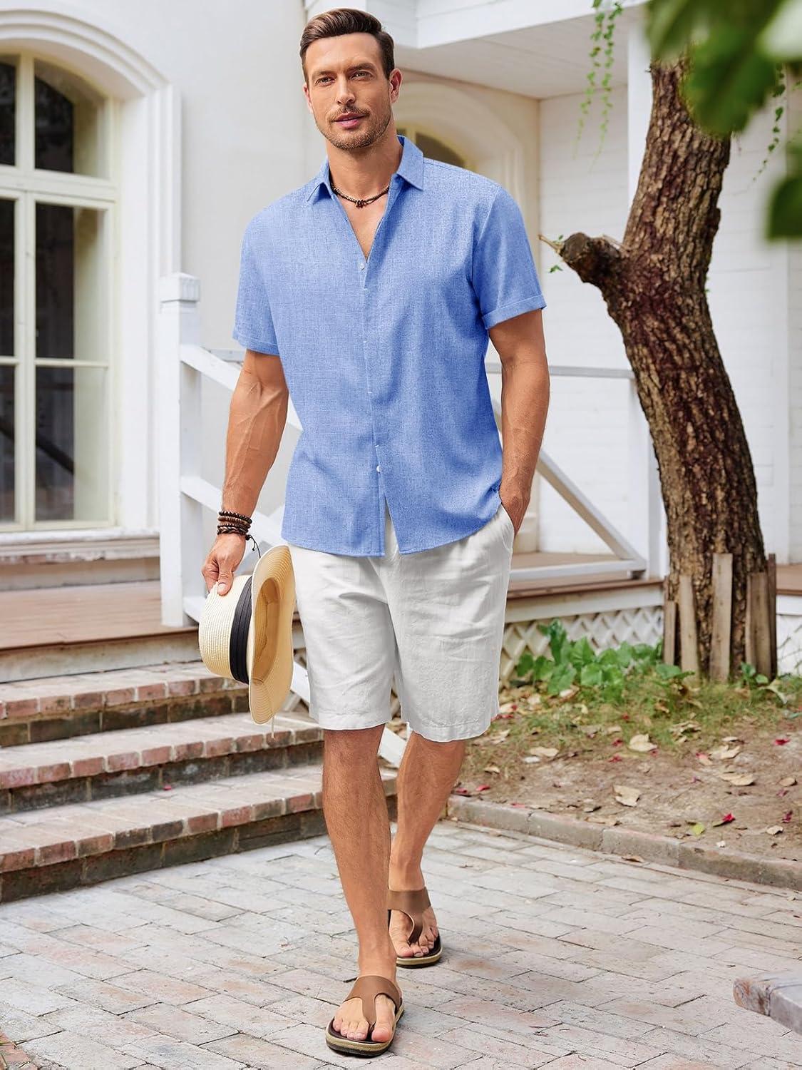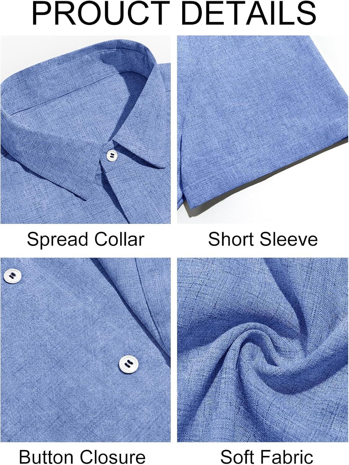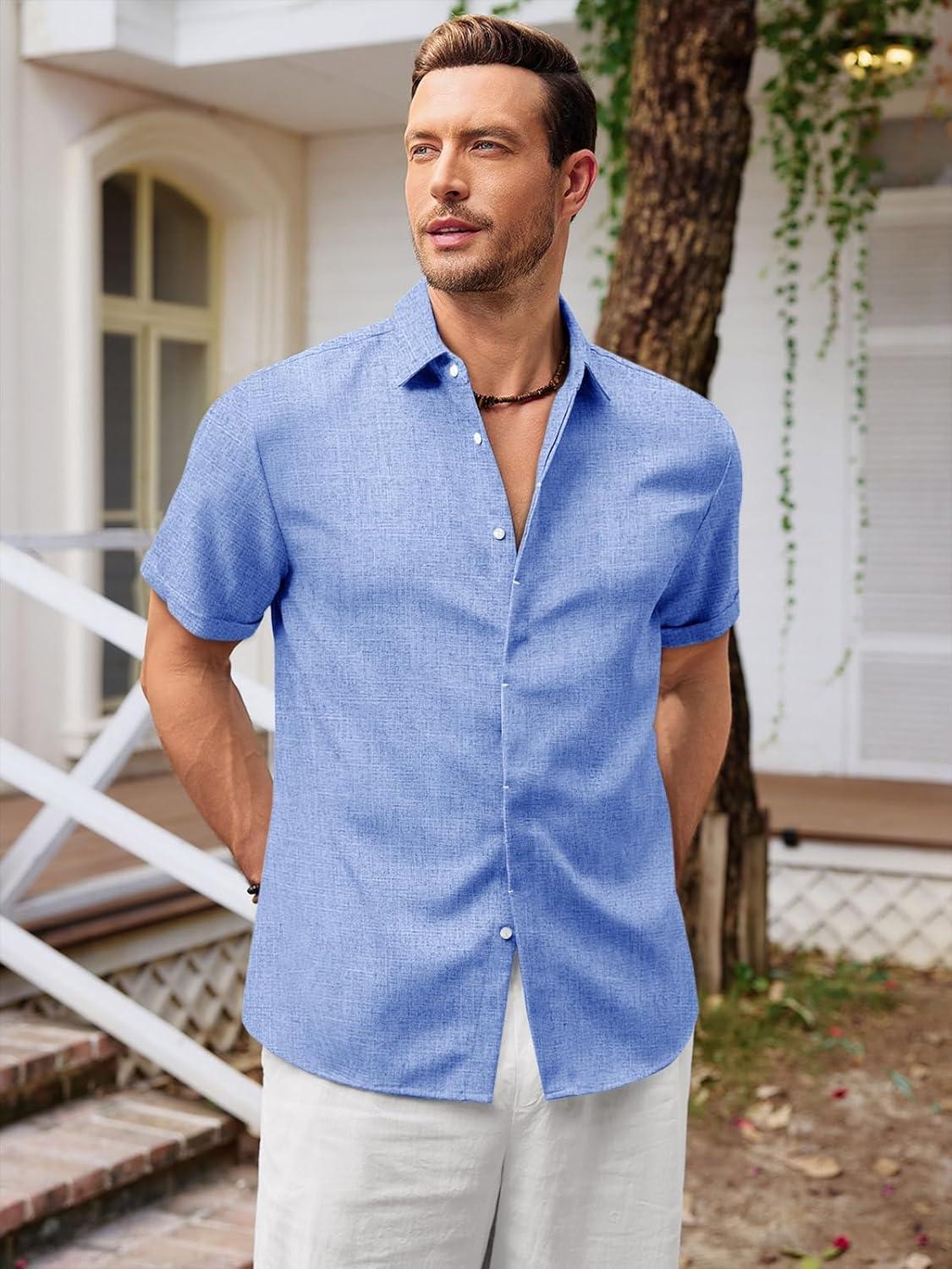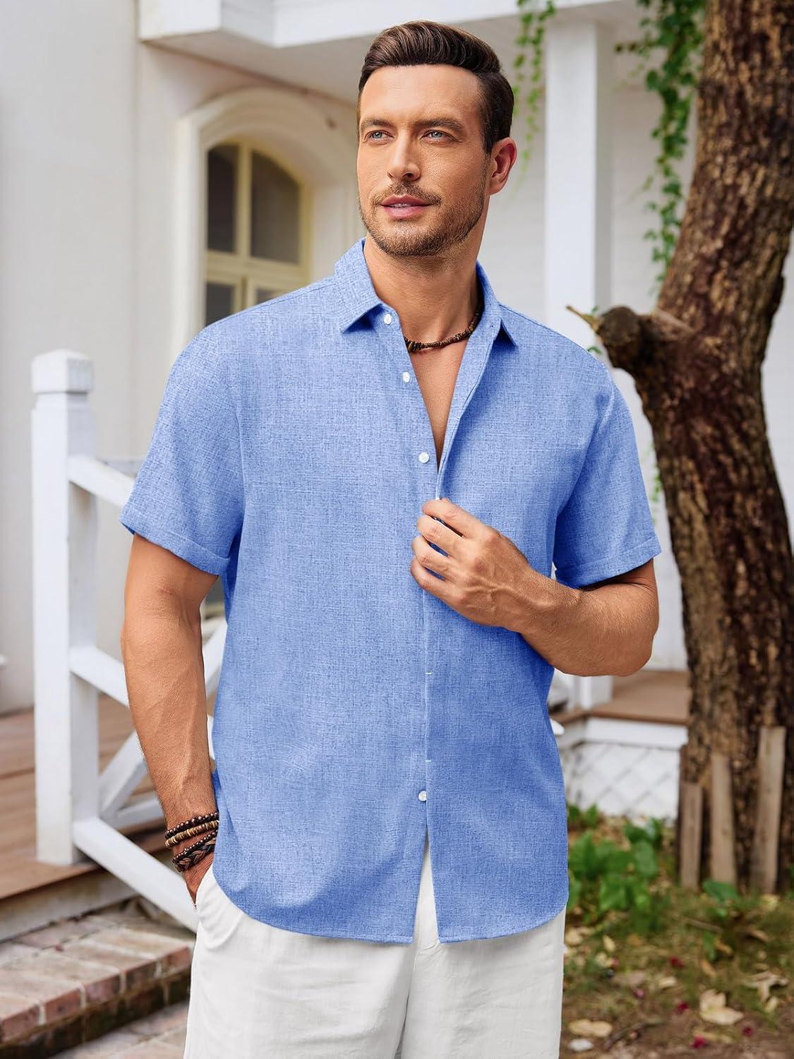 • Runcati Mens Short Sleeve Linen Shirts Button Down Casual Texture Summer Beach Wedding Tops(Light Blue)