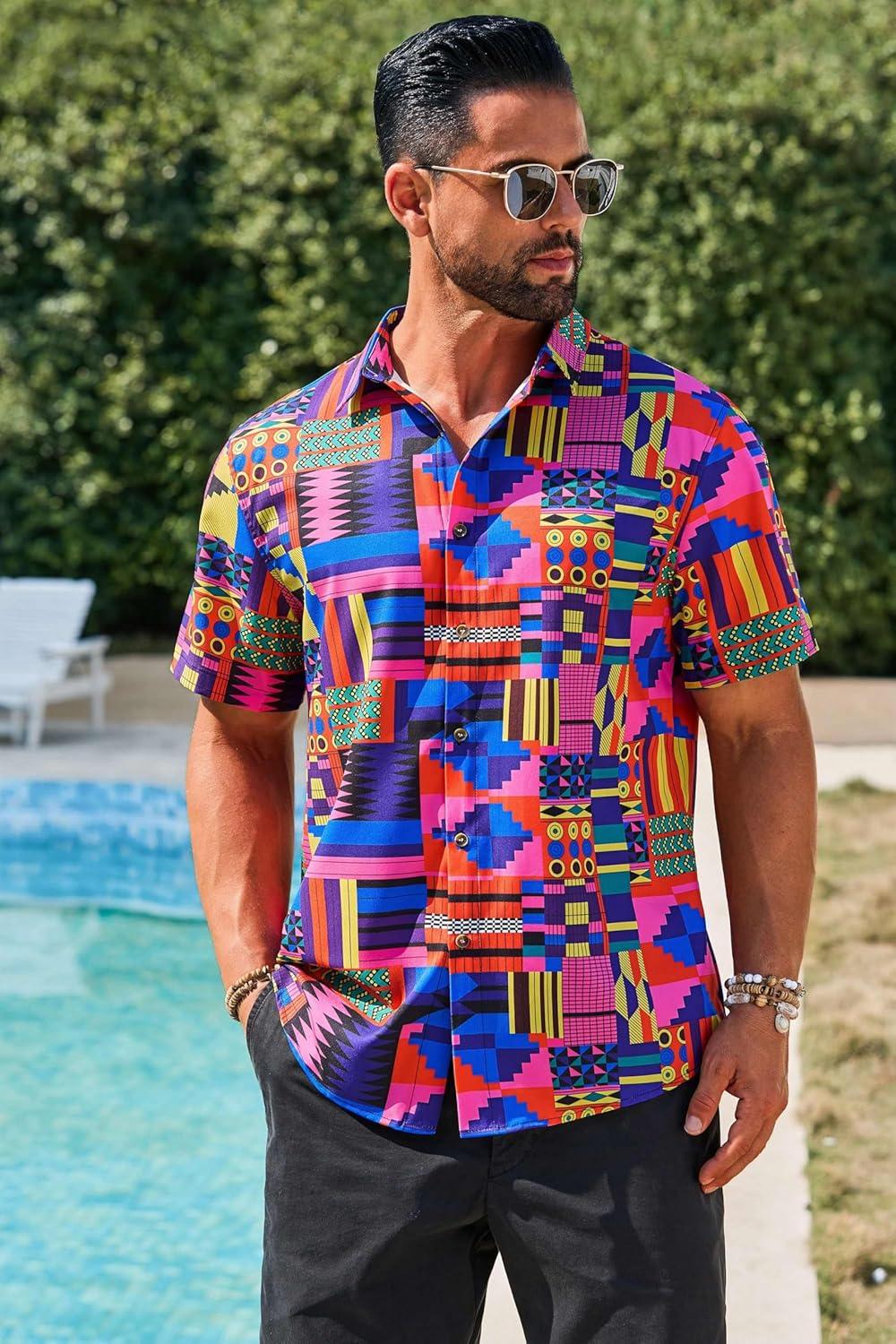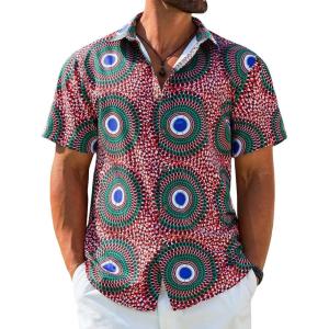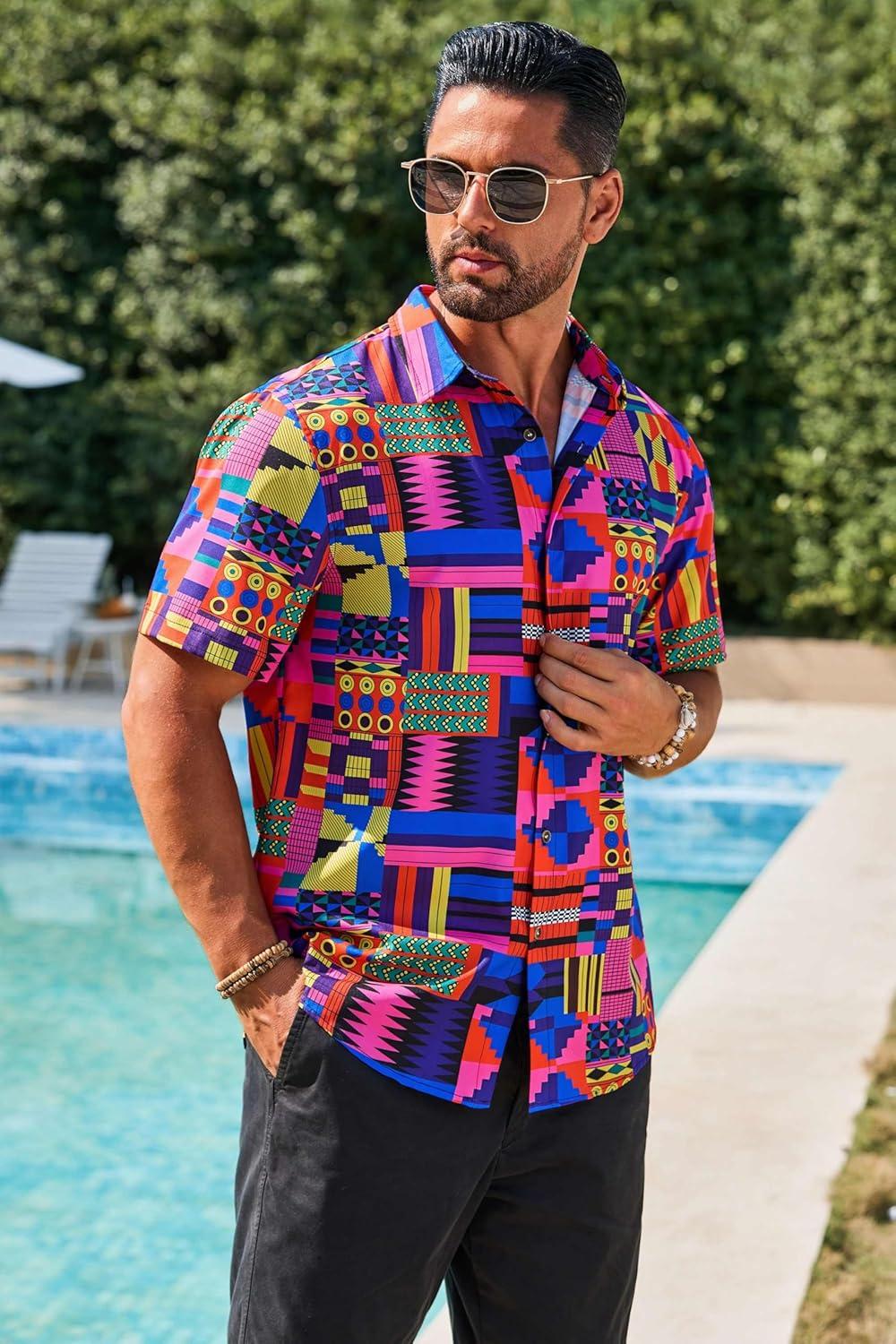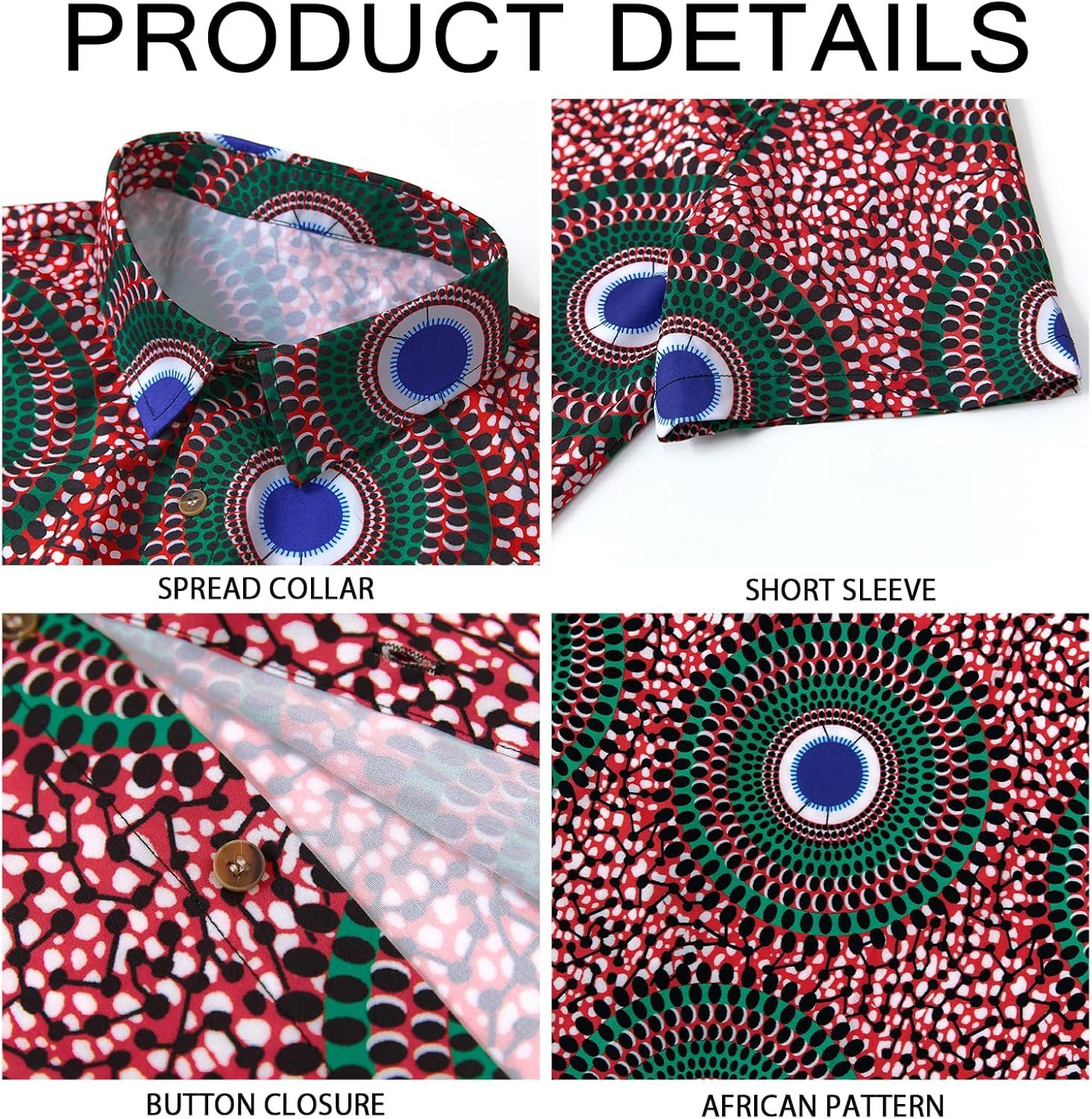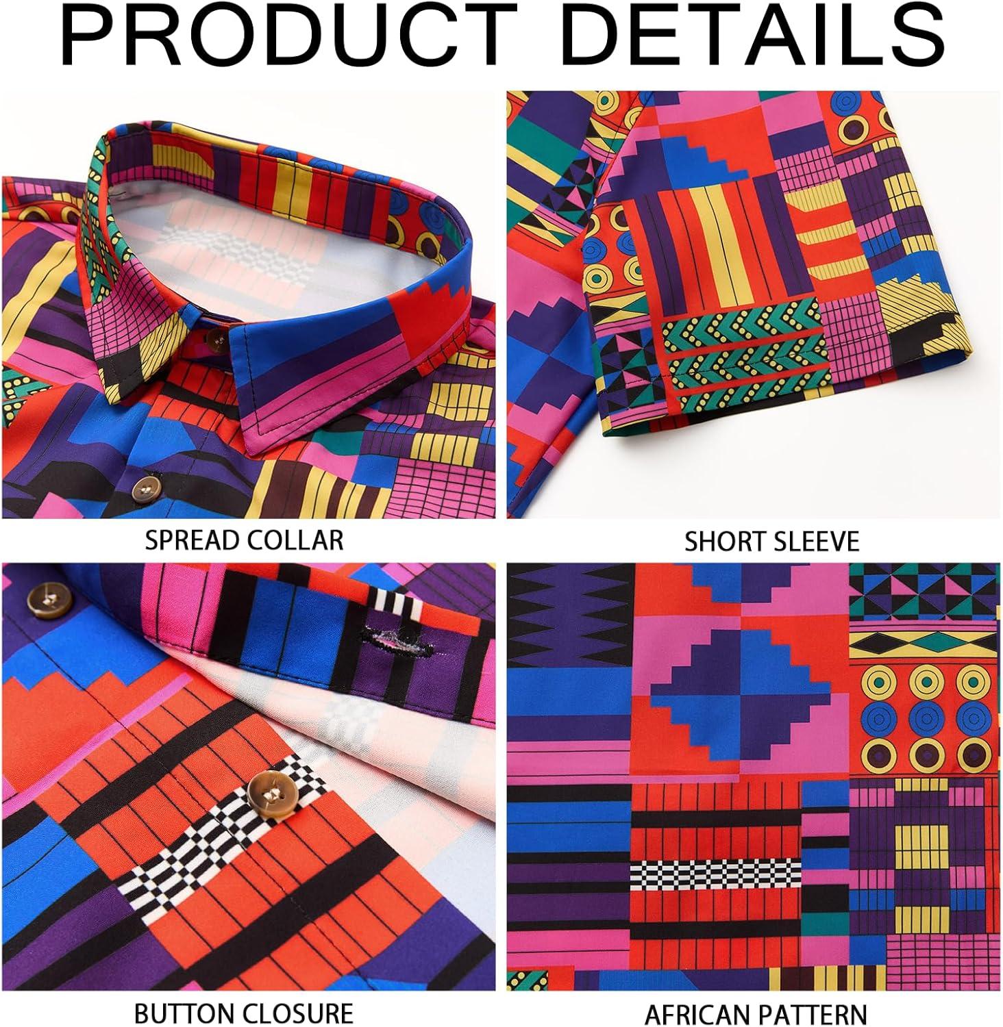 • Runcati Mens Short Sleeve Shirts Button Down African Traditional Pattern Dashiki Shirt Casual Vintage Floral Hippie Tops(Bright Pink)
