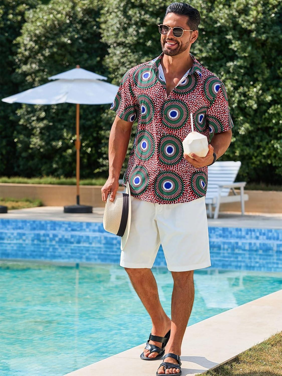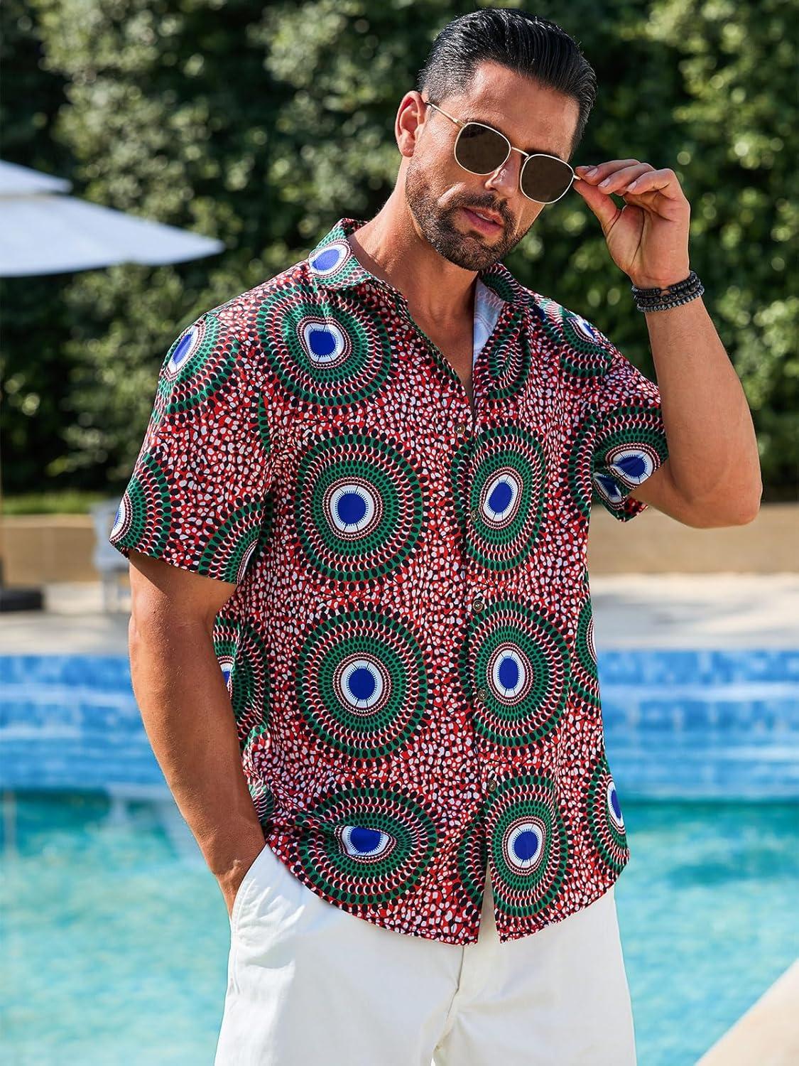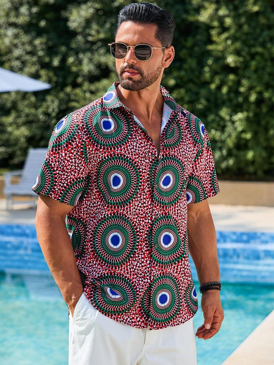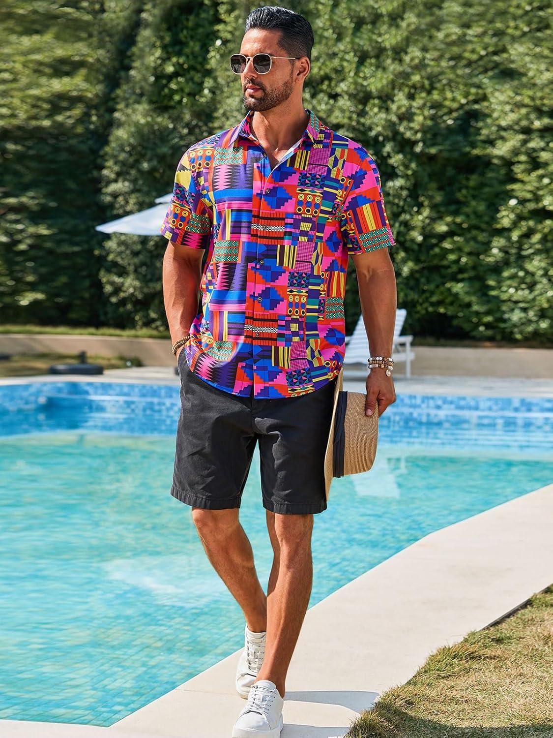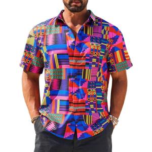 • Runcati Mens Short Sleeve Shirts Button Down African Traditional Pattern Dashiki Shirt Casual Vintage Floral Hippie Tops(Bright Pink)