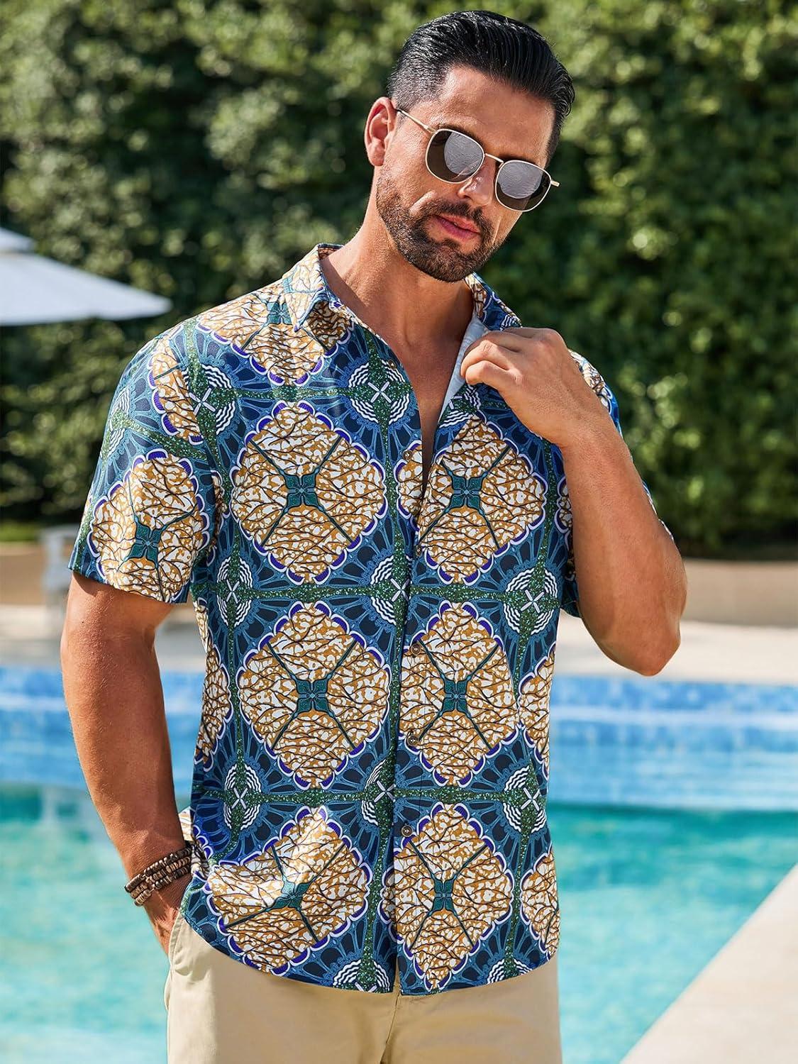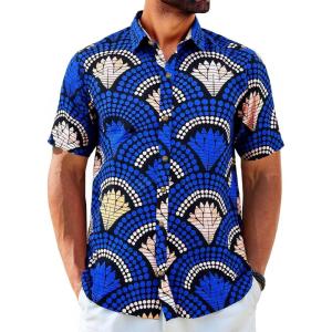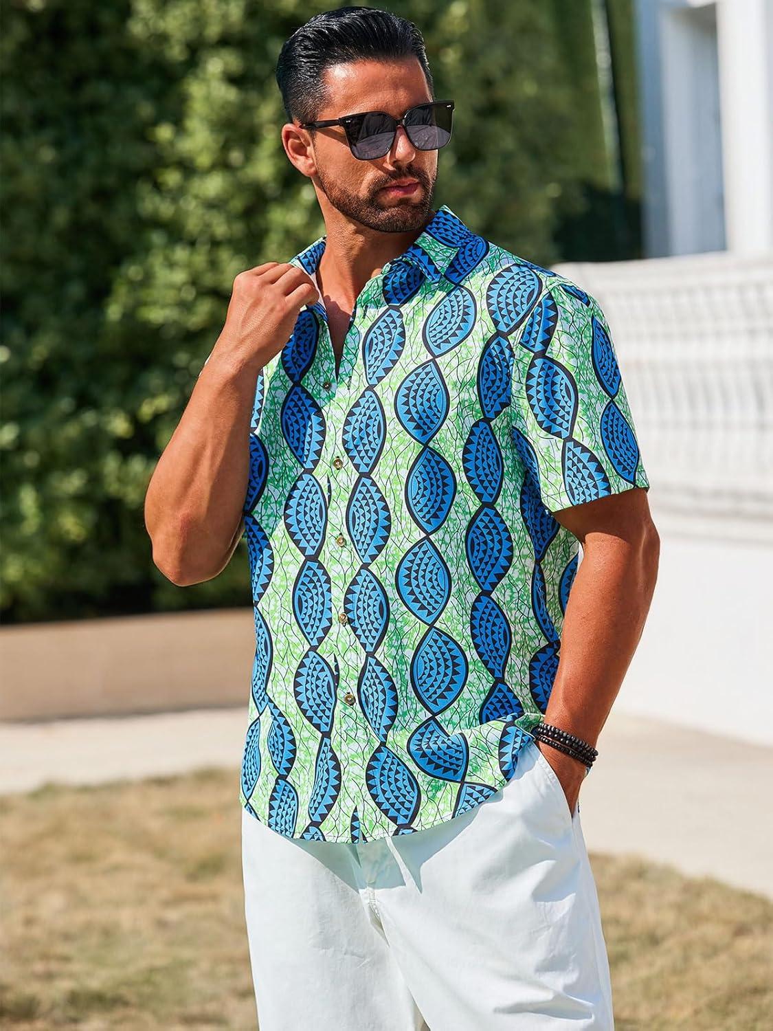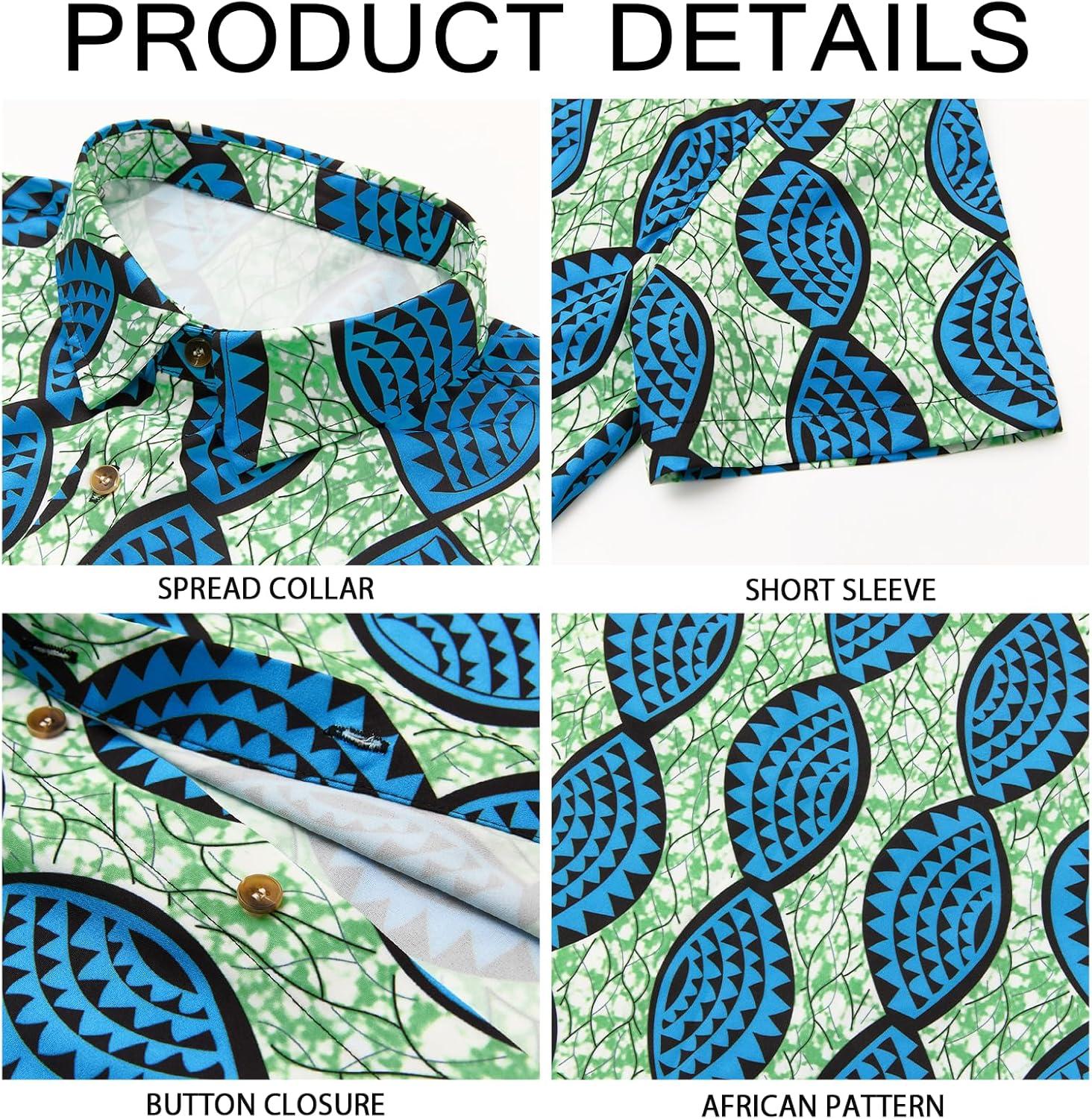 • Runcati Mens Short Sleeve Shirts Button Down African Traditional Pattern Dashiki Shirt Casual Vintage Floral Hippie Tops(Blue)