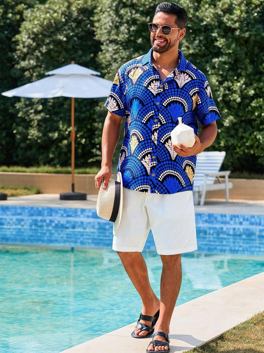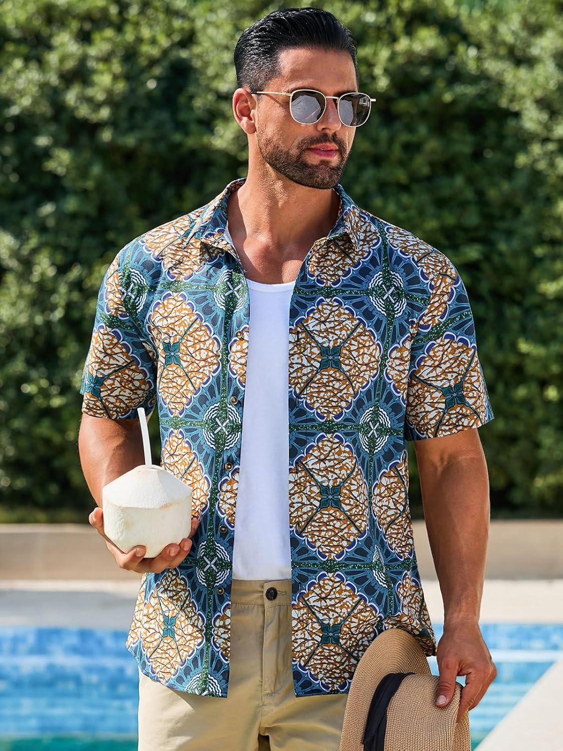 • Runcati Mens Short Sleeve Shirts Button Down African Traditional Pattern Dashiki Shirt Casual Vintage Floral Hippie Tops(Lake Blue)