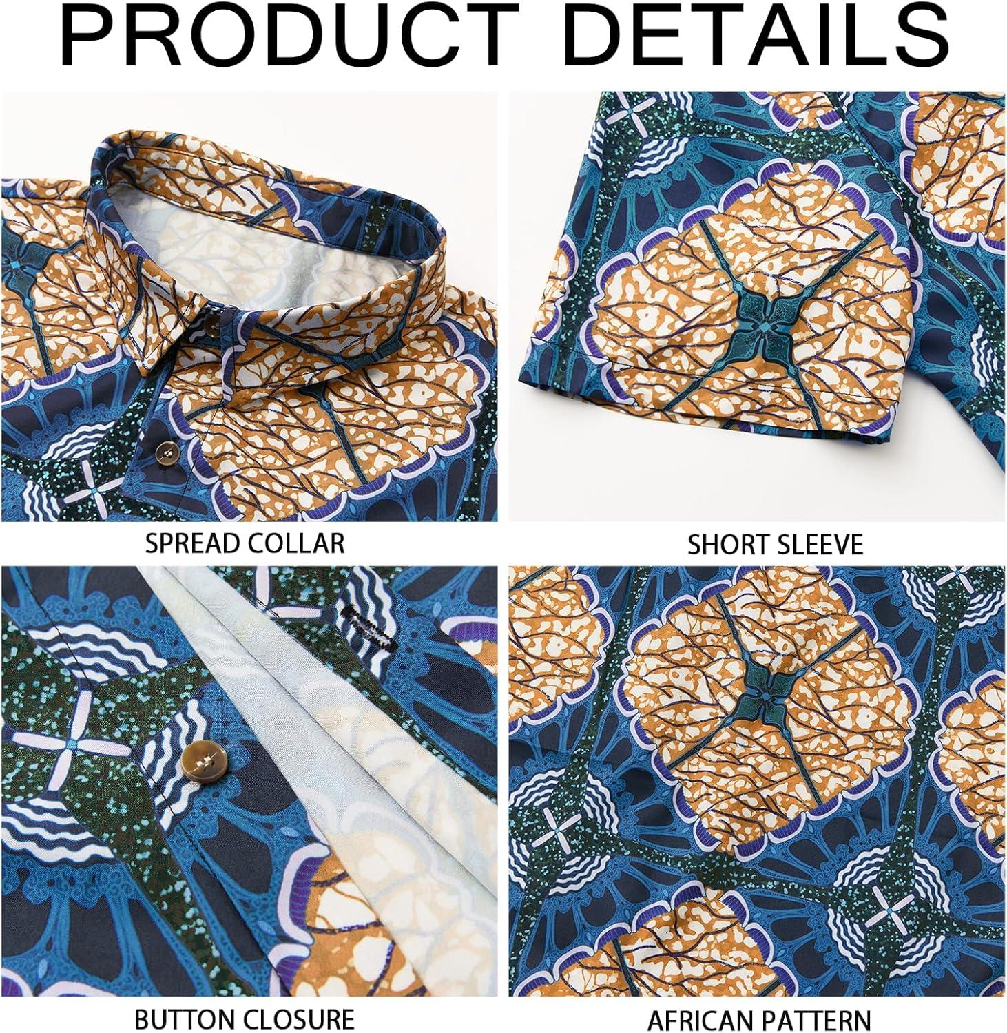 Runcati Mens Short Sleeve Shirts Button Down African Traditional Pattern Dashiki Shirt Casual Vintage Floral Hippie Tops(Blue)