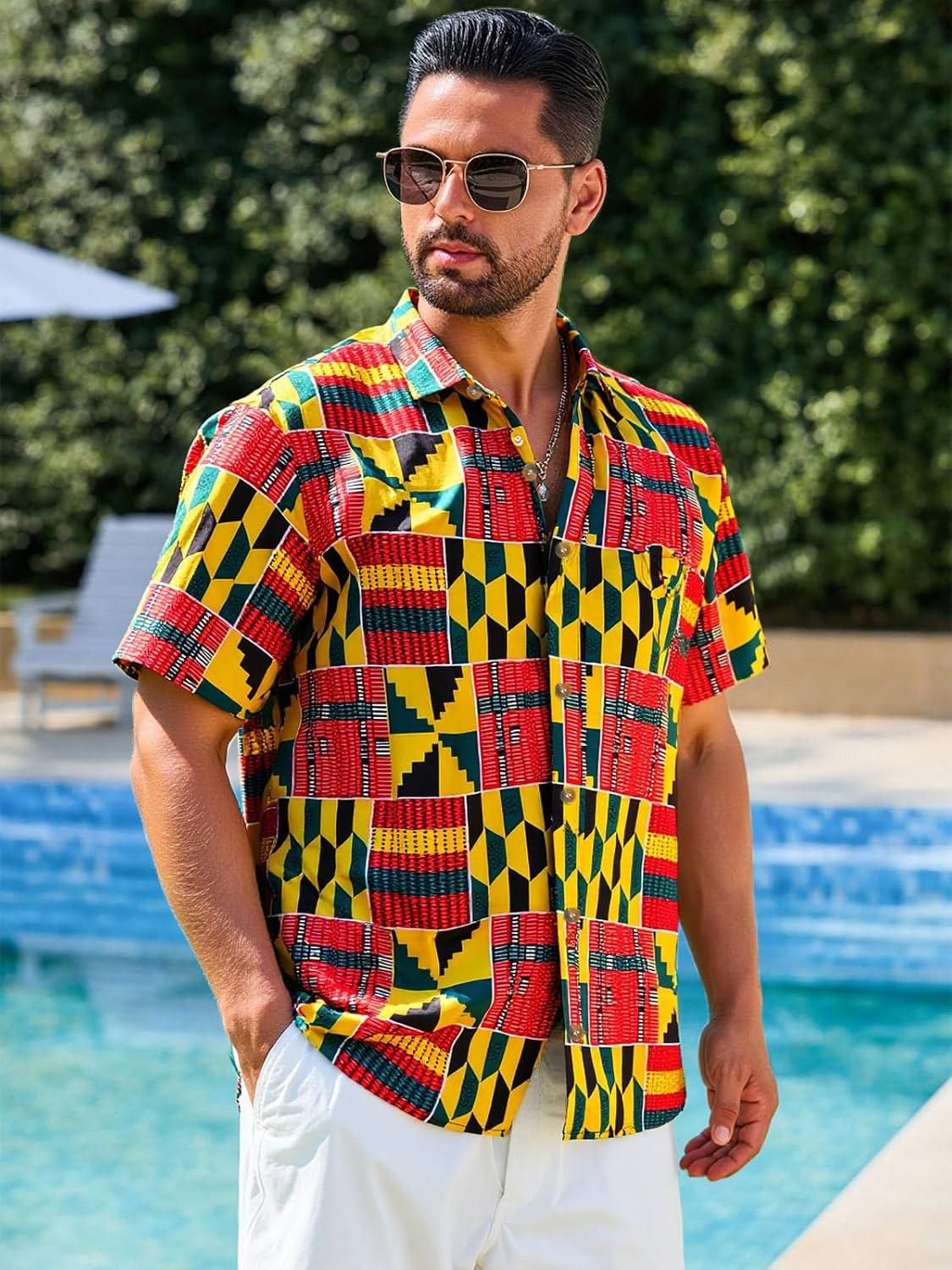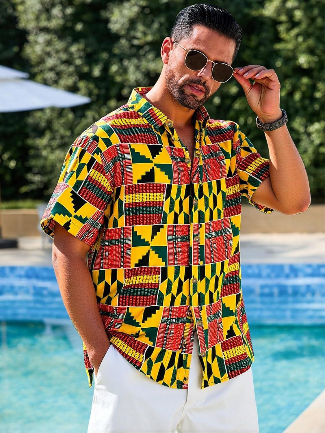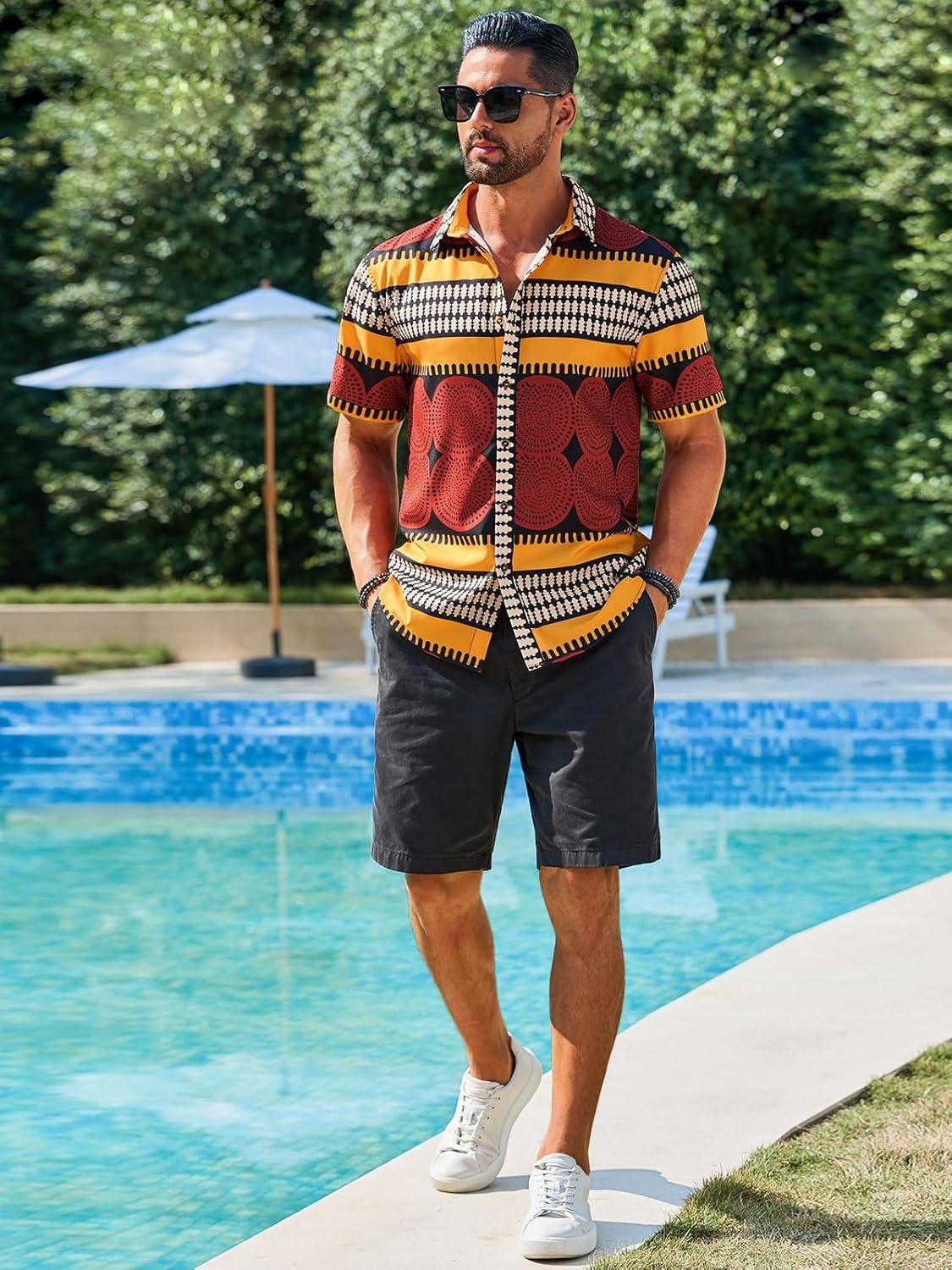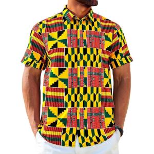 • Runcati Mens Short Sleeve Shirts Button Down African Traditional Pattern Dashiki Shirt Casual Vintage Floral Hippie Tops(Yellow)
