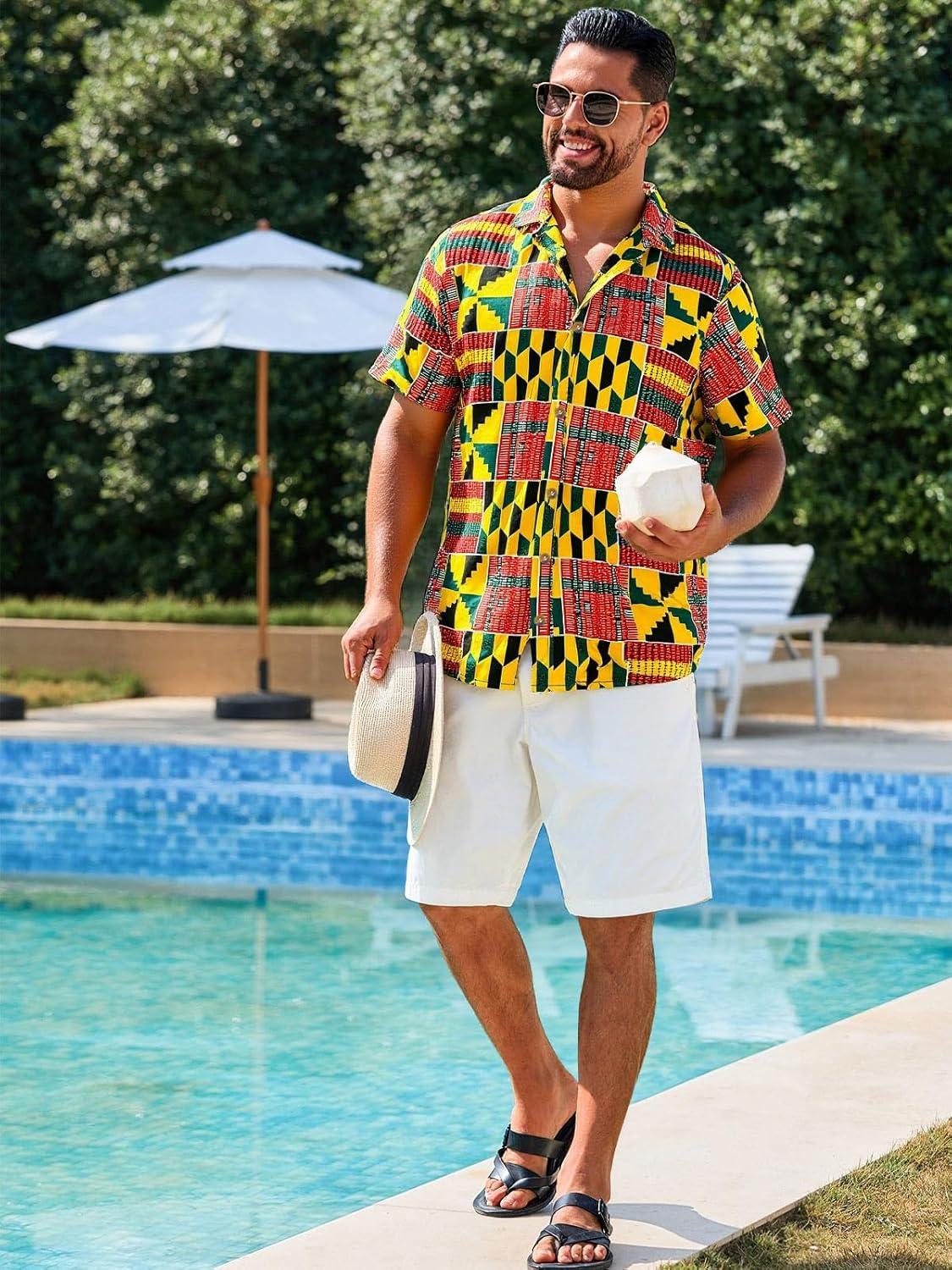 • Runcati Mens Short Sleeve Shirts Button Down African Traditional Pattern Dashiki Shirt Casual Vintage Floral Hippie Tops(Yellow Green)