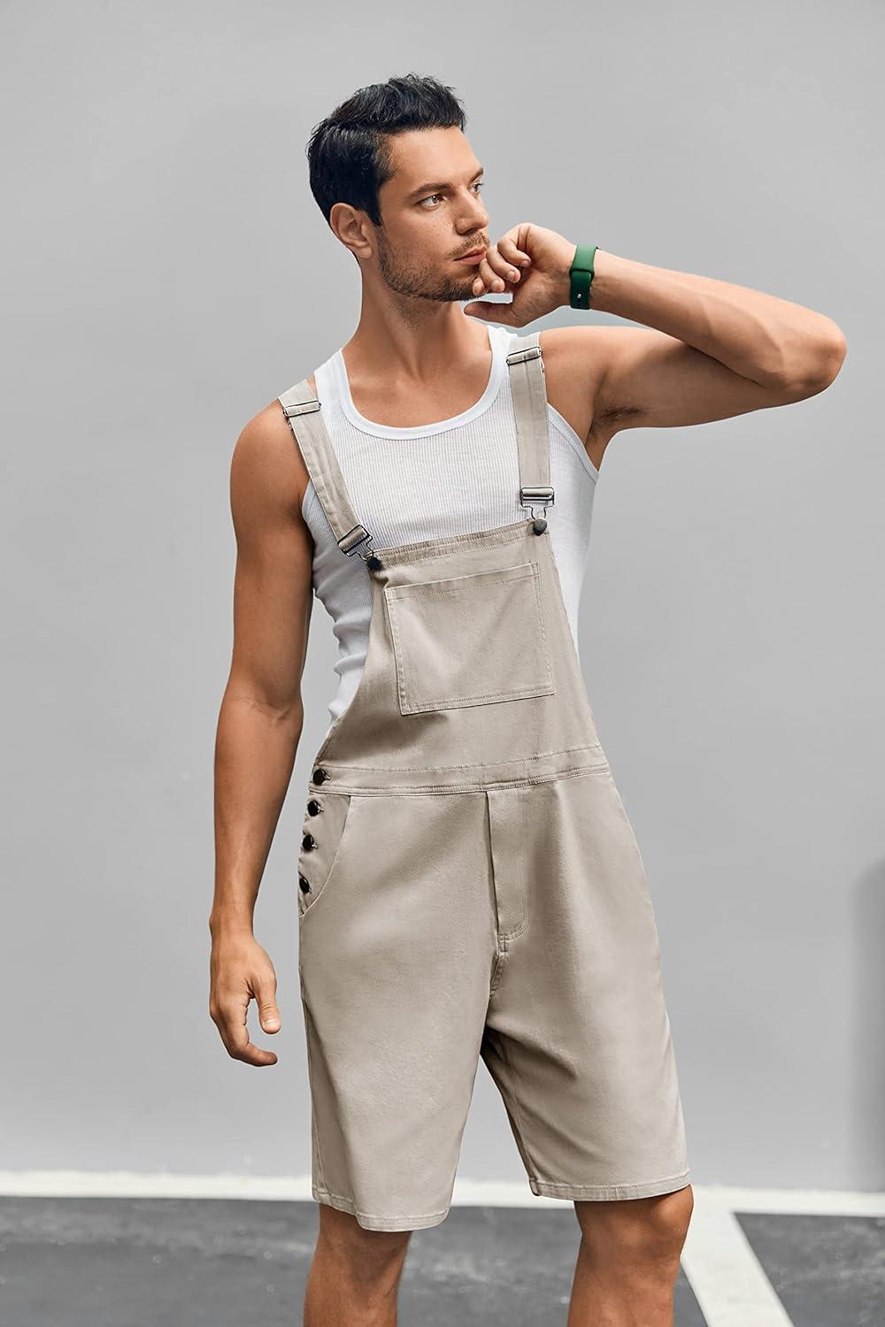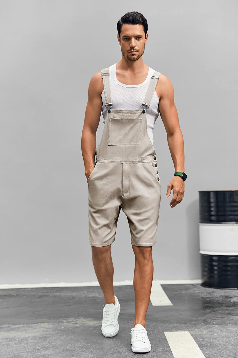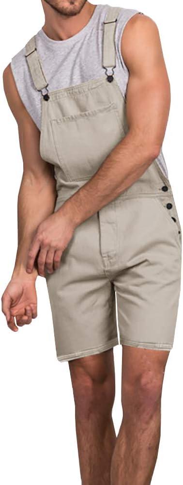Runcati Mens Casual Bib Overall Shorts Lightweight Cotton Loose Fit Denim Jumpersuit Walkshort Pockets Rompers(Beige)