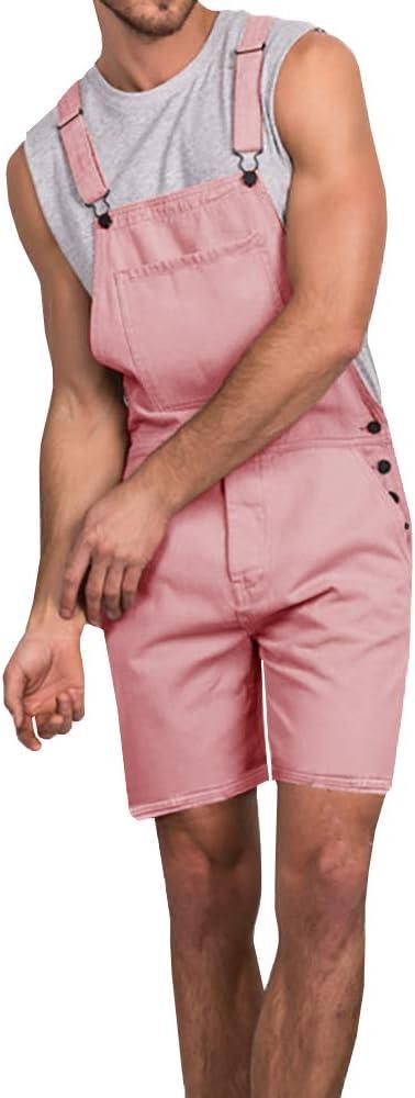 Runcati Mens Casual Bib Overall Shorts Lightweight Cotton Loose Fit Denim Jumpersuit Walkshort Pockets Rompers(Pink)
