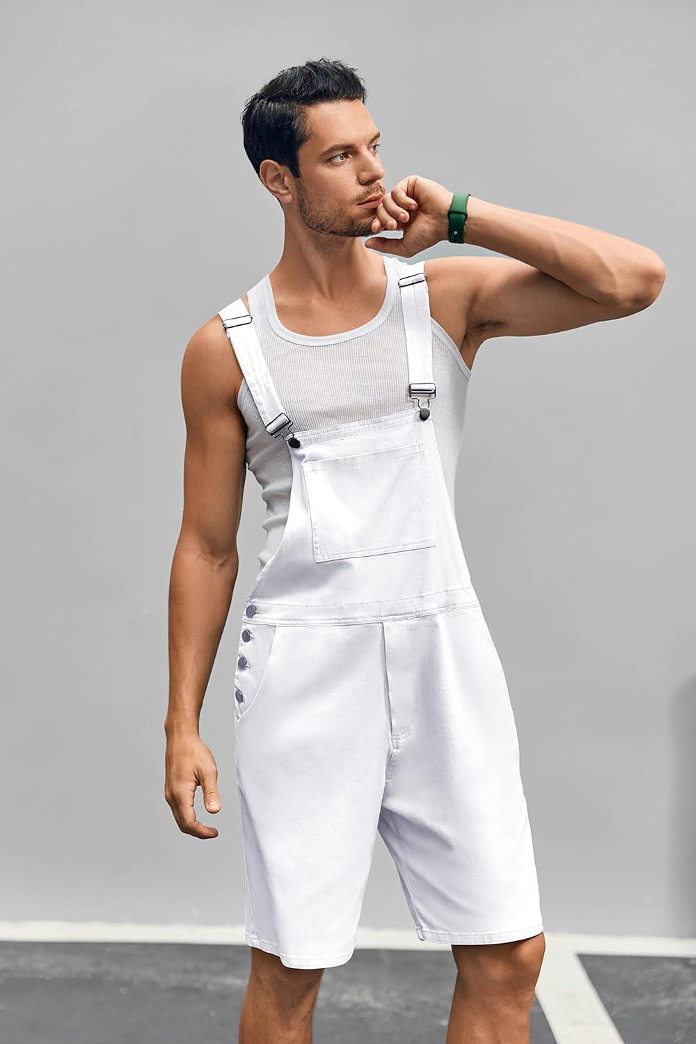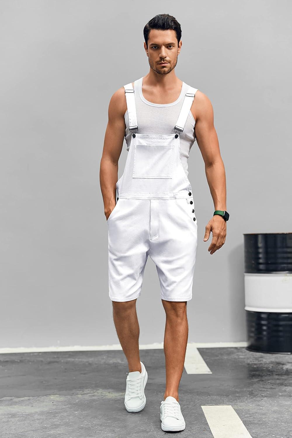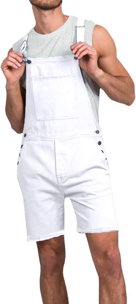 Runcati Mens Casual Bib Overall Shorts Lightweight Cotton Loose Fit Denim Jumpersuit Walkshort Pockets Rompers(White)