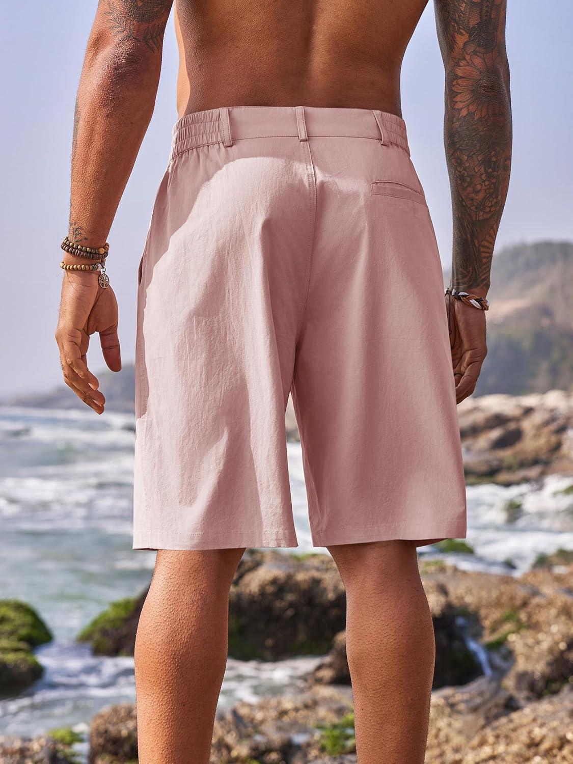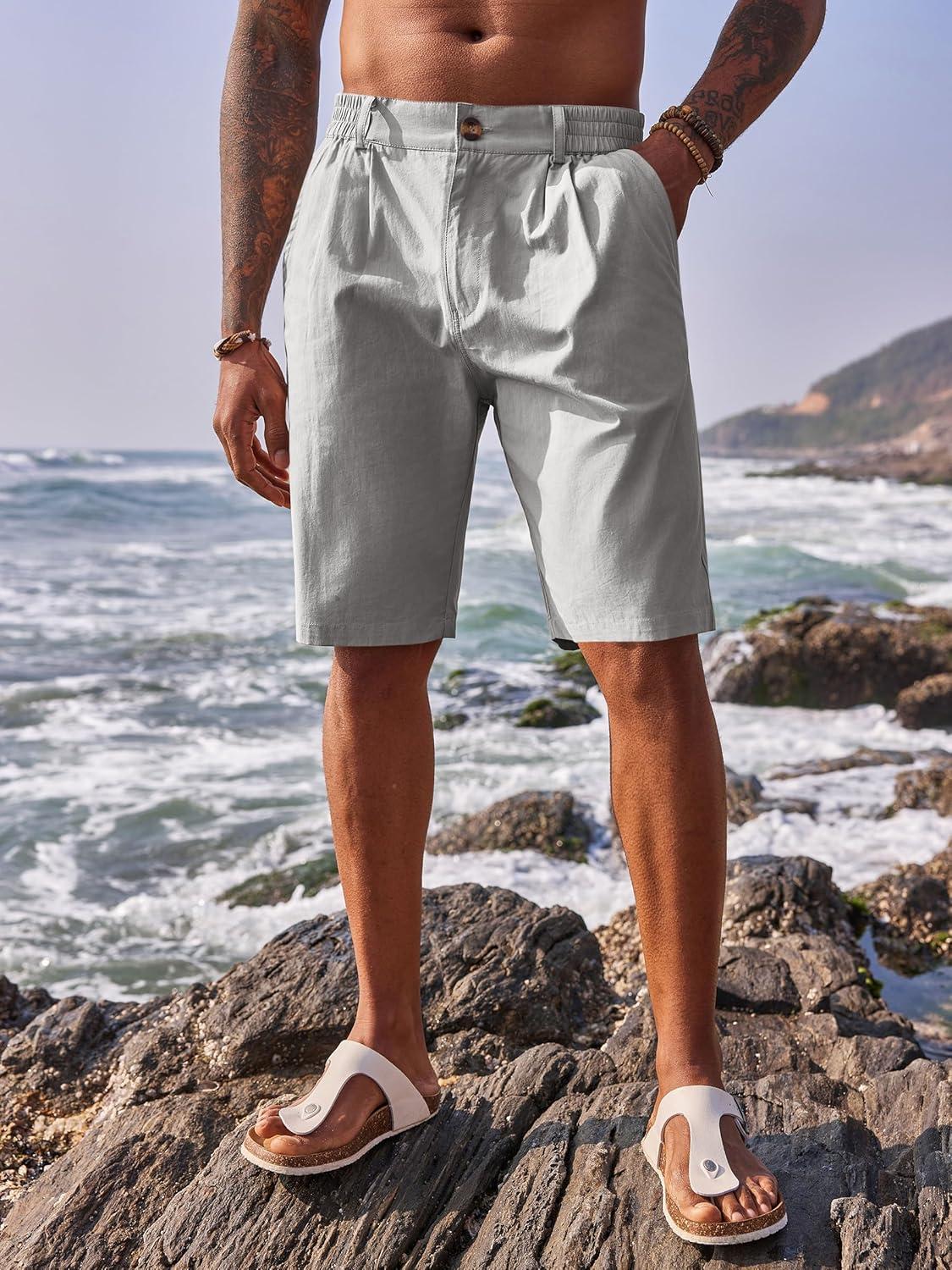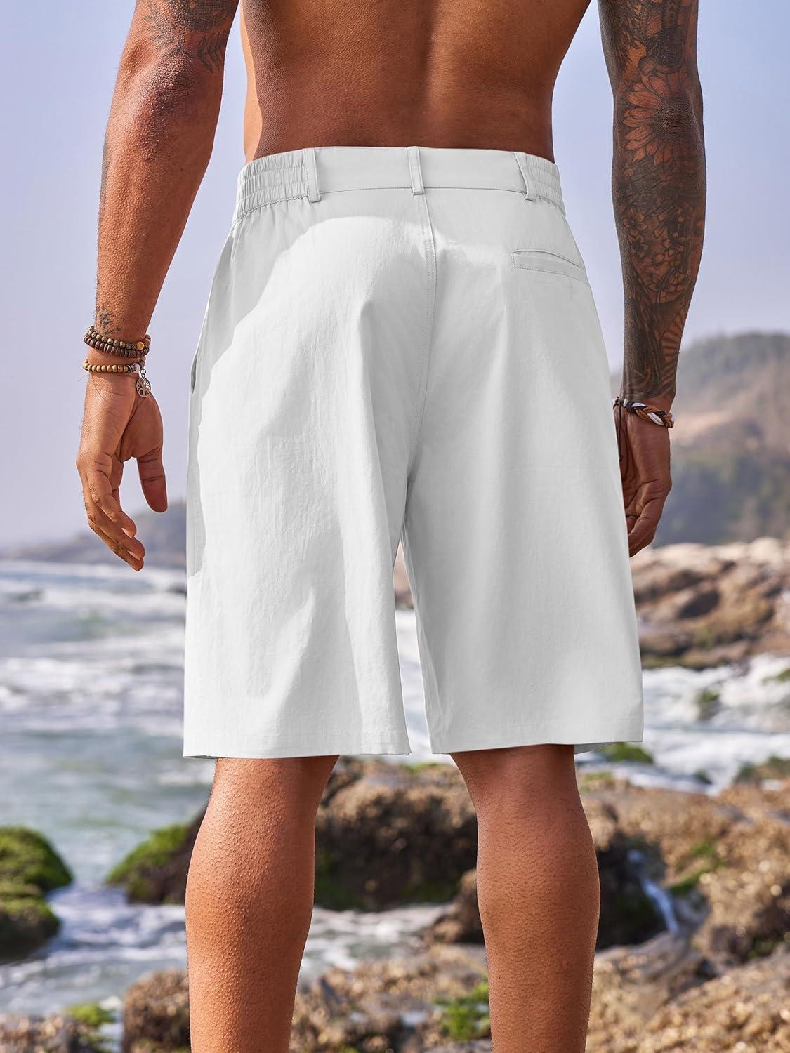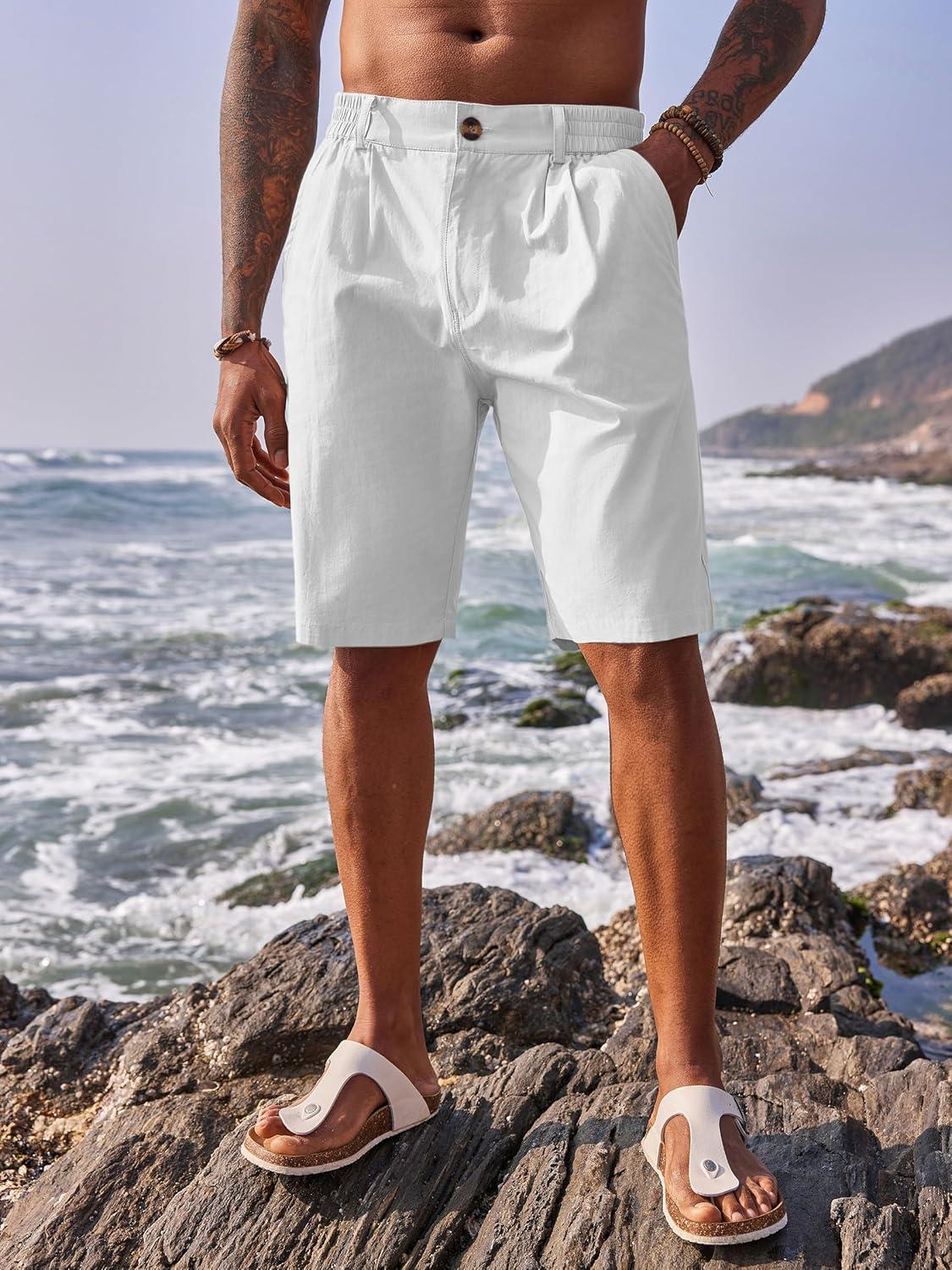 Runcati Mens Cotton Linen Flat Front Shorts Button Up Closure Elastic Waist Regular Fit Summer Beach Shorts