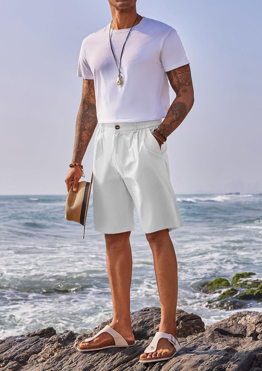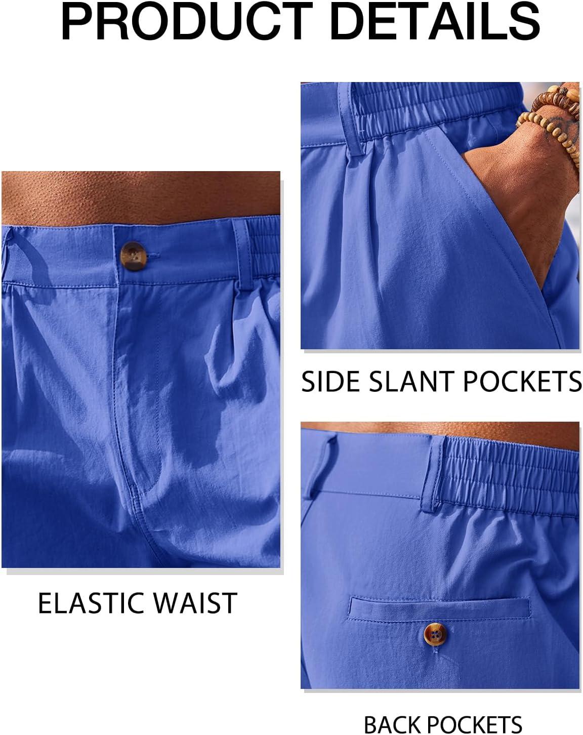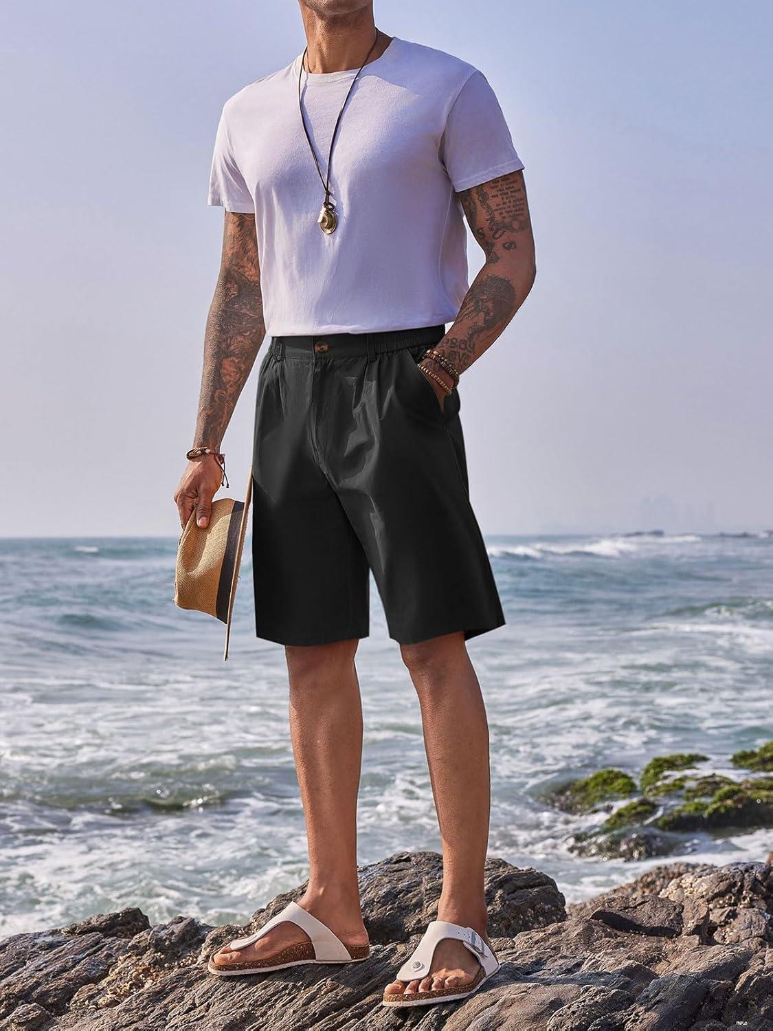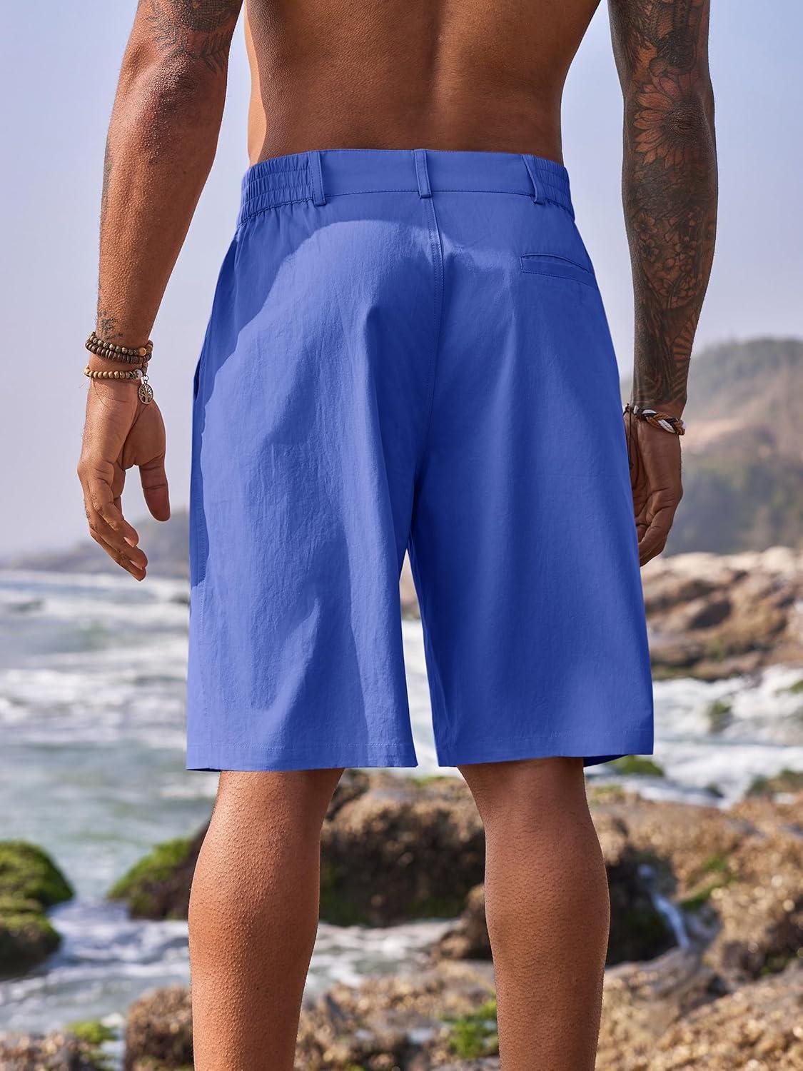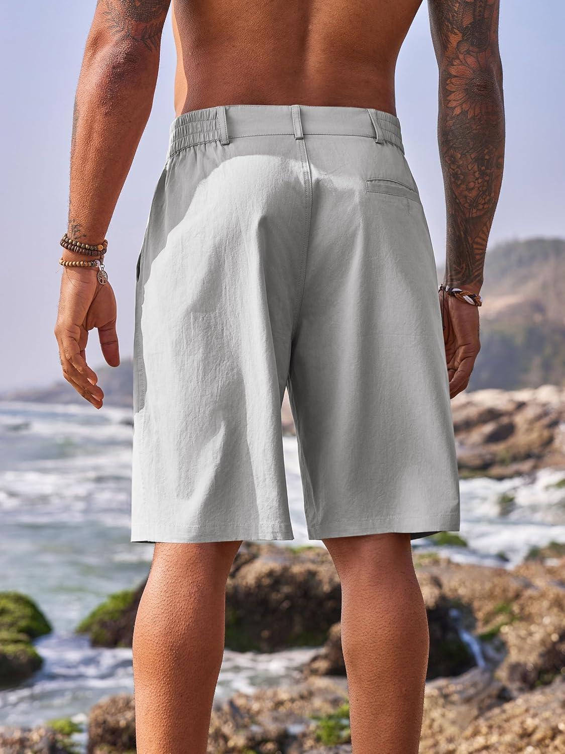 Runcati Mens Cotton Linen Flat Front Shorts Button Up Closure Elastic Waist Regular Fit Summer Beach Shorts