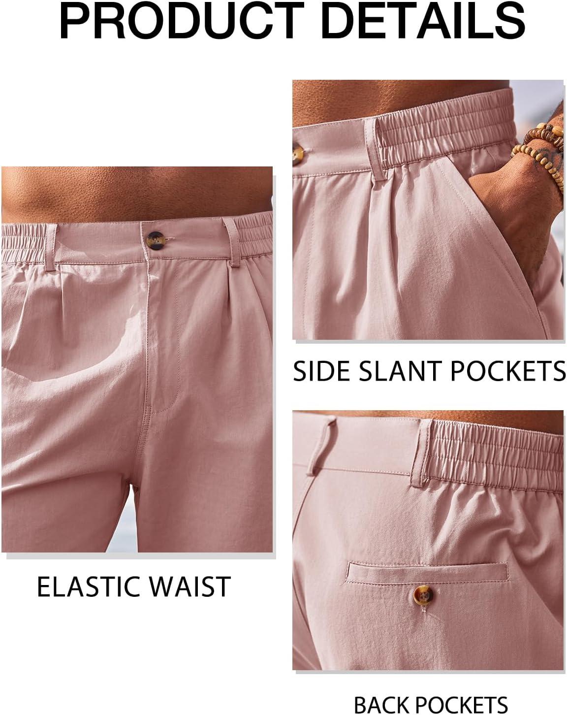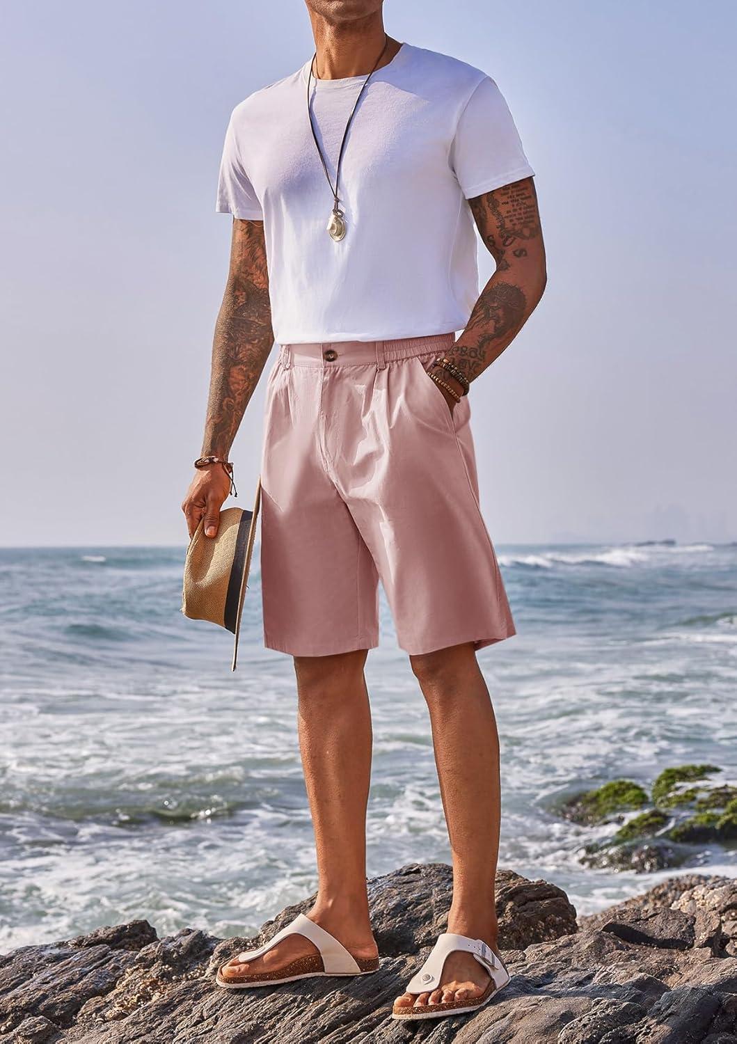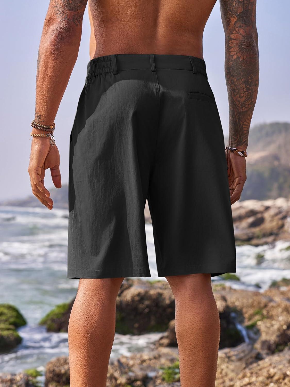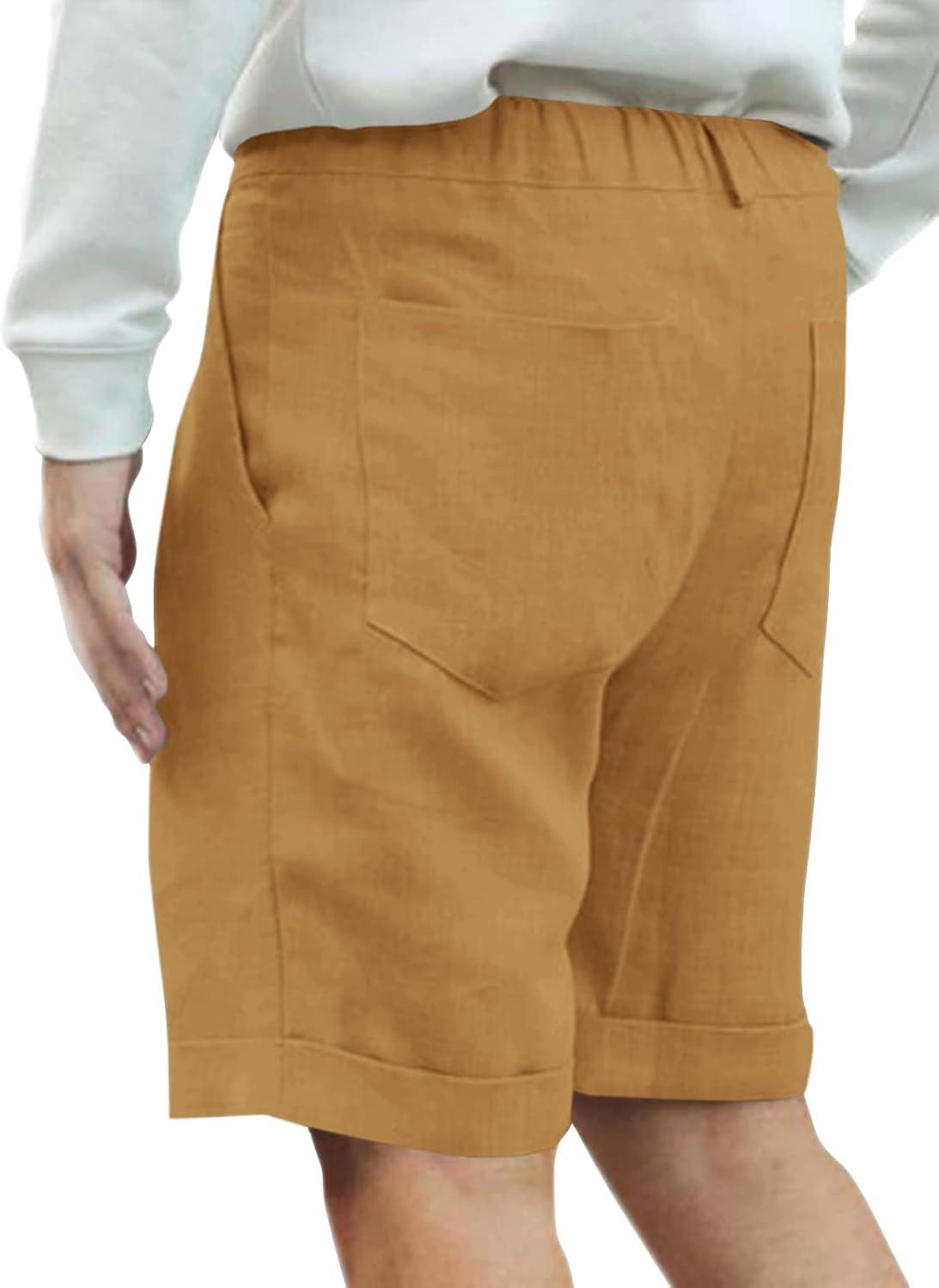 Runcati Mens Cotton Linen Flat Front Shorts Button Up Closure Elastic Waist Regular Fit Summer Beach Shorts