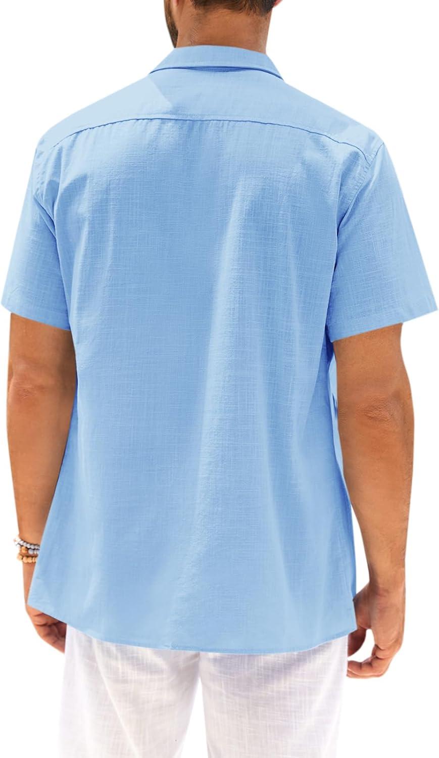 Runcati Mens Hawaiian Shirt Short Sleeve Button Down Summer Beach Vacation Cotton Linen Shirts(Blue)