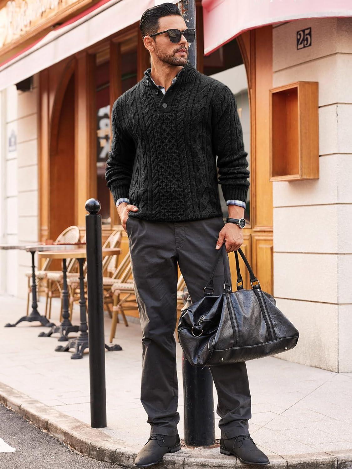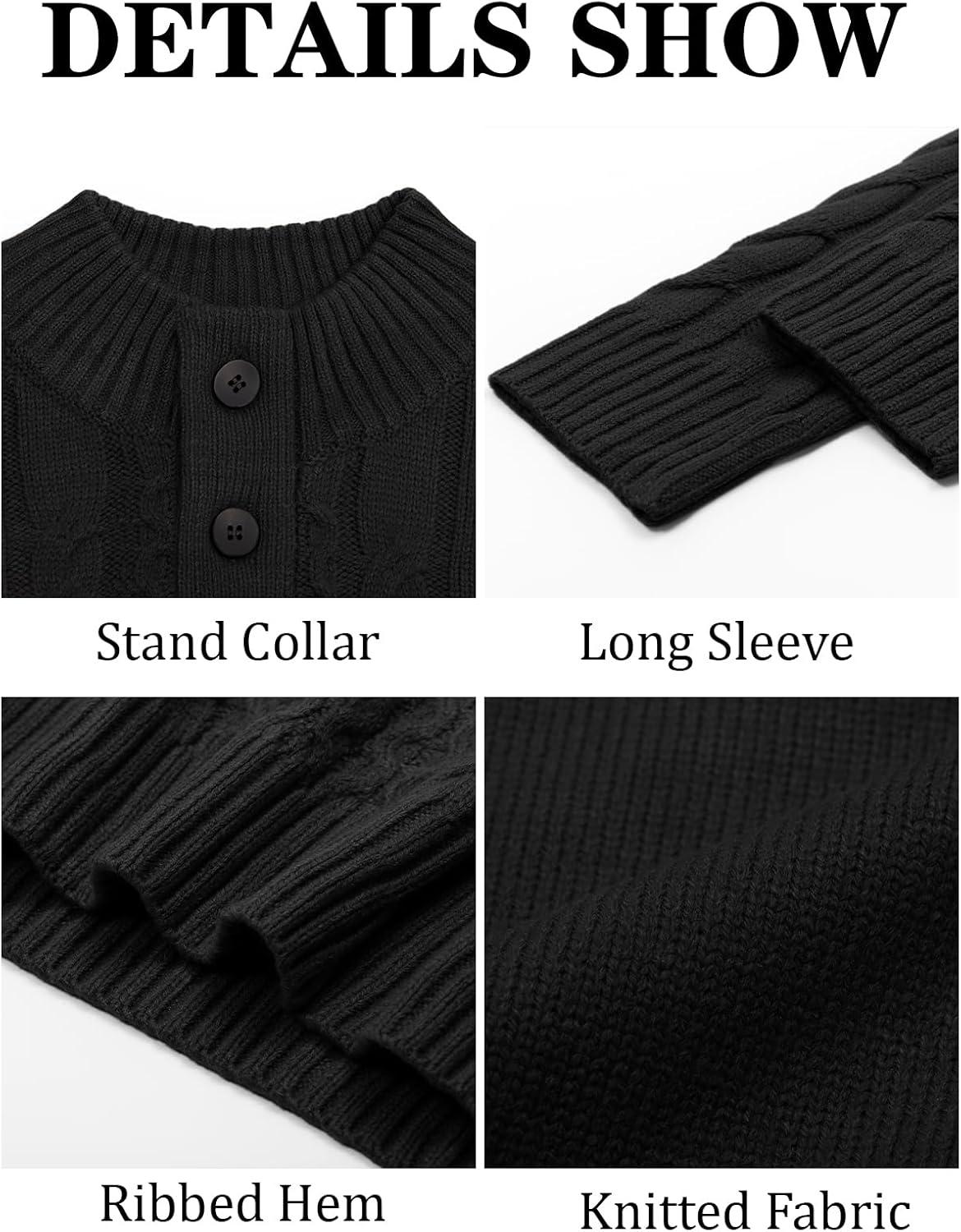 Runcati Mens Cable Knit Pullover Sweater Casual Stand Collar Chunky Buttons Fall Winter Sweaters(Black)