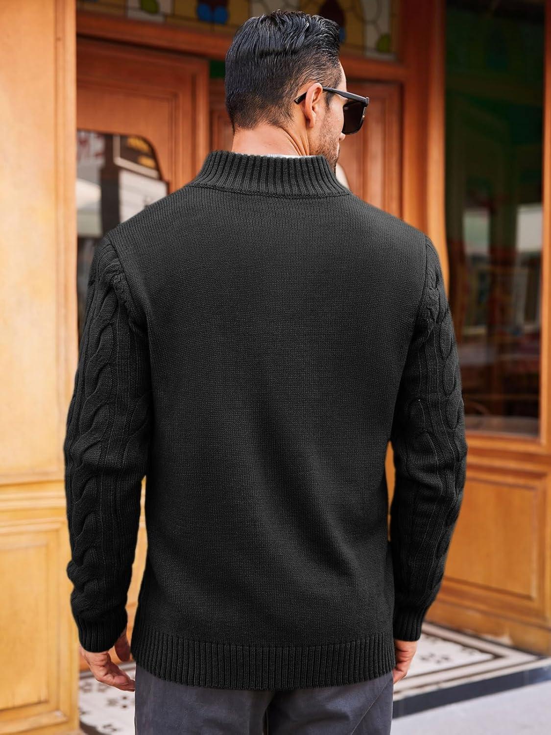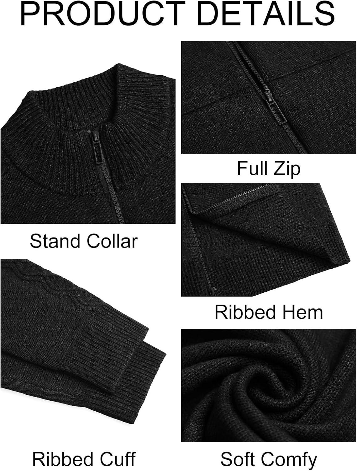 Runcati Mens Full Zip Cardigan Sweater Casual Mock Neck Cable Knitted Winter Chunky Sweaters(Black)