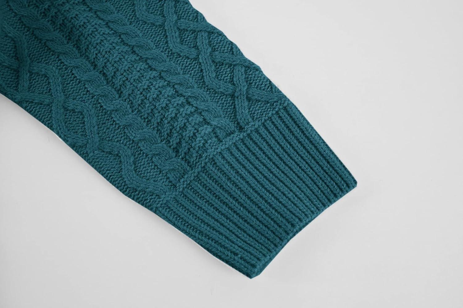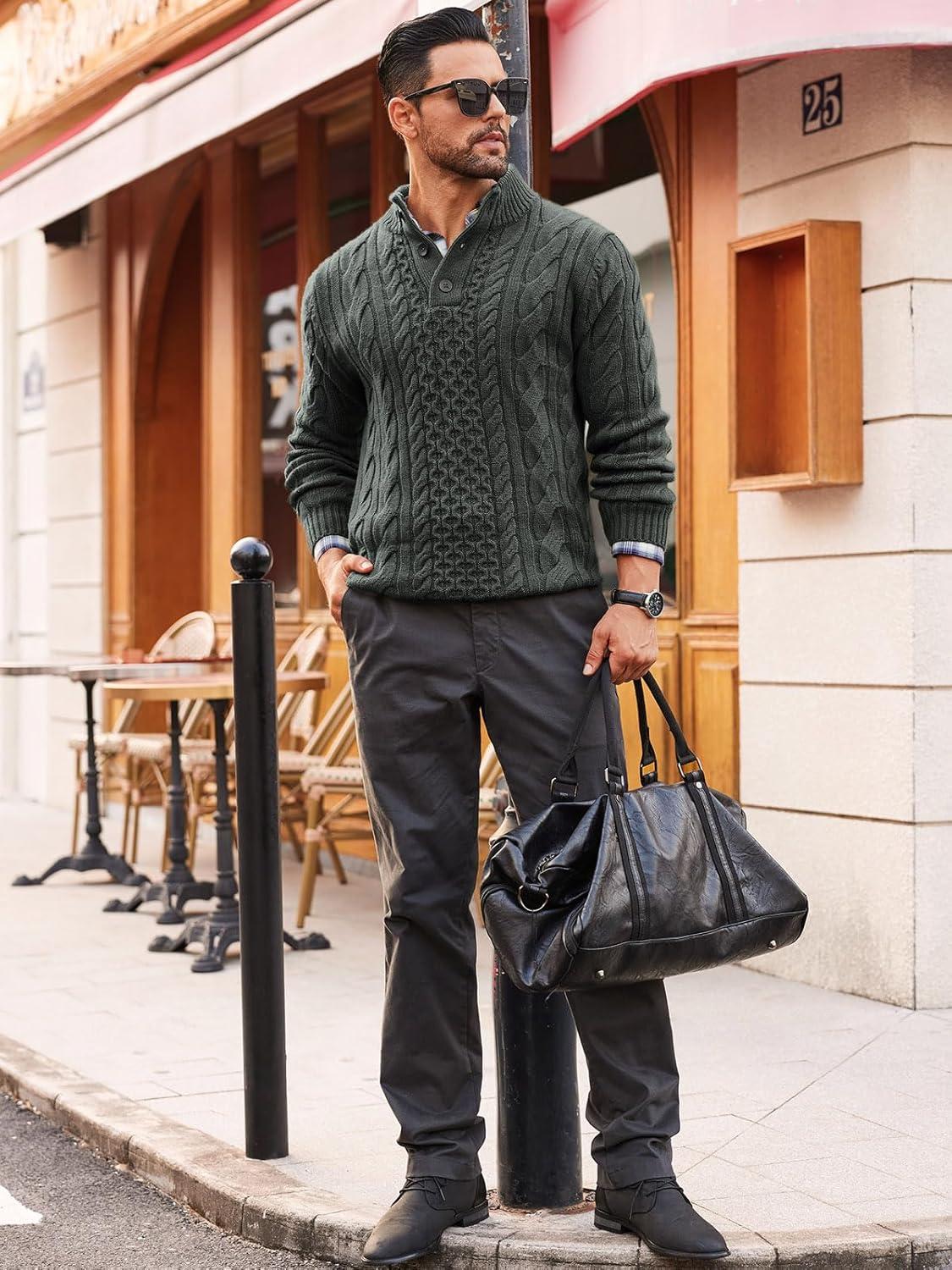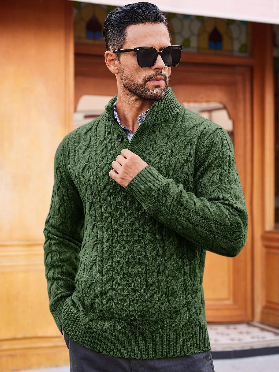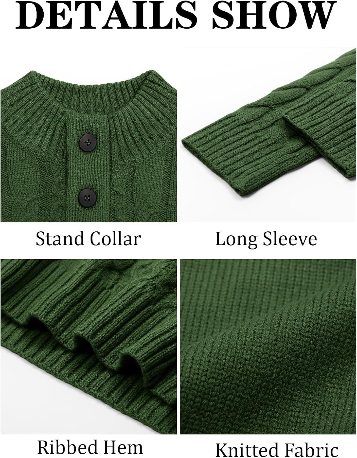 Runcati Mens Cable Knit Pullover Sweater Casual Stand Collar Chunky Buttons Fall Winter Sweaters(Green)