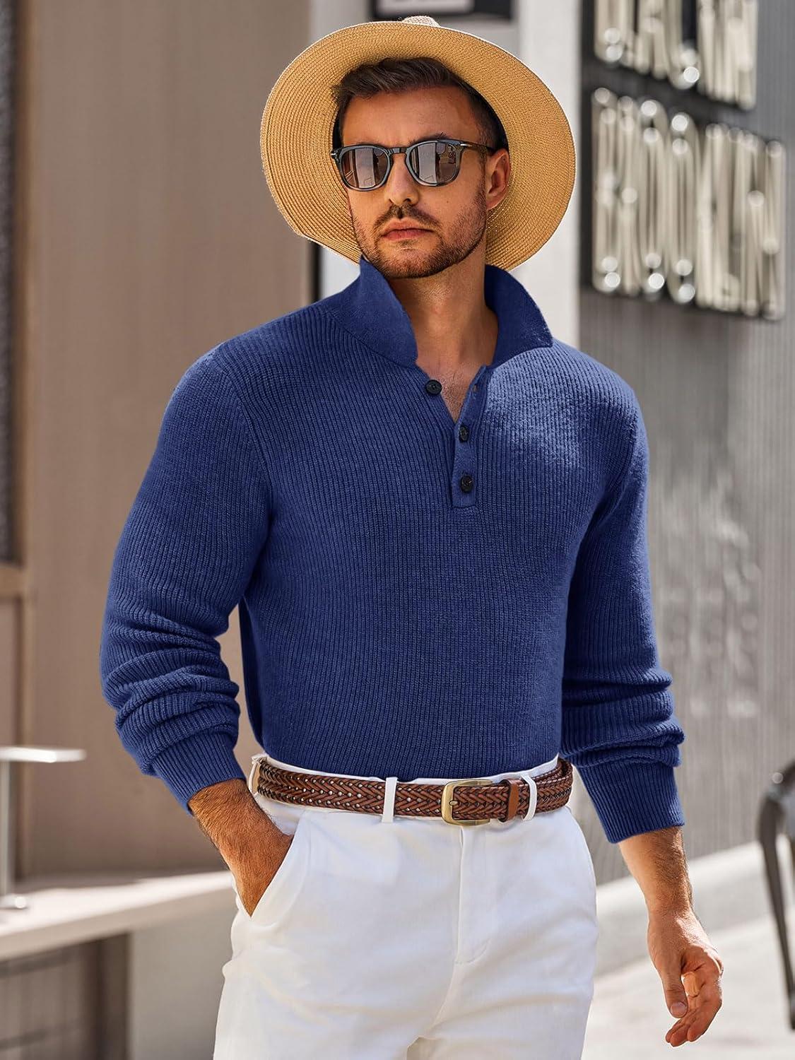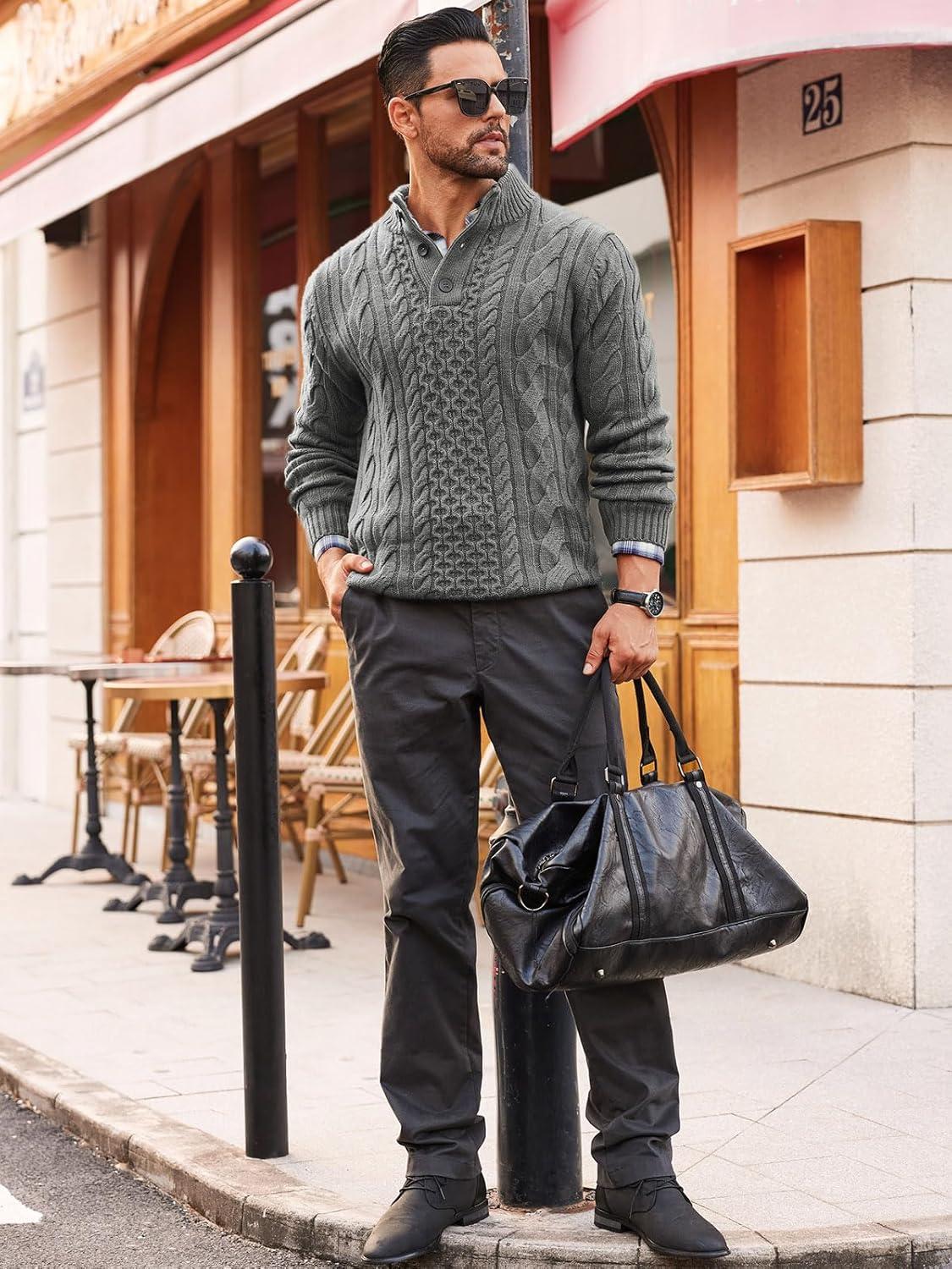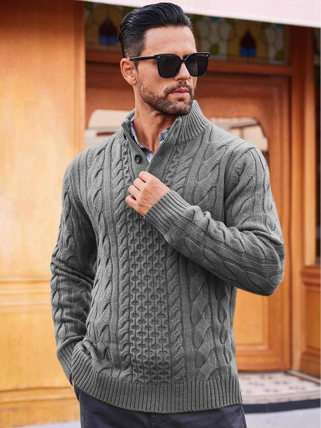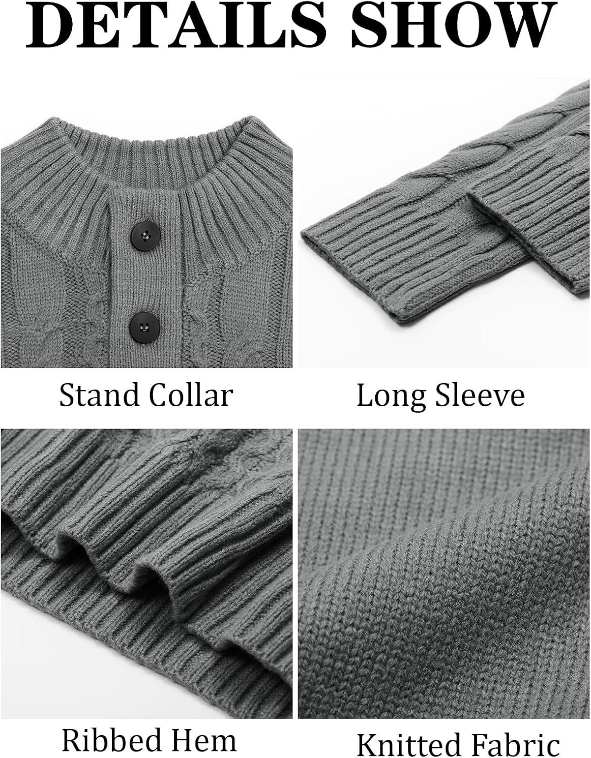 Runcati Mens Cable Knit Pullover Sweater Casual Stand Collar Chunky Buttons Fall Winter Sweaters(Grey)