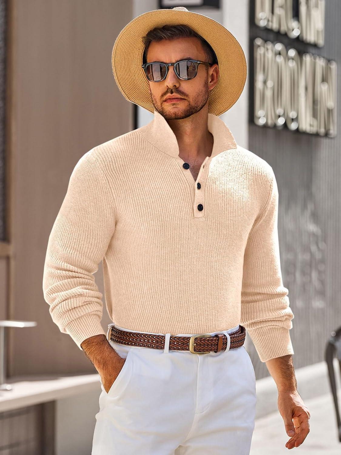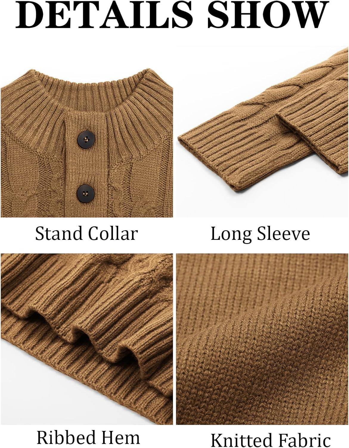 Runcati Mens Cable Knit Pullover Sweater Casual Stand Collar Chunky Buttons Fall Winter Sweaters(Khaki)