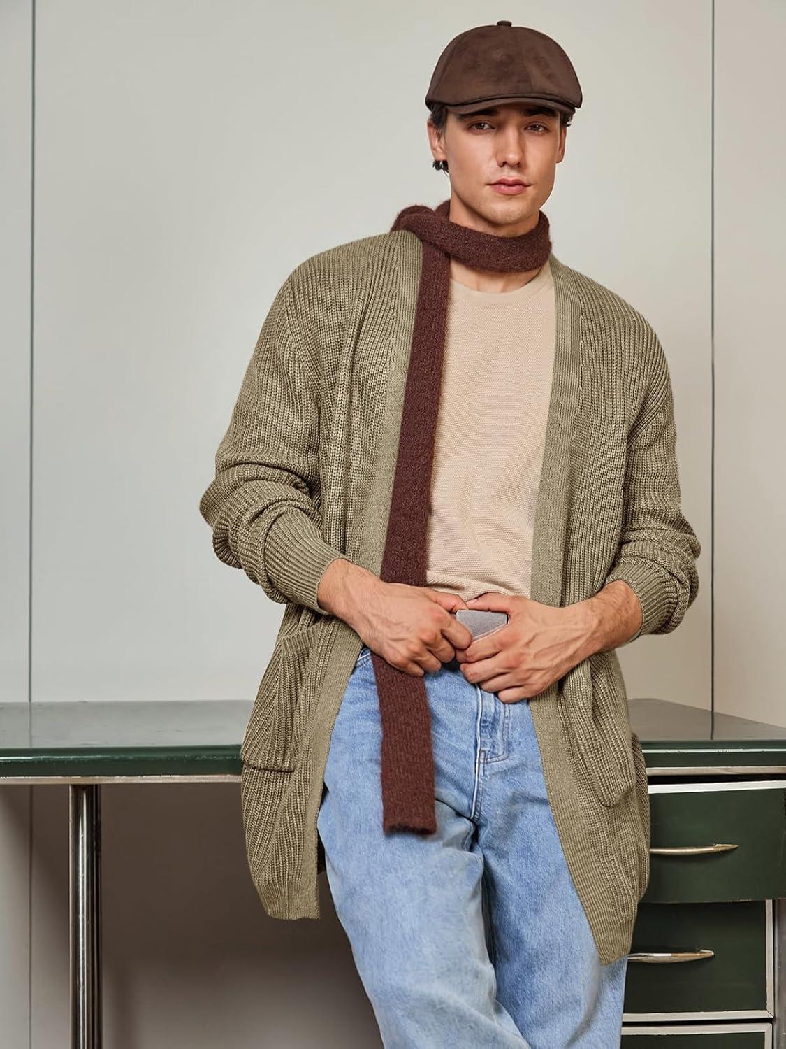 Runcati Mens Cardigan Sweater Casual Cable Knit V Neck Open Front Ribbed Long Winter Sweaters(Army Green)