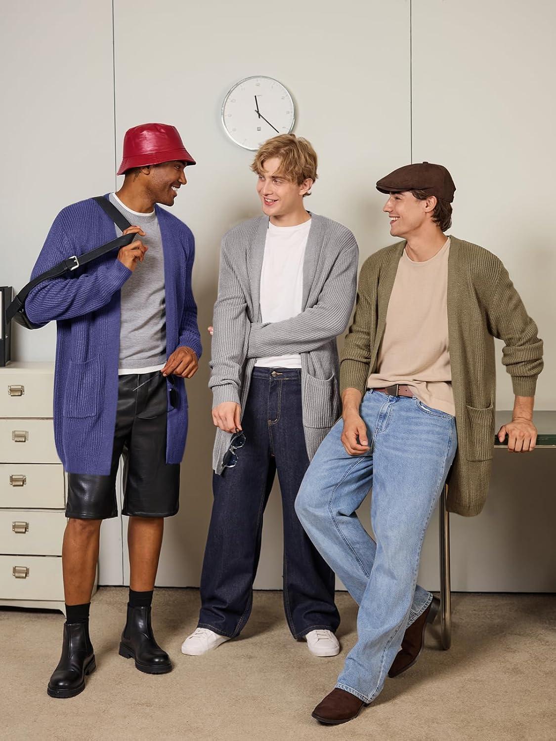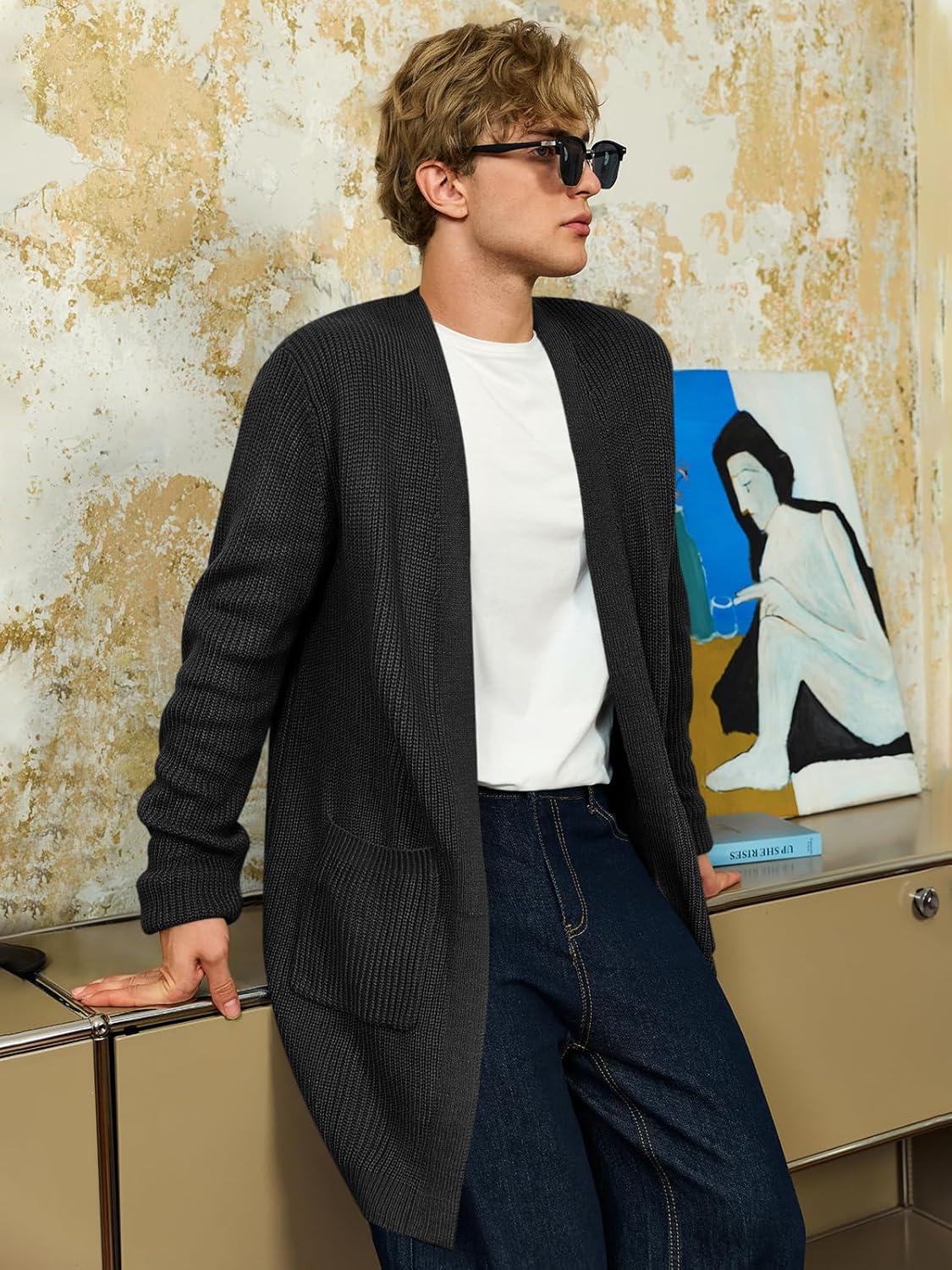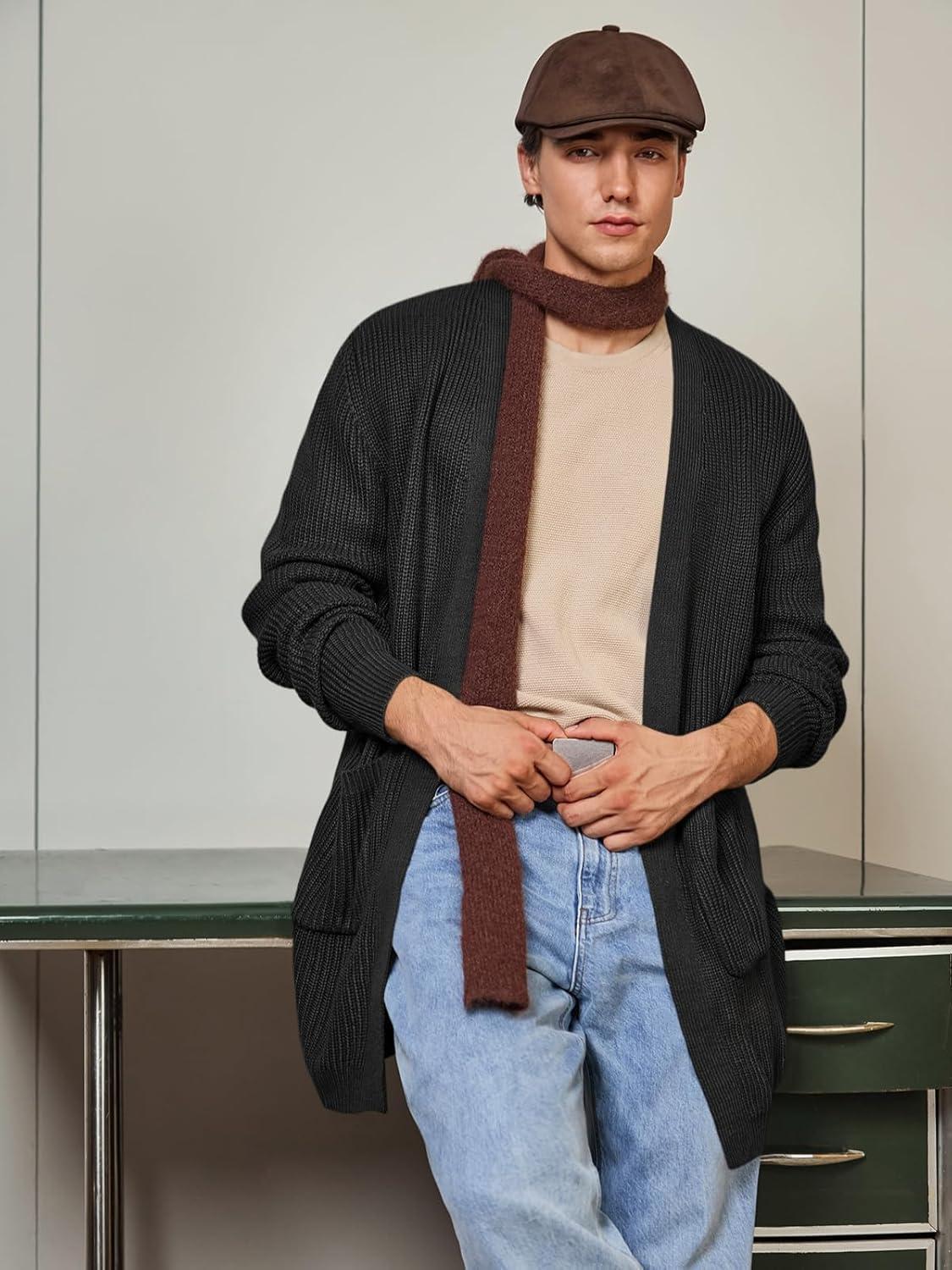 Runcati Mens Cardigan Sweater Casual Cable Knit V Neck Open Front Ribbed Long Winter Sweaters(Black)
