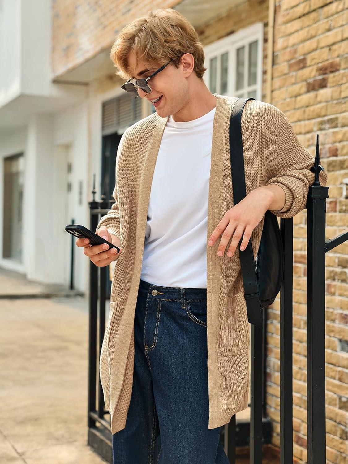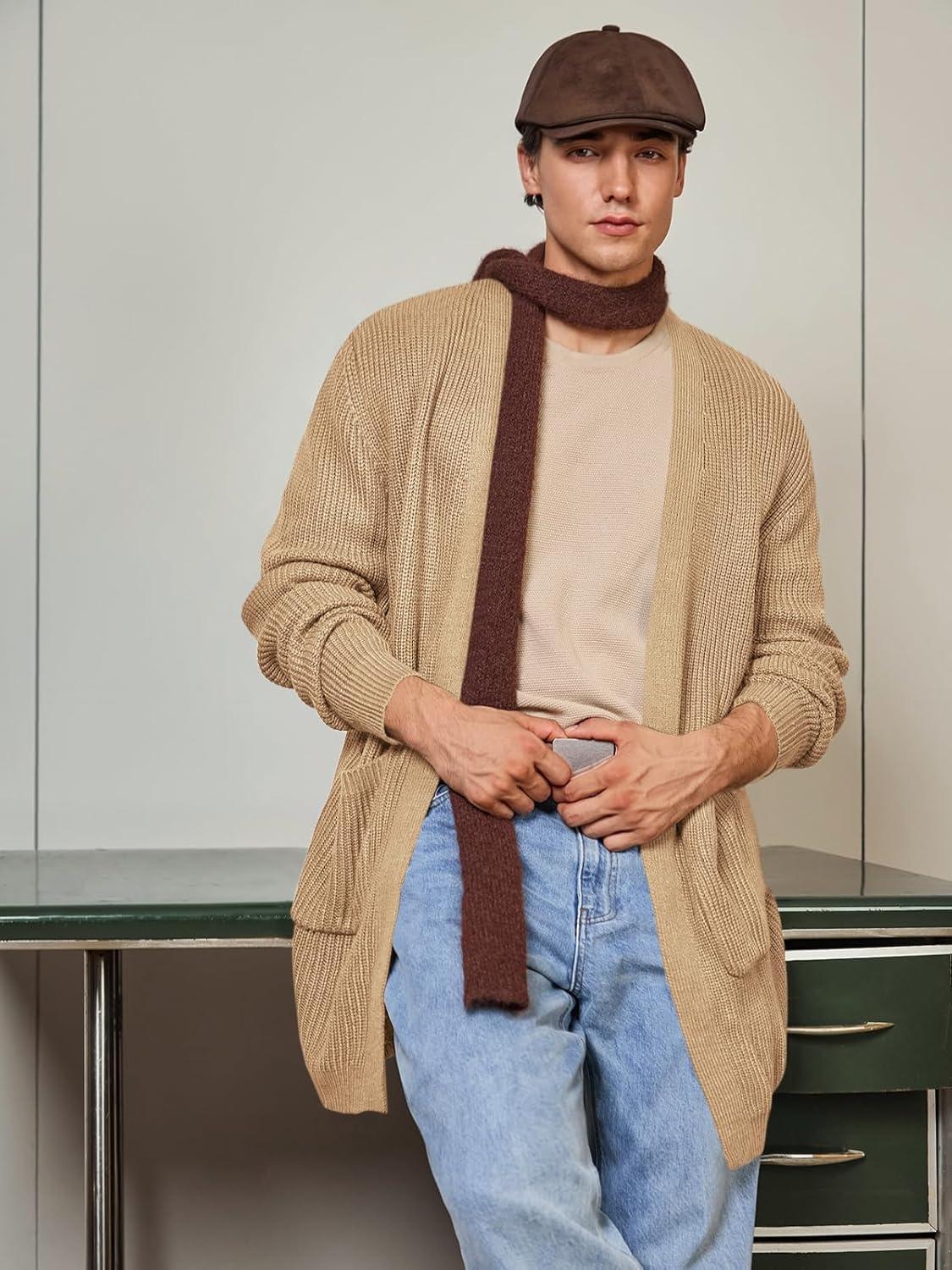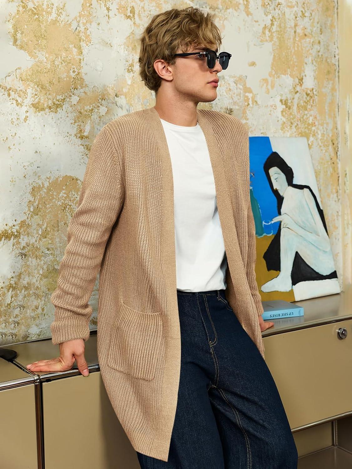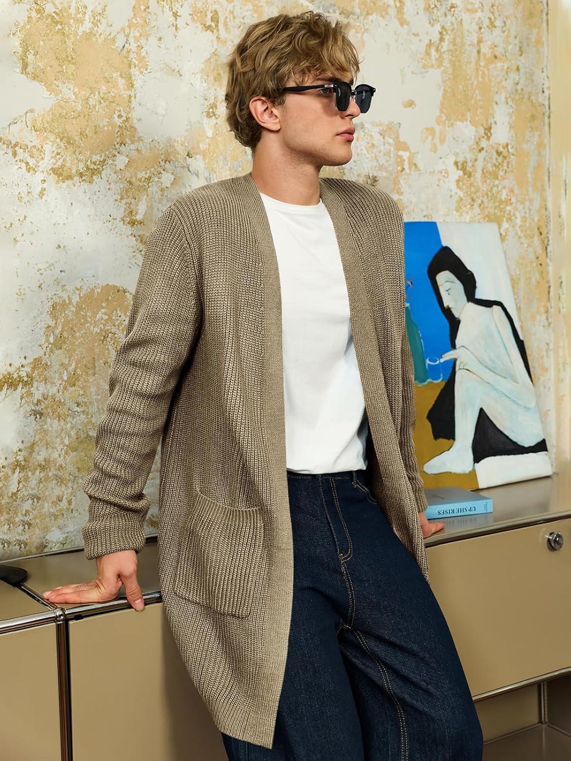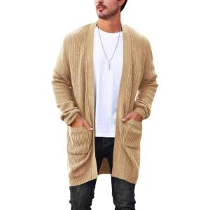 Runcati Mens Cardigan Sweater Casual Cable Knit V Neck Open Front Ribbed Long Winter Sweaters(Khaki)