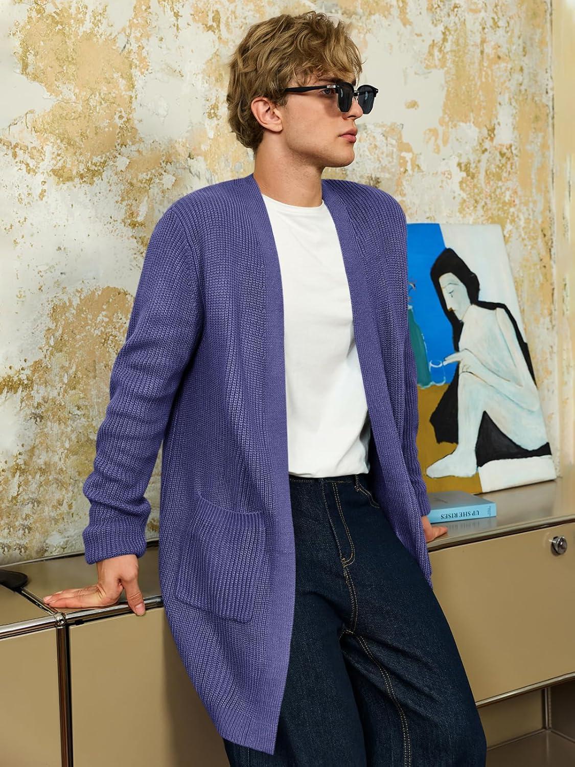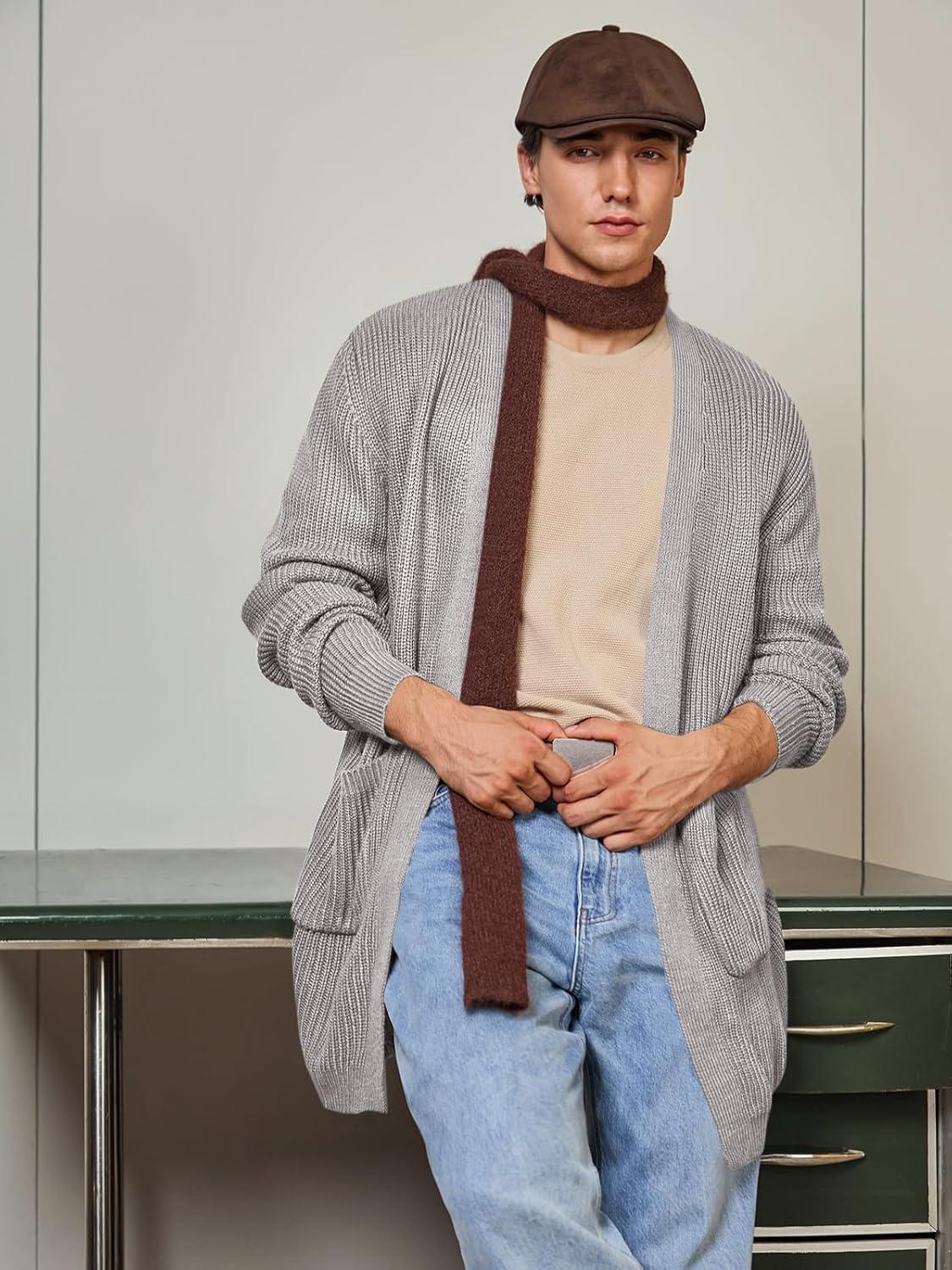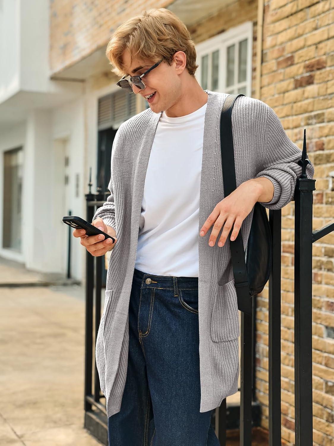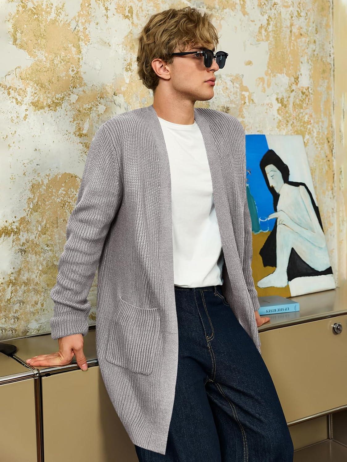 Runcati Mens Cardigan Sweater Casual Cable Knit V Neck Open Front Ribbed Long Winter Sweaters(Gray)